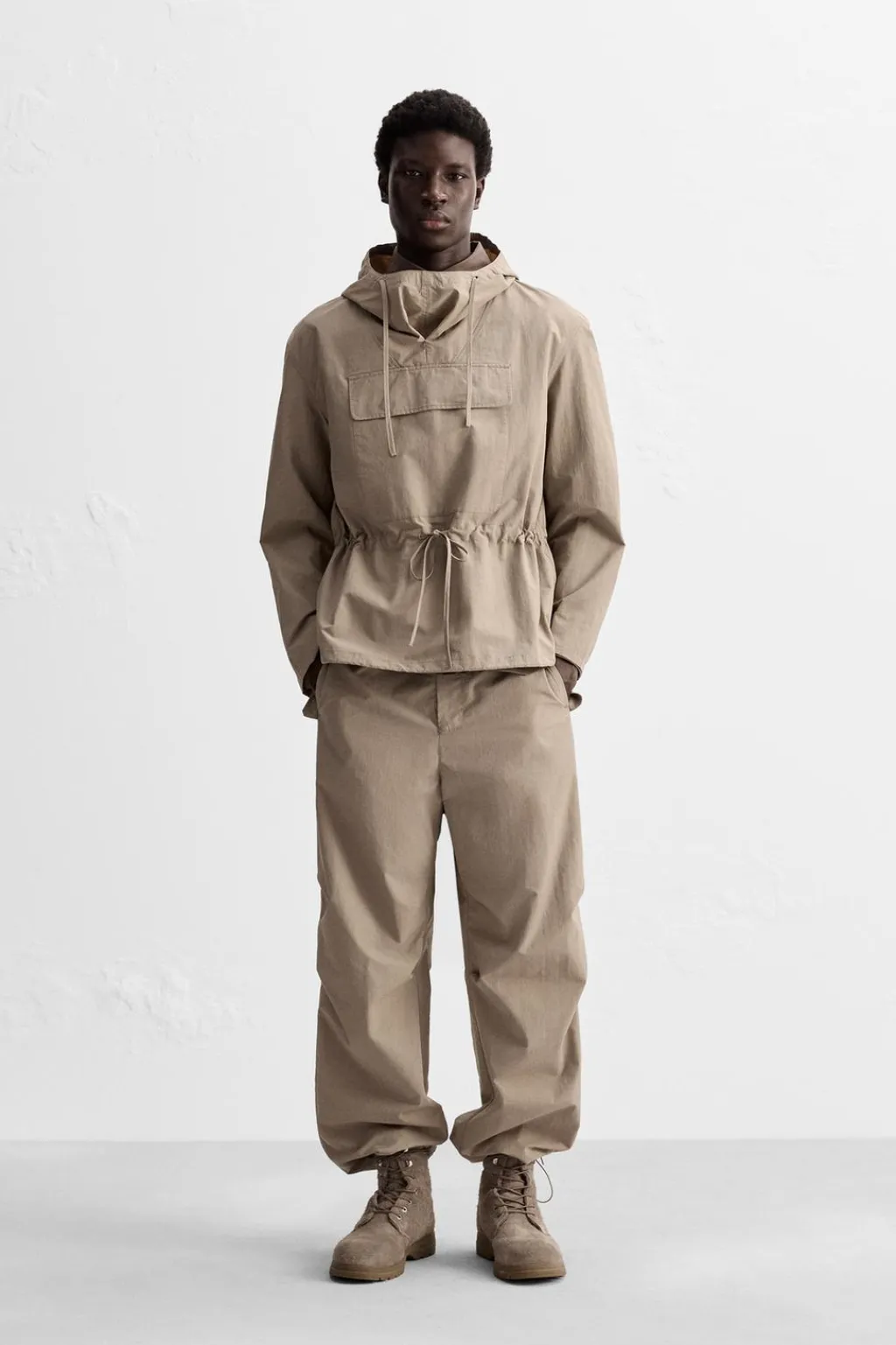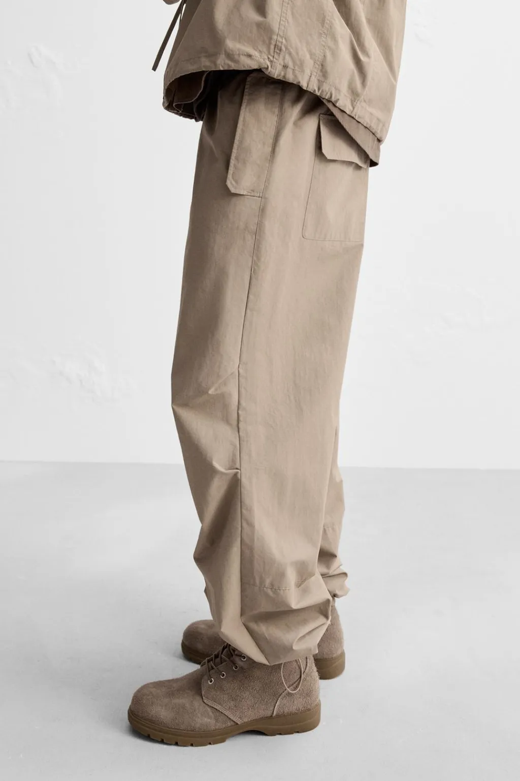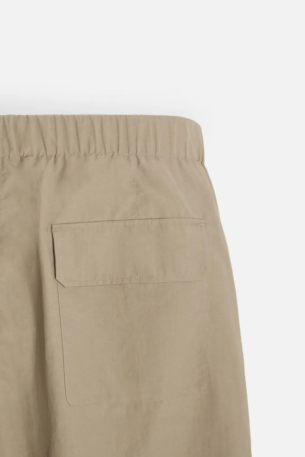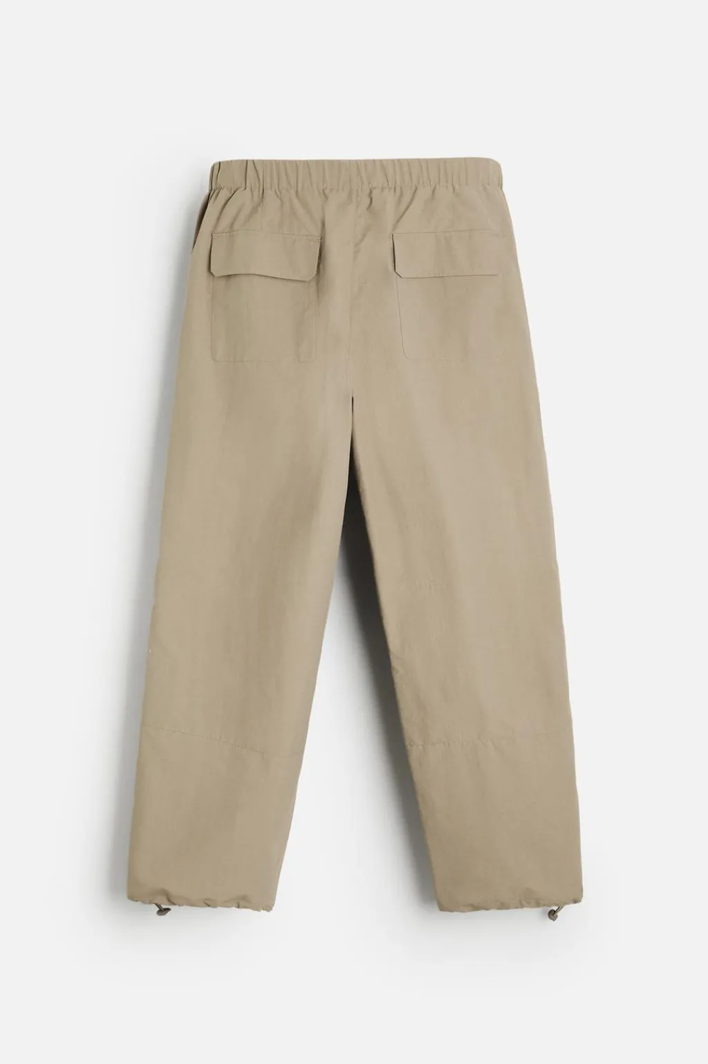 Pantalón relaxed fit confeccionado en tejido técnico ligero water repellent /Grado 1. Cintura elástica ajustable con cordón en interior. Bolsillos frontales de solapa y detalle de bolsillos traseros de plastrón con solapa. Detalle de pliegues en rodillas. Bajo ajustable con elástico. Cierre frontal con cremallera y botón.