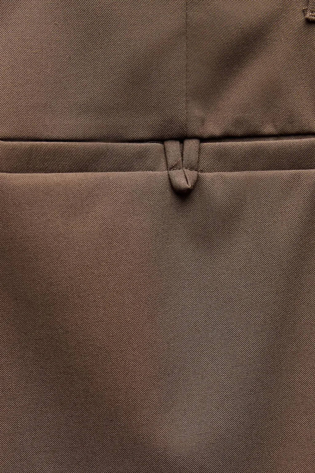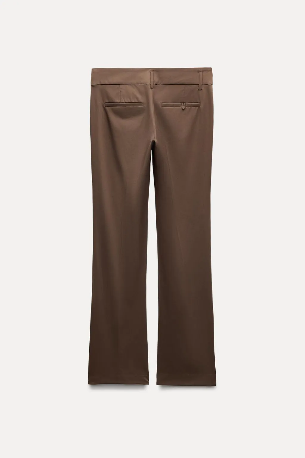 Pantalón de tiro bajo con cintura ancha. Bolsillos laterales y falsos bolsillos de vivo en espalda. Cierre frontal con cremallera, botón interior y ganchos metálicos.