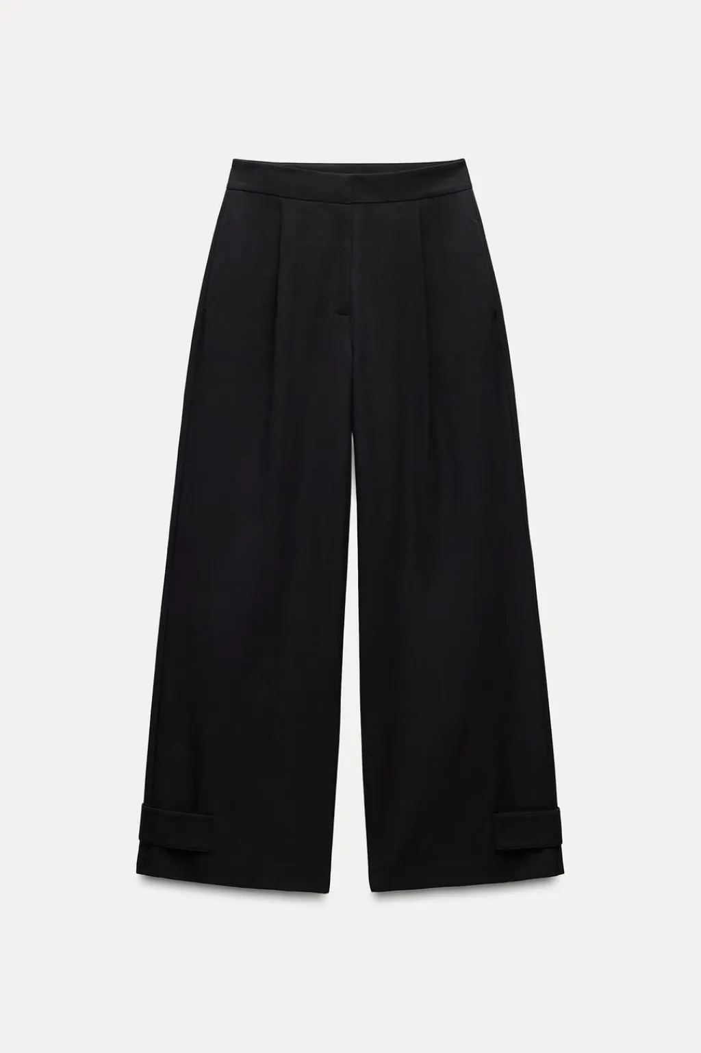 Pantalón confeccionado en tejido efecto técnico de tiro alto con pinzas. Bolsillos laterales y detalle de solapas en espalda. Bajo con trabillas. Cierre frontal con cremallera, botón interior y gancho metálico.