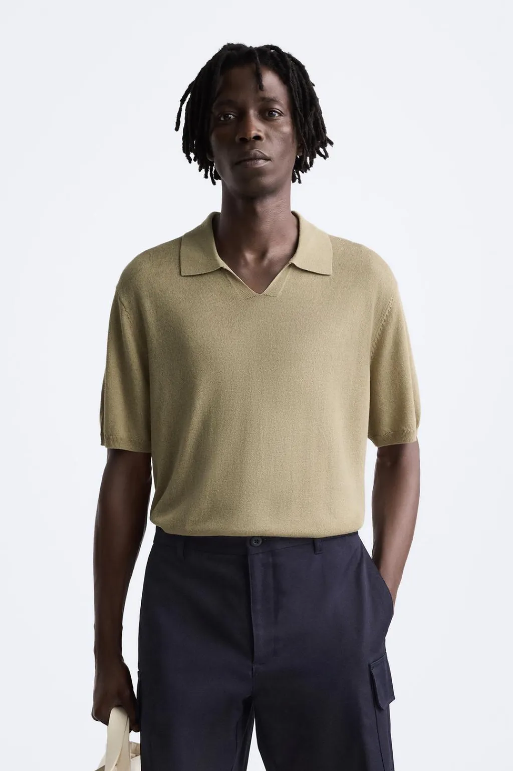 Polo de punto tejido en hilatura con mezcla de lyocell y lino. Cuello solapa con abertura frontal y manga corta. Acabados en rib.