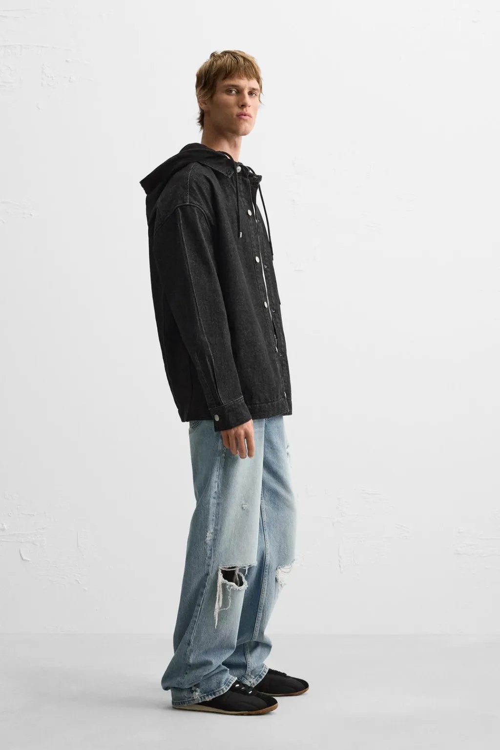 Sobrecamisa relaxed fit confeccionada en tejido denim. Cuello solapa con capucha combinada a contraste y manga larga acabada en puño con botón. Bolsillo plastrón en pecho y laterales en cadera. Cierre frontal de botonadura.