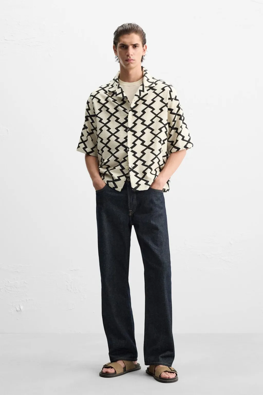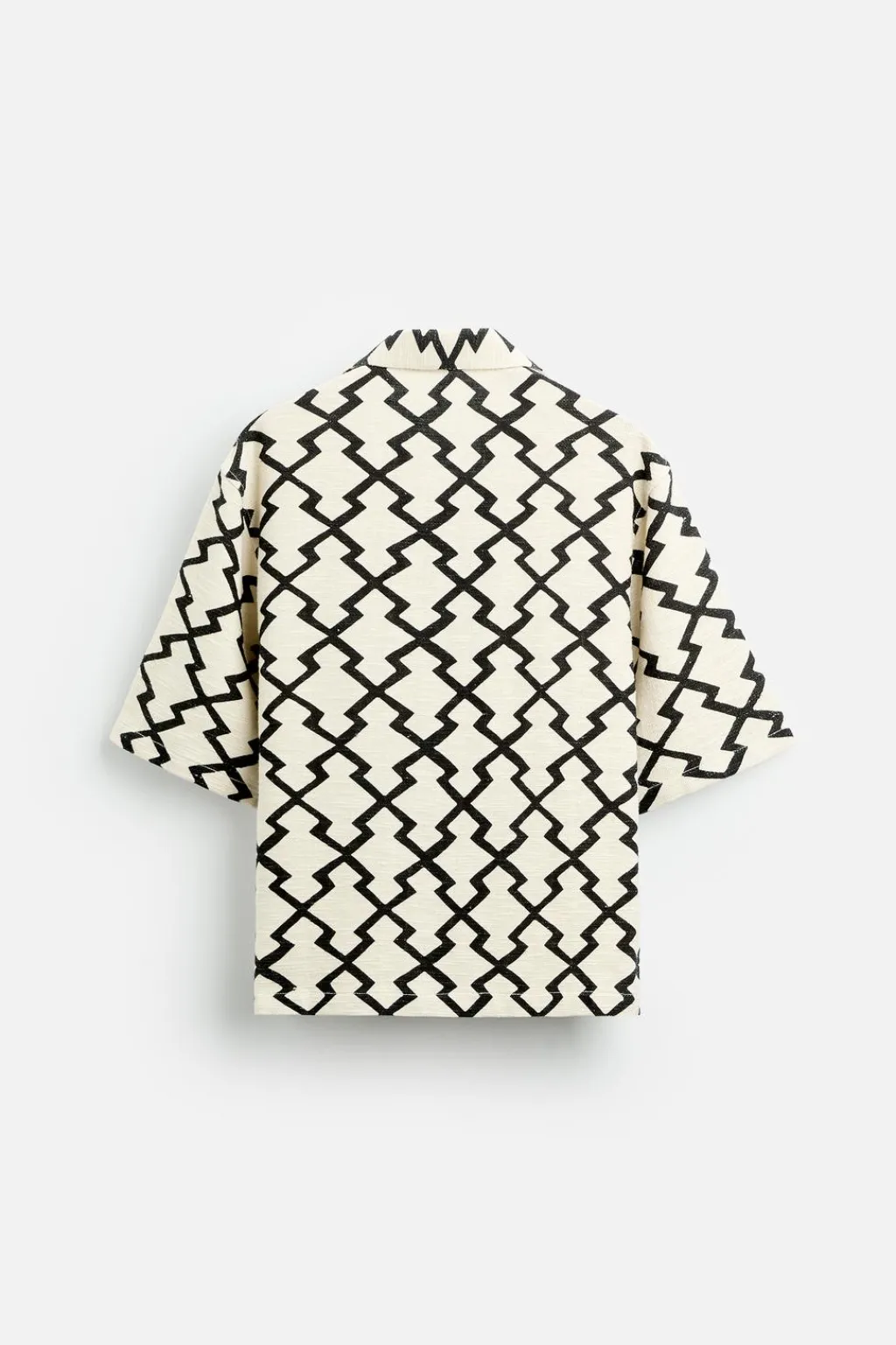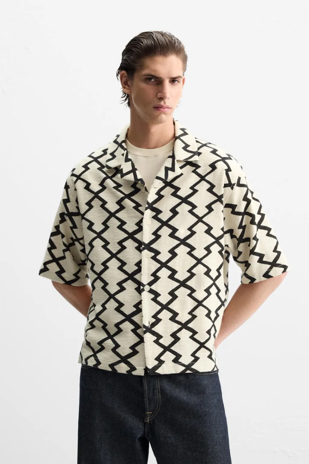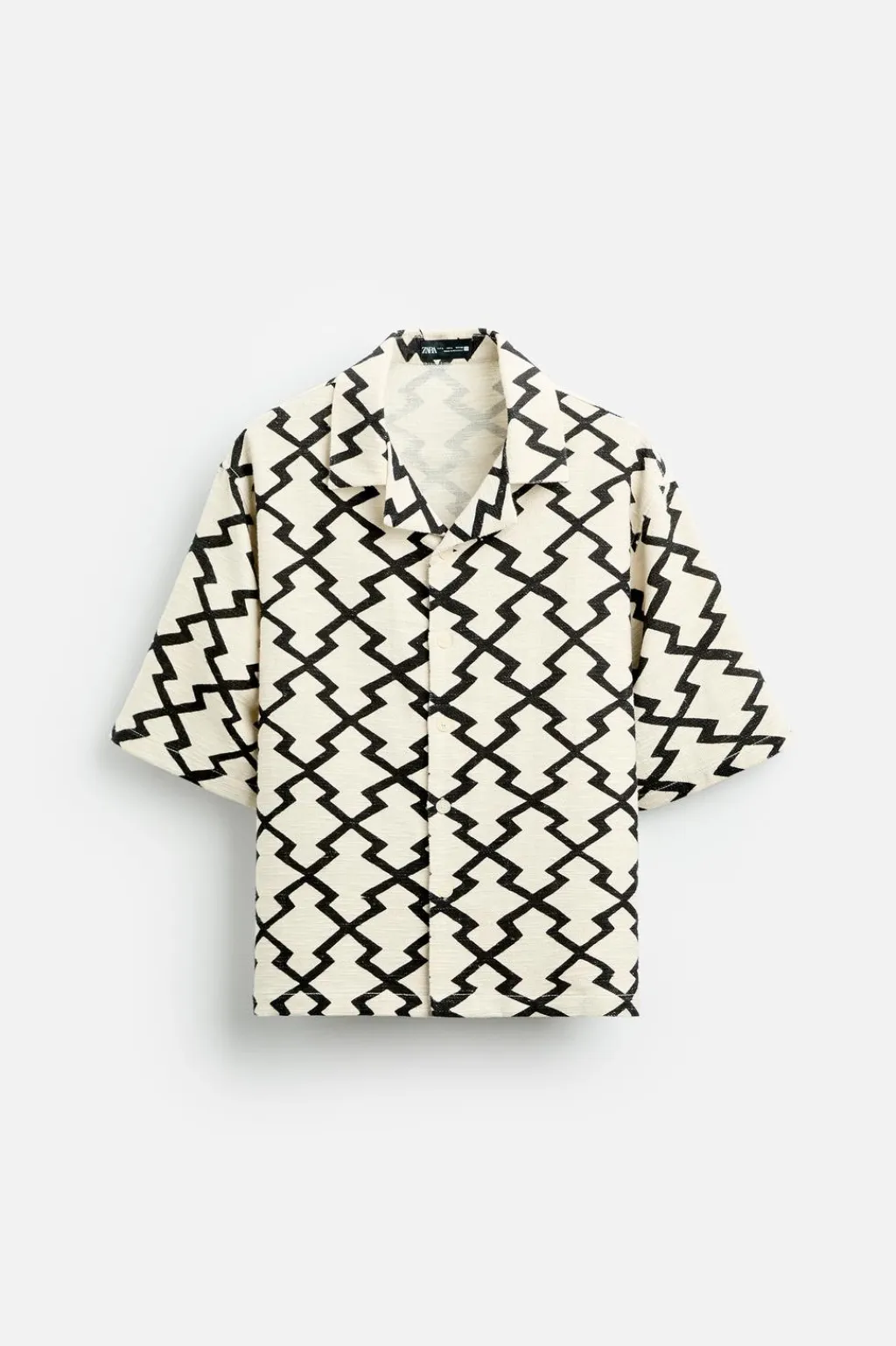 Sobrecamisa cropped fit confeccionada en tejido de algodón con estructura rústica. Cuello bowling y manga corta. Bajo con aberturas laterales. Cierre frontal de botonadura.