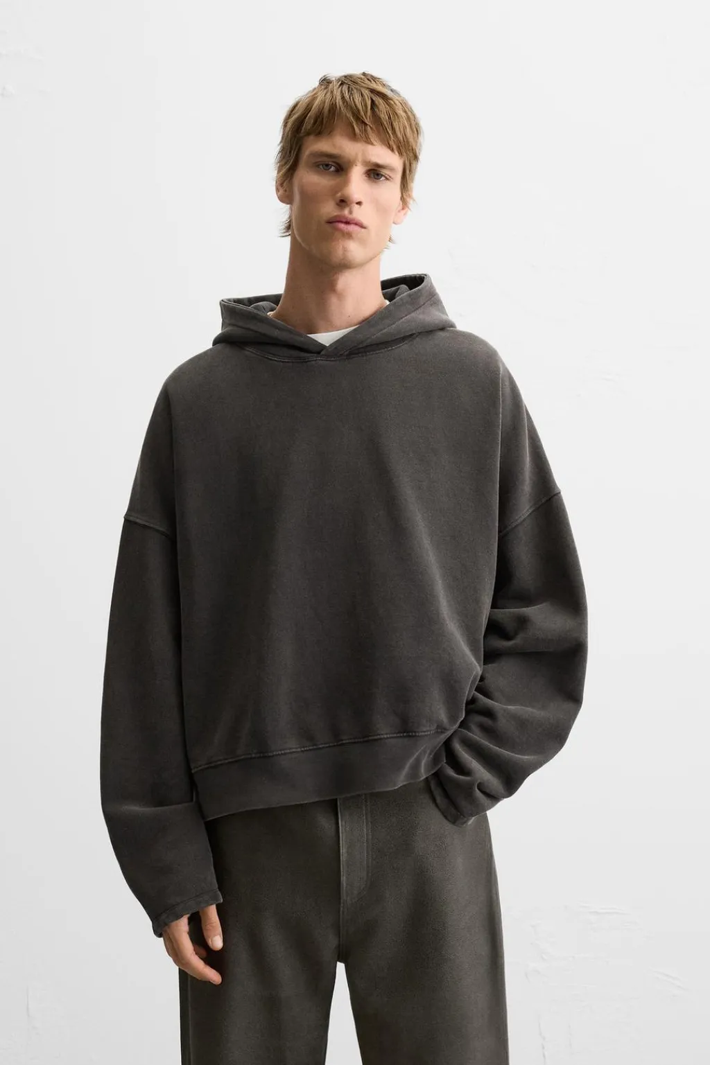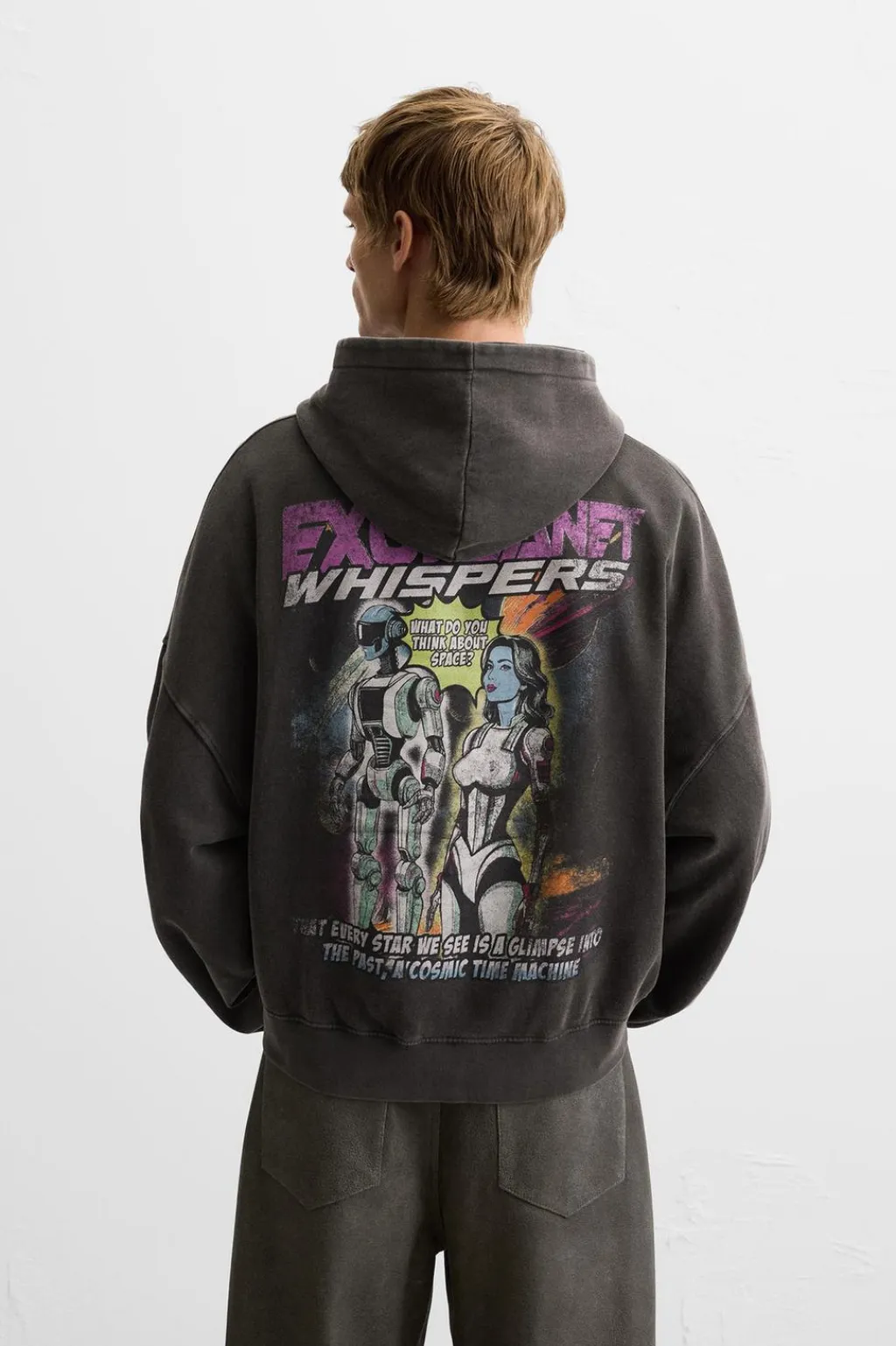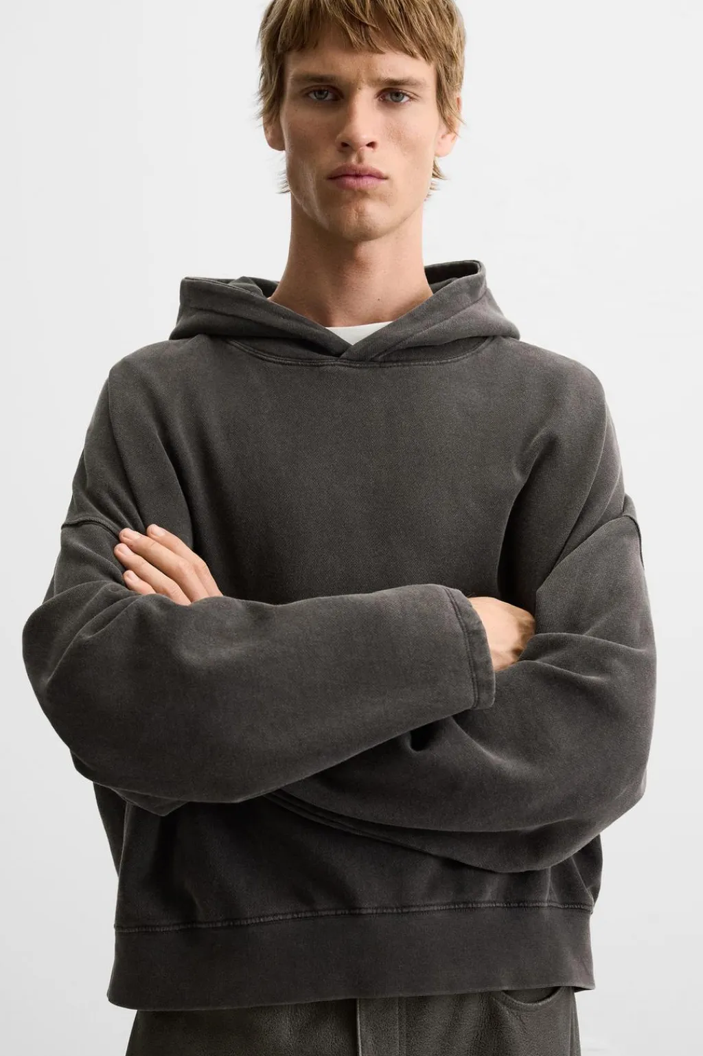 Sudadera cropped fit confeccionada en tejido de algodón con el interior perchado. Cuello con capucha y manga larga. Estampado combinado a contraste en espalda. Efecto lavado. Bajo acabado en rib.