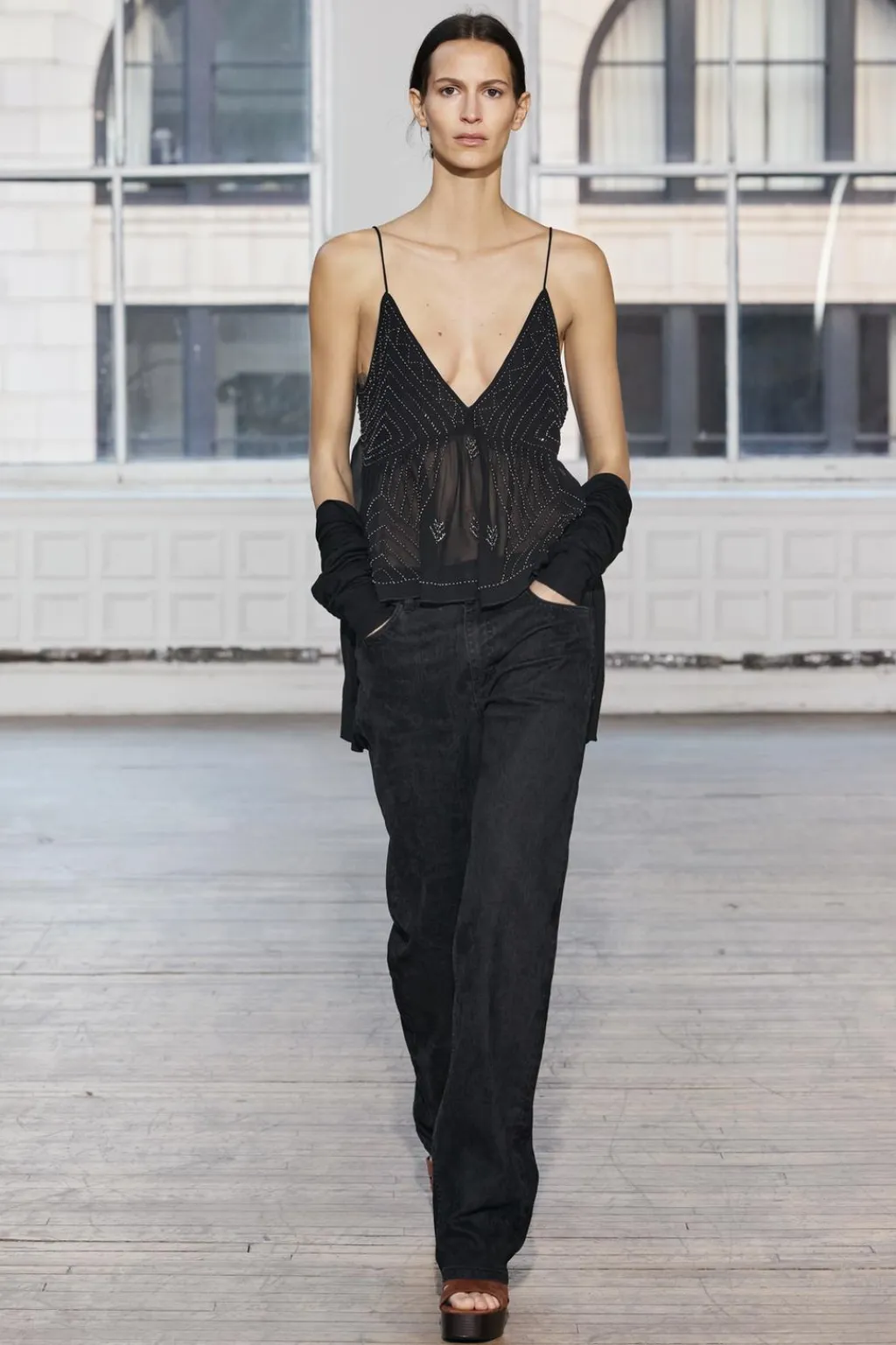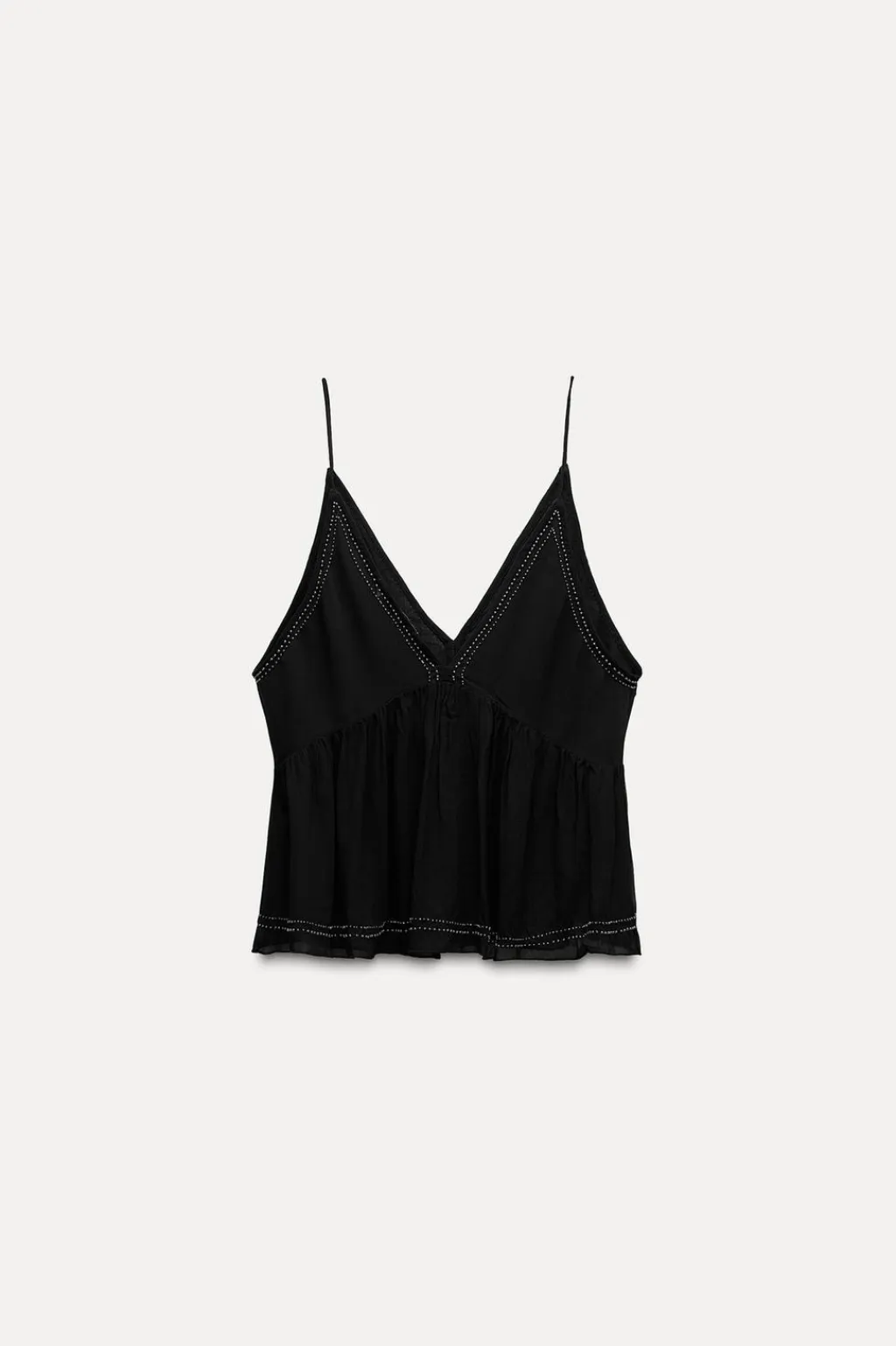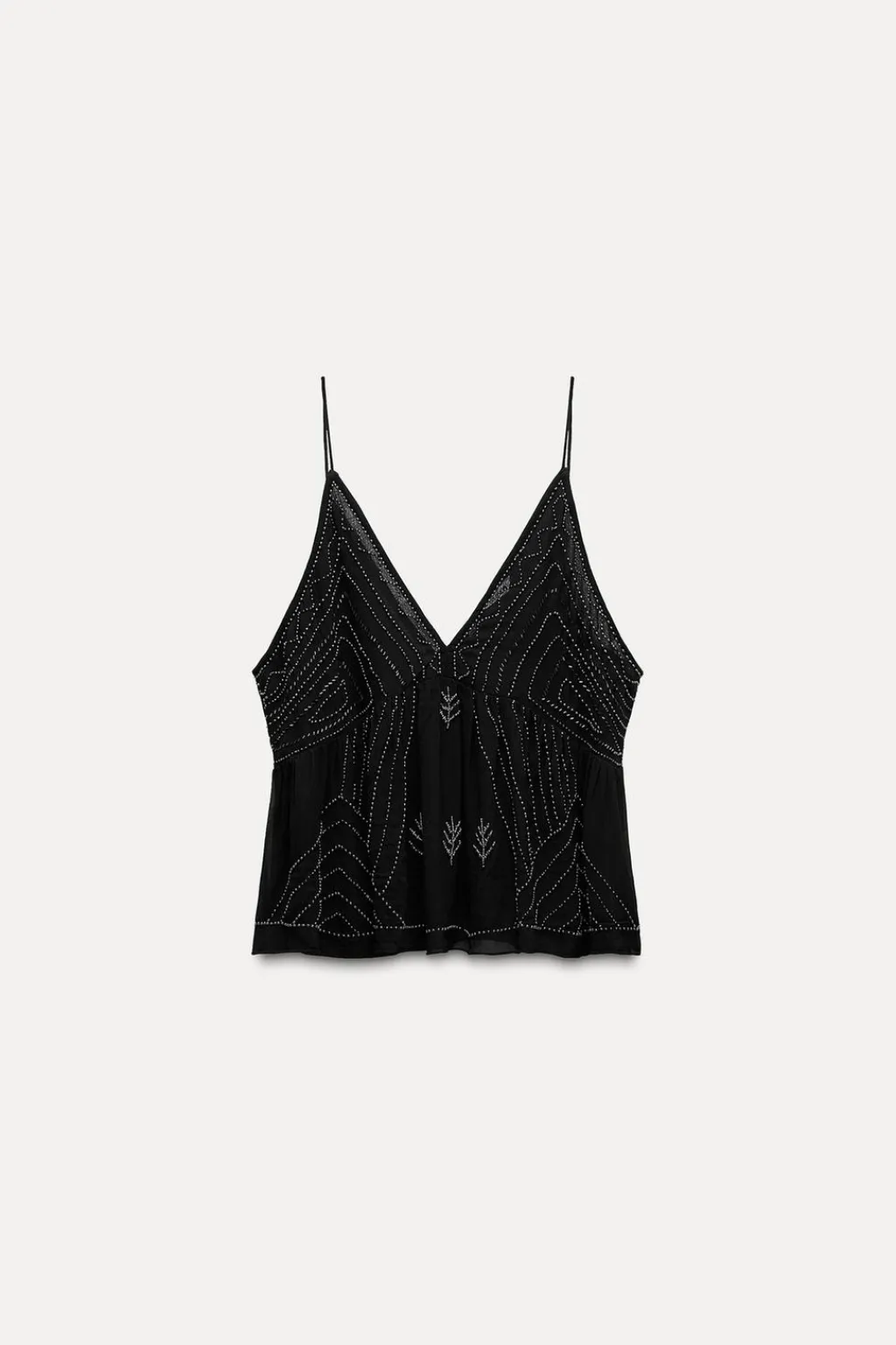 Top de escote pico y tirantes finos. Detalle de bordados con aplicación de abalorios.