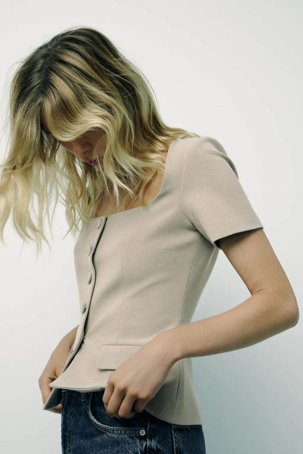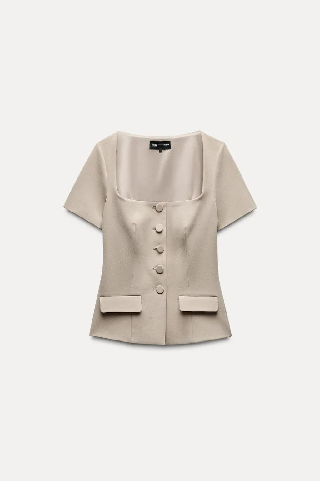Top de escote cuadrado y manga corta. falsos bolsillos con solapas en delantero. Forro interior combinado. Cierre frontal con botones forrados.