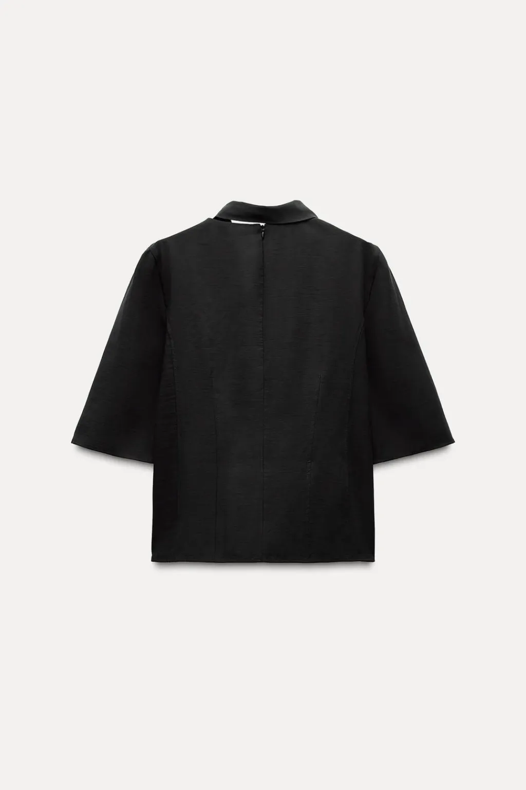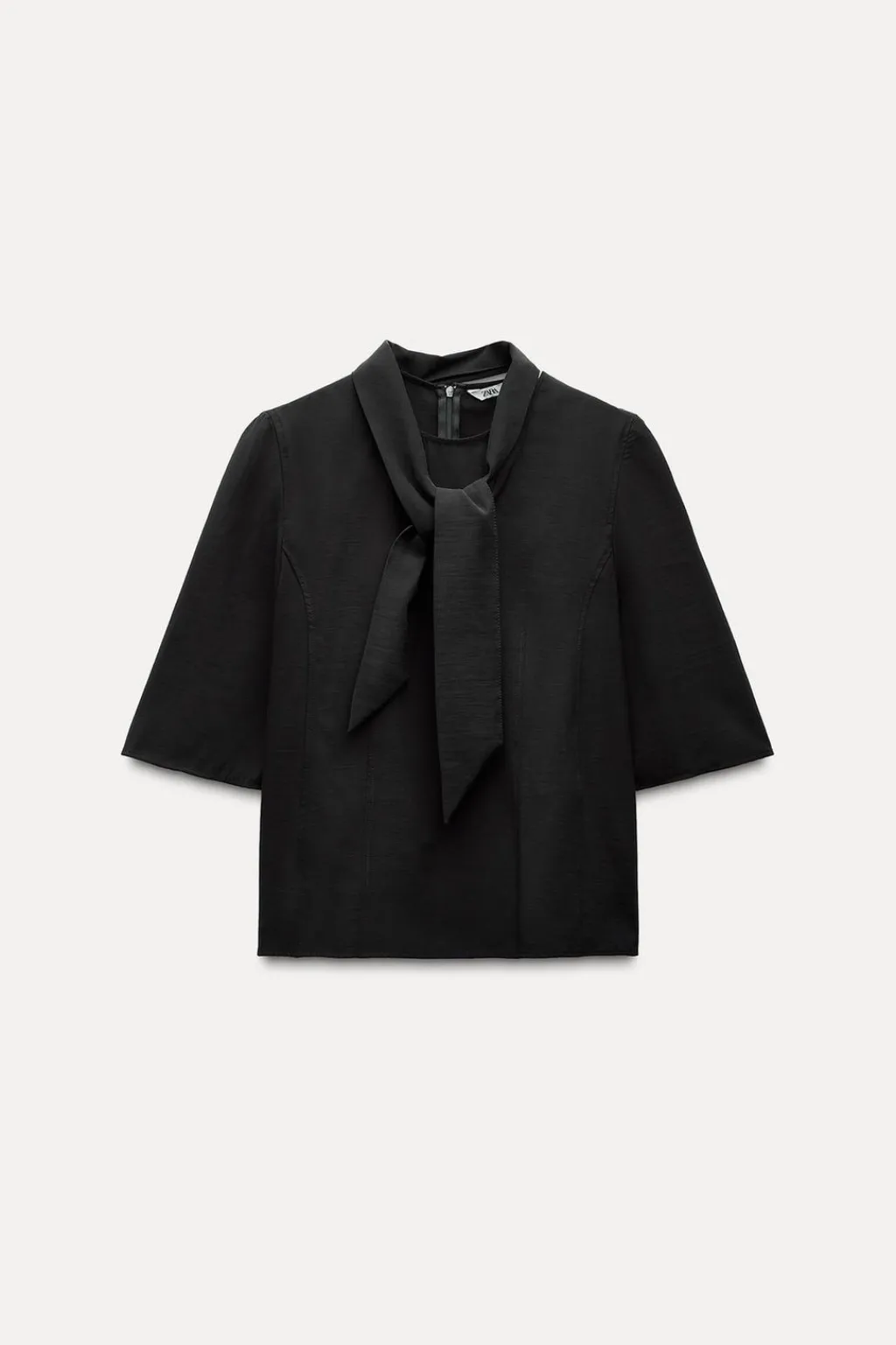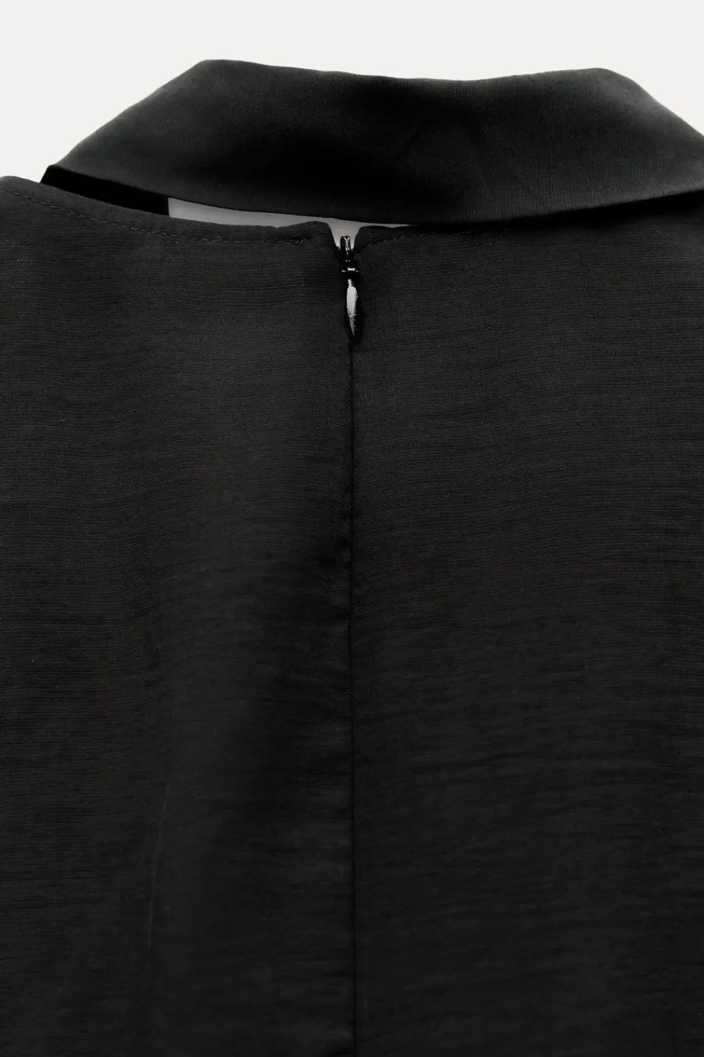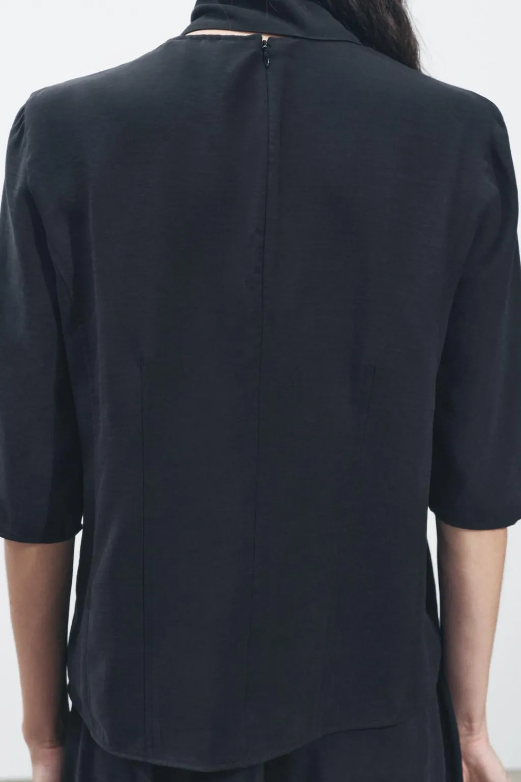 Top confeccionado en hilatura con mezcla de viscosa. Cuello redondo con pañuelo en mismo tejido. Manga por debajo del codo. Cierre en espalda con cremallera oculta en costura.