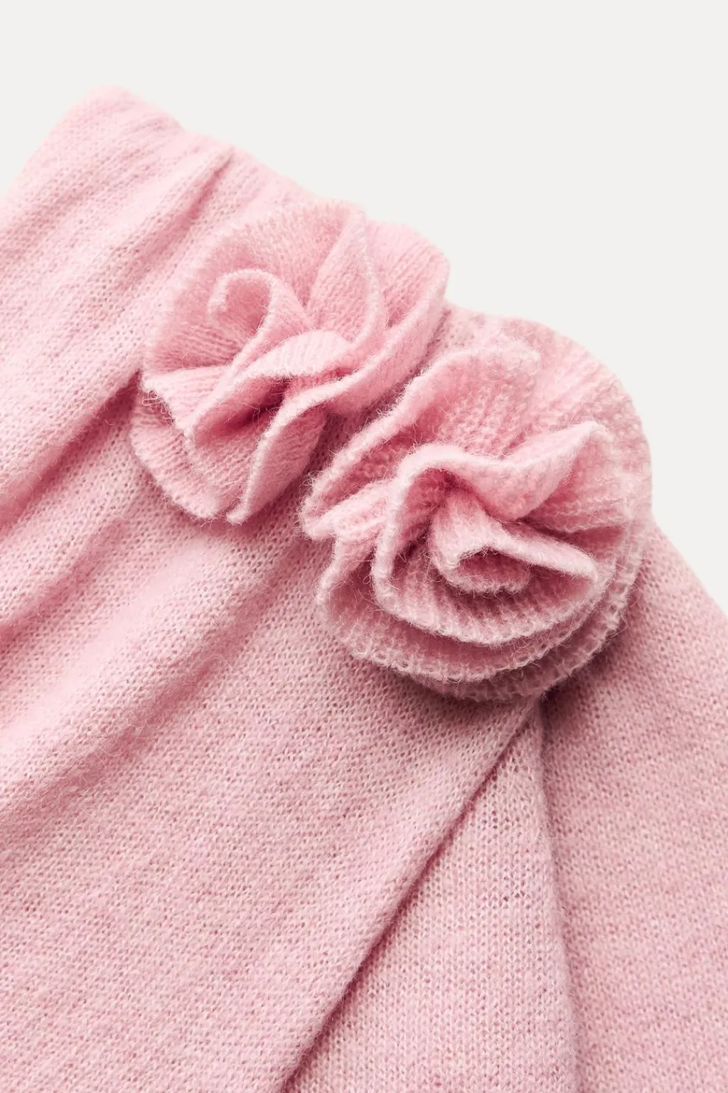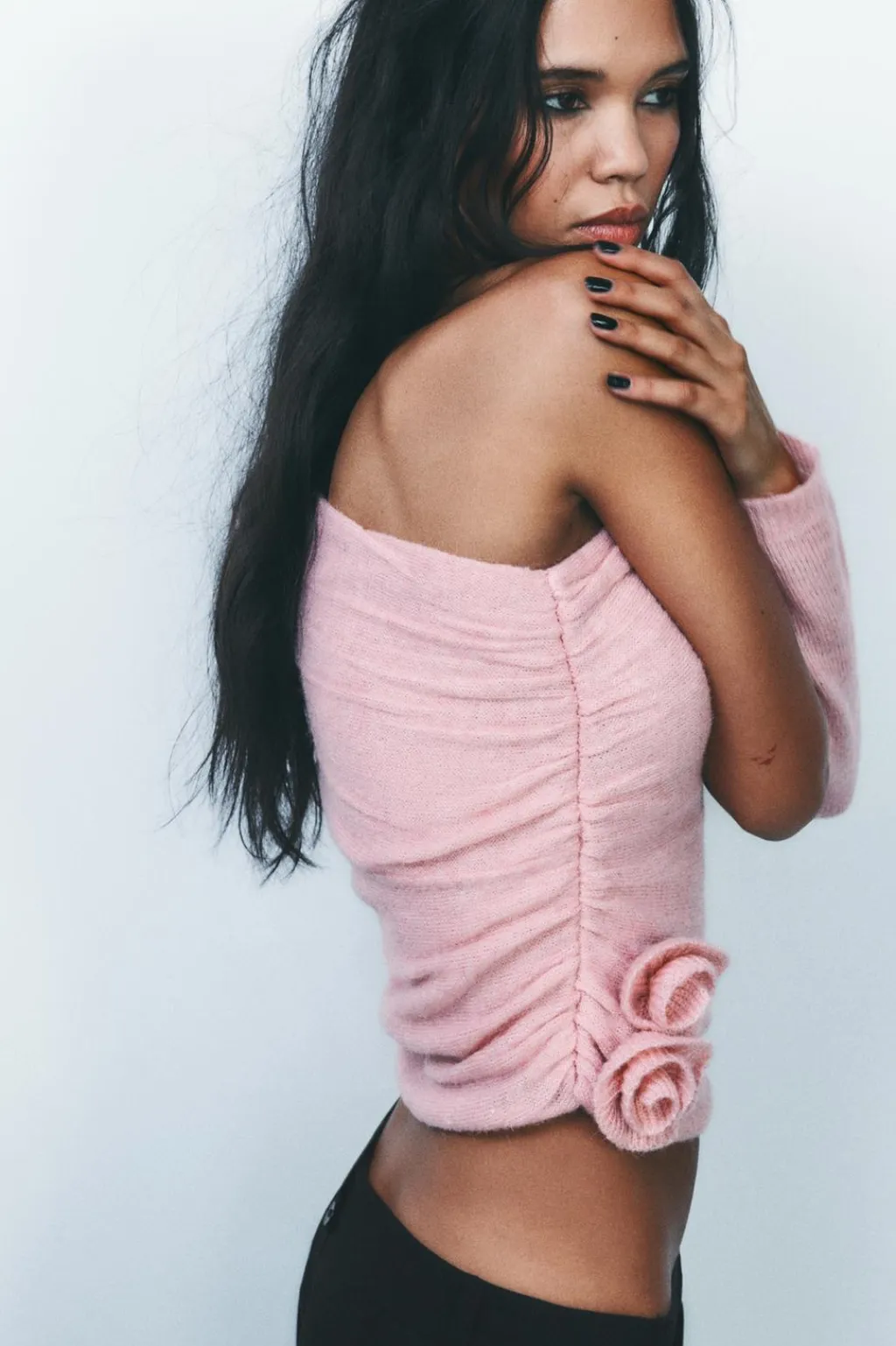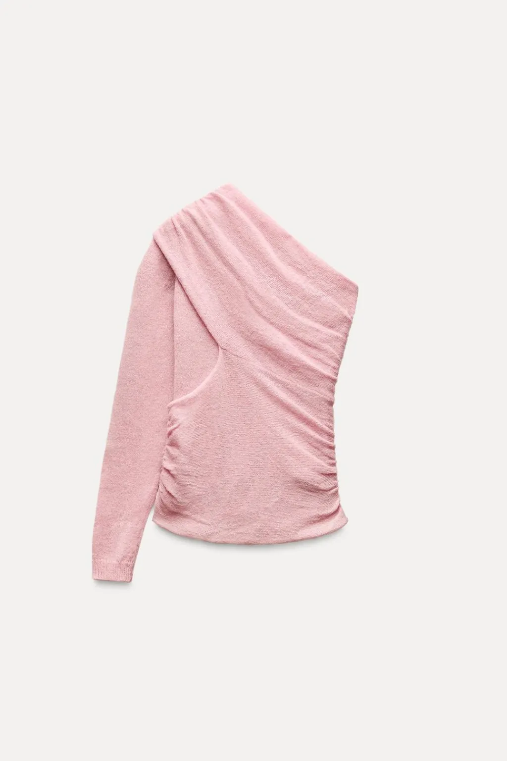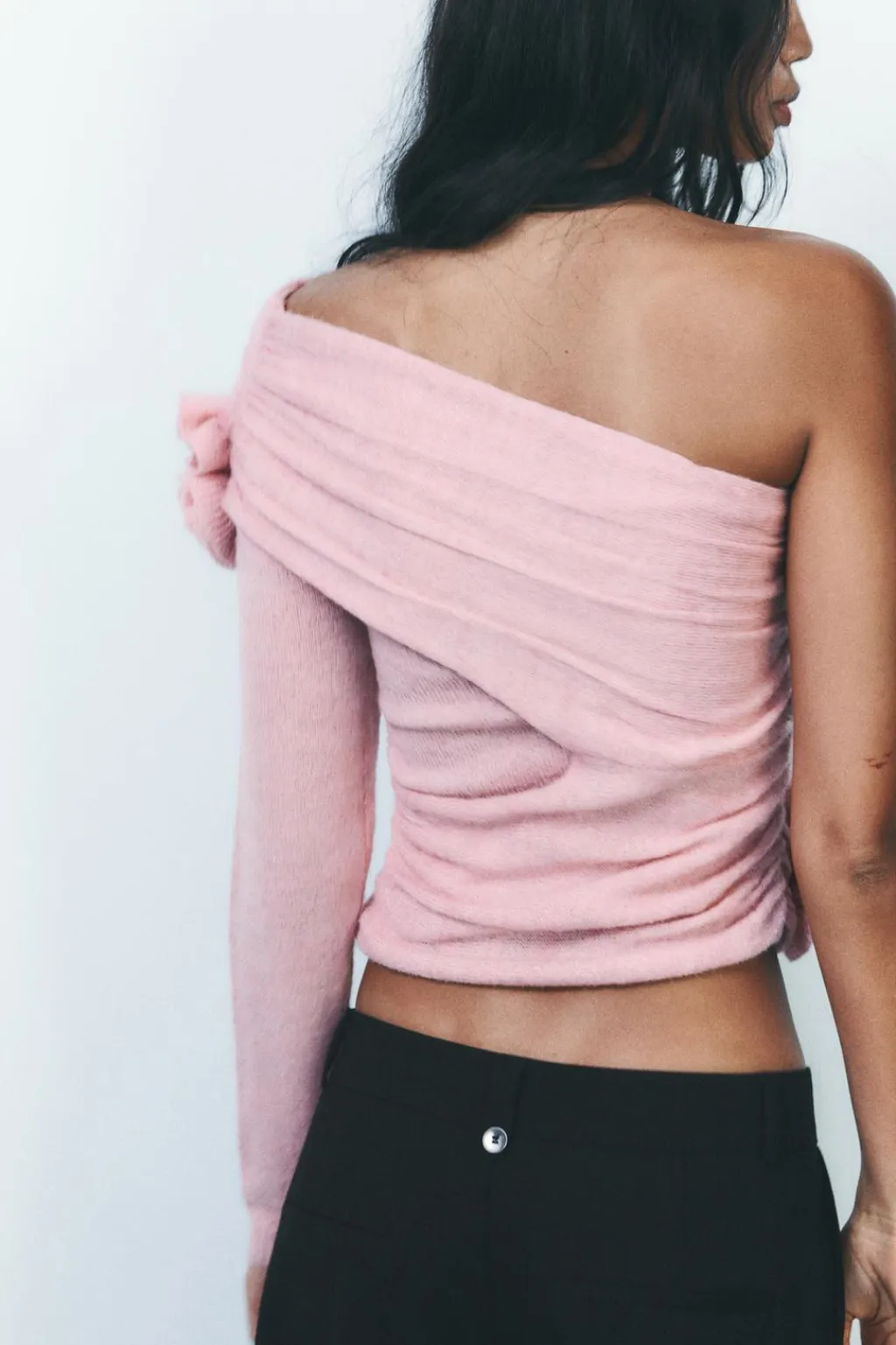 Top de escote y manga larga asimétrica. Detalle aplicación de tejido en estructura en forma de flor y frunces laterales.