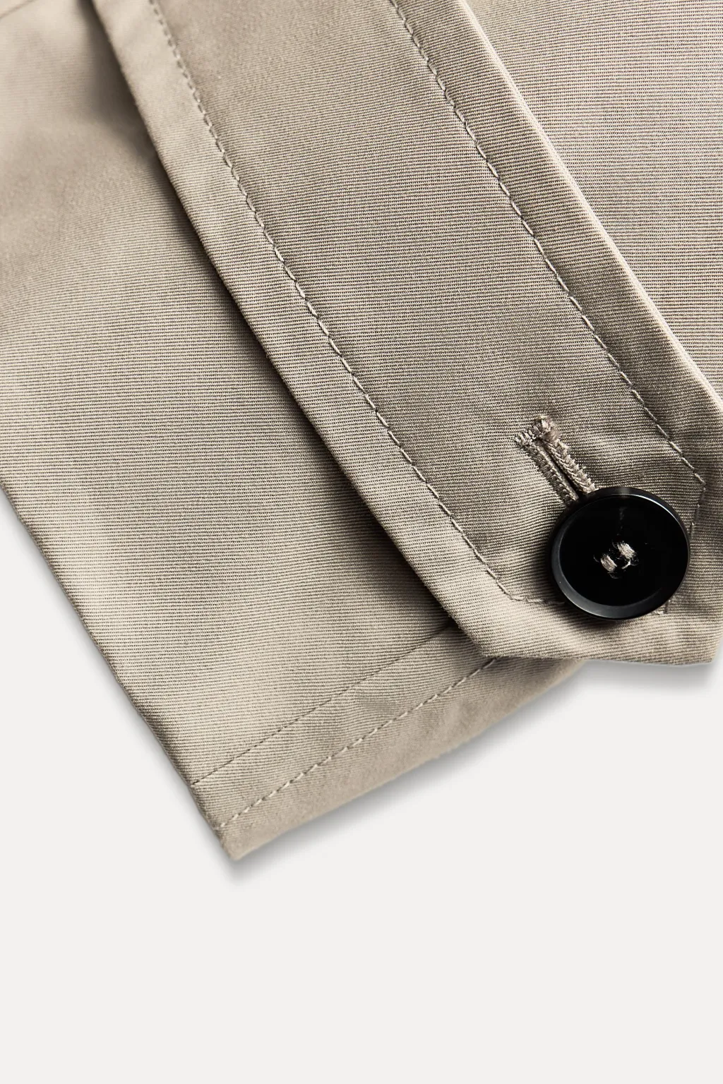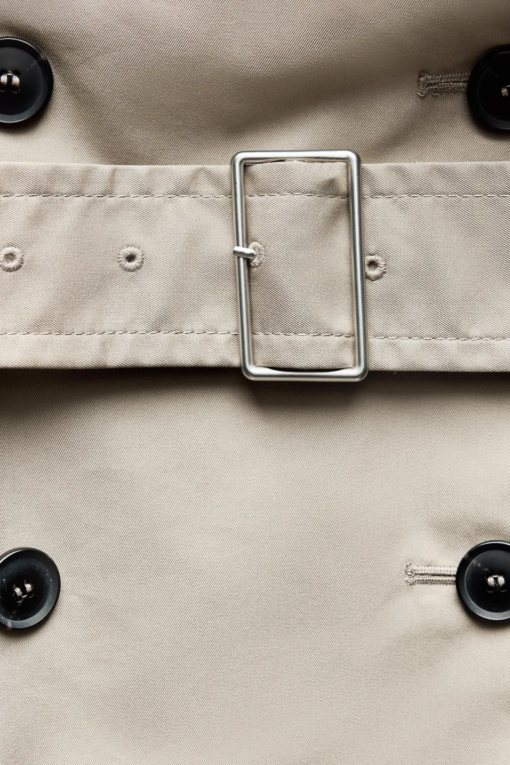 Trench corto confeccionado en hilatura con mezcla de algodón. Cuello solapa de muescas y manga larga acabada en trabilla y botón. Bolsillos delanteros. Cinturón en mismo tejido ajustable con hebilla metálica. Cierre frontal cruzado con botones.