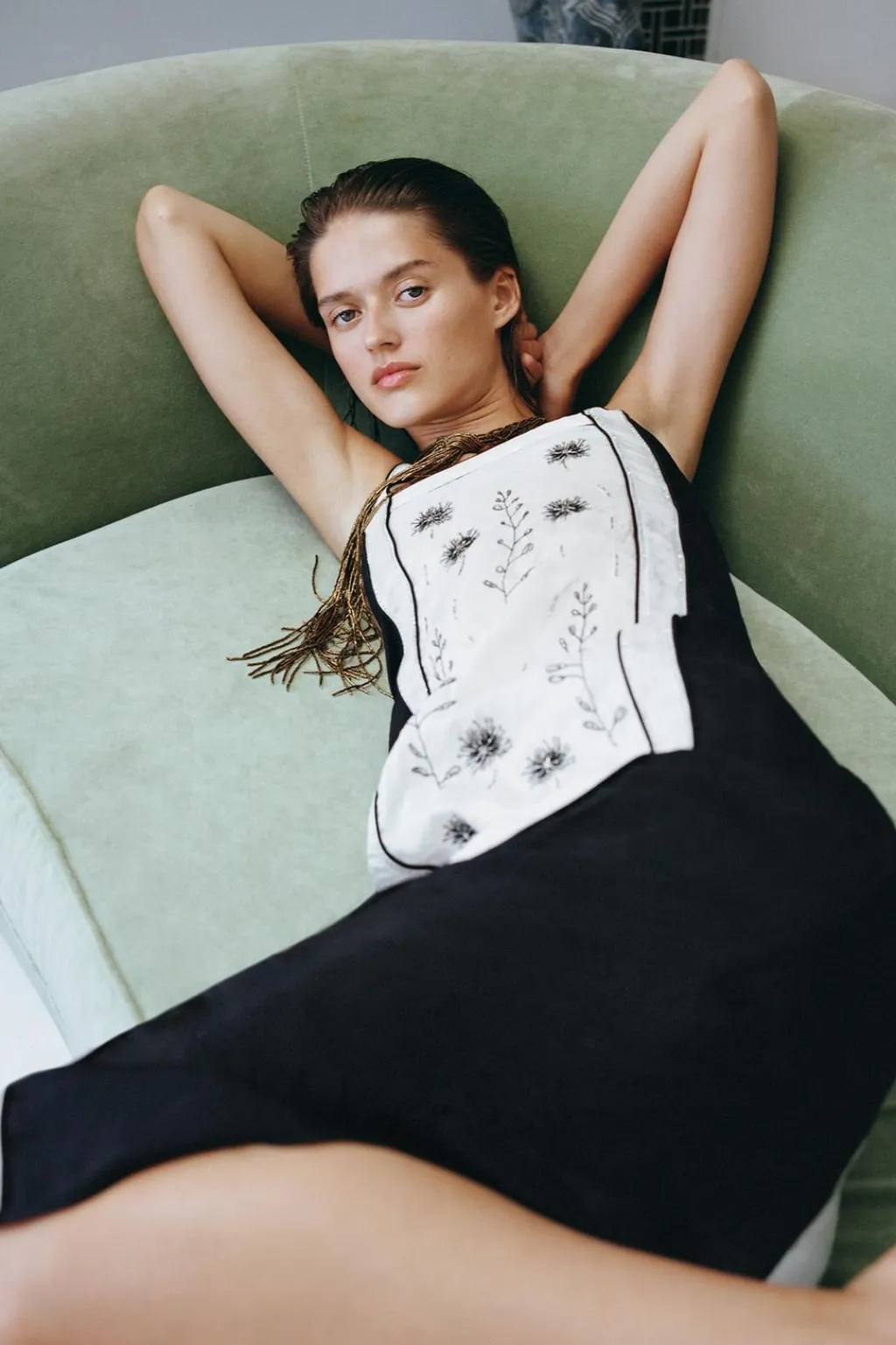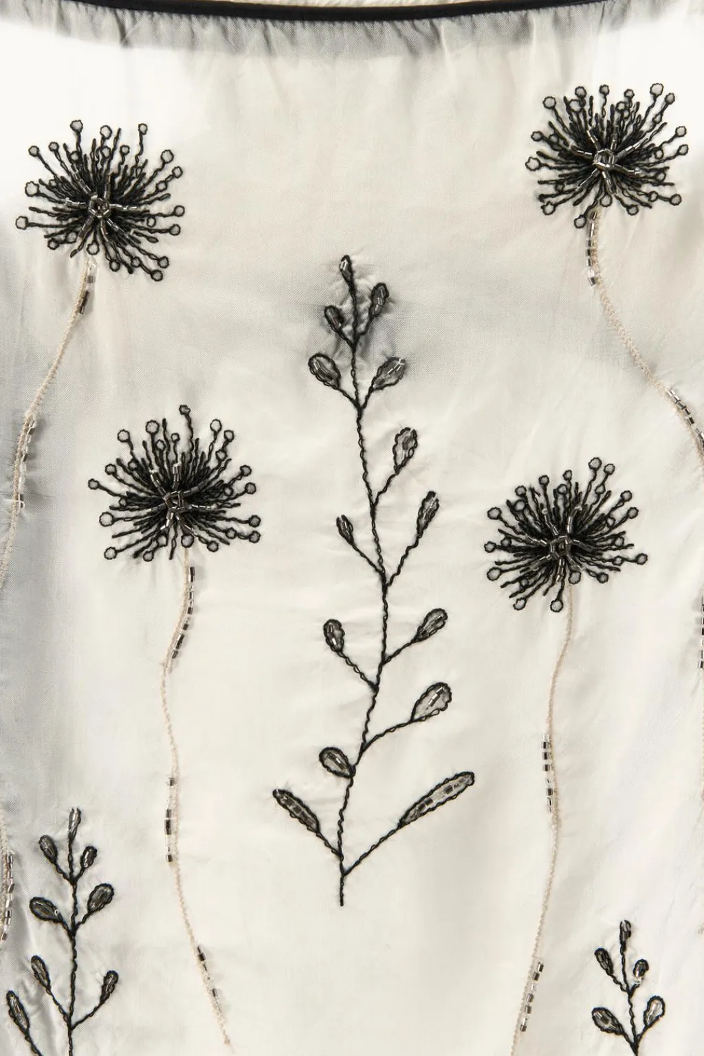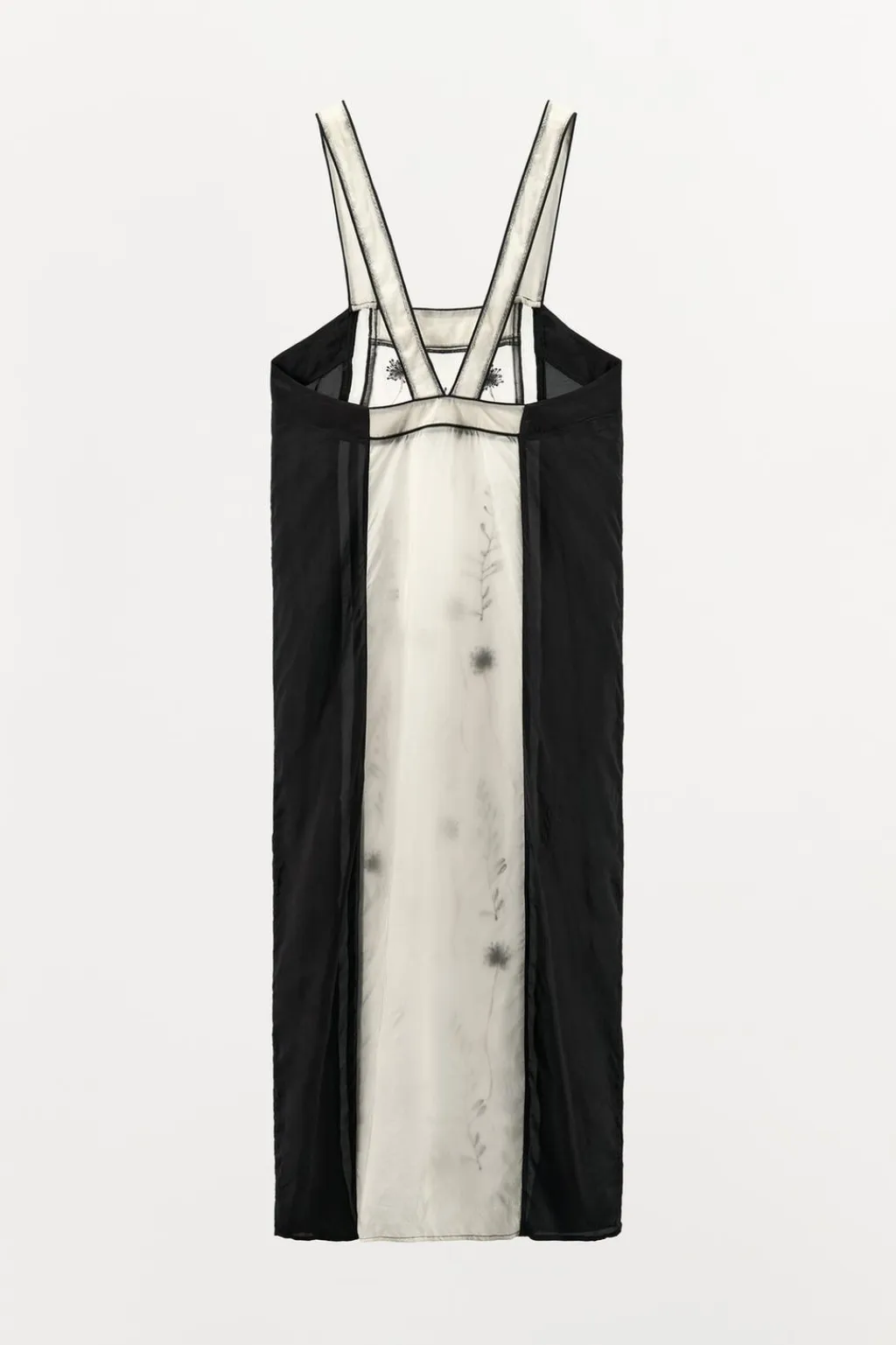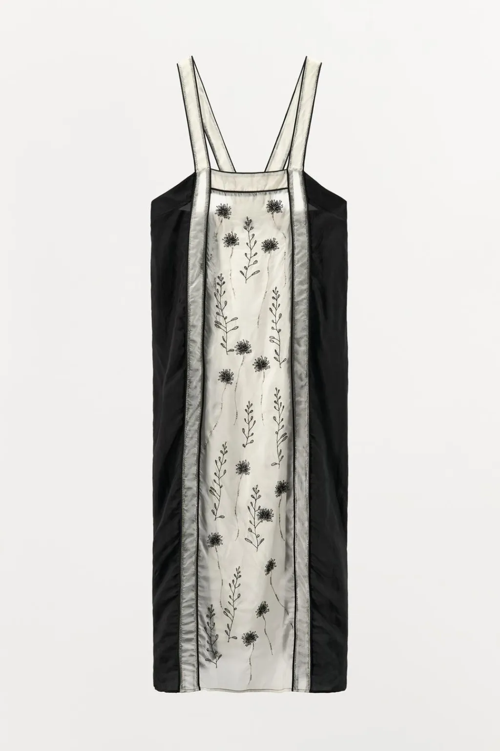 Vestido midi de escote recto y tirantes anchos. Detalle de bordados florales con aplicación de abalorios combinados a contraste.