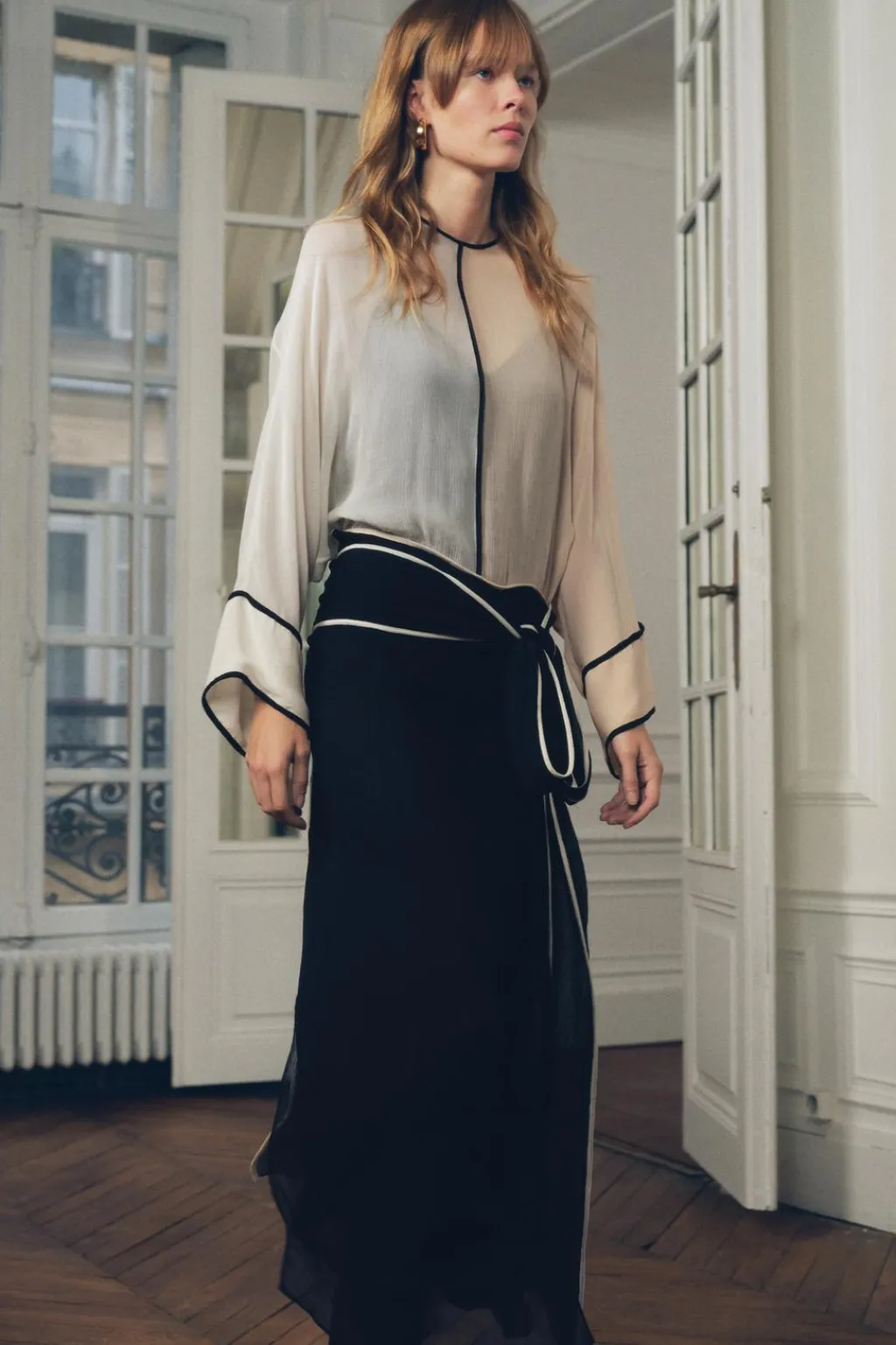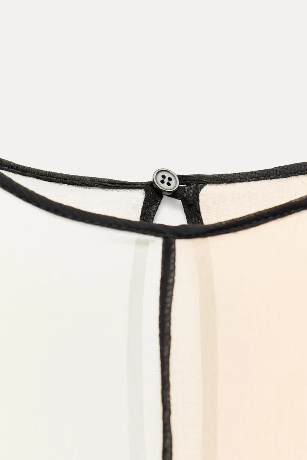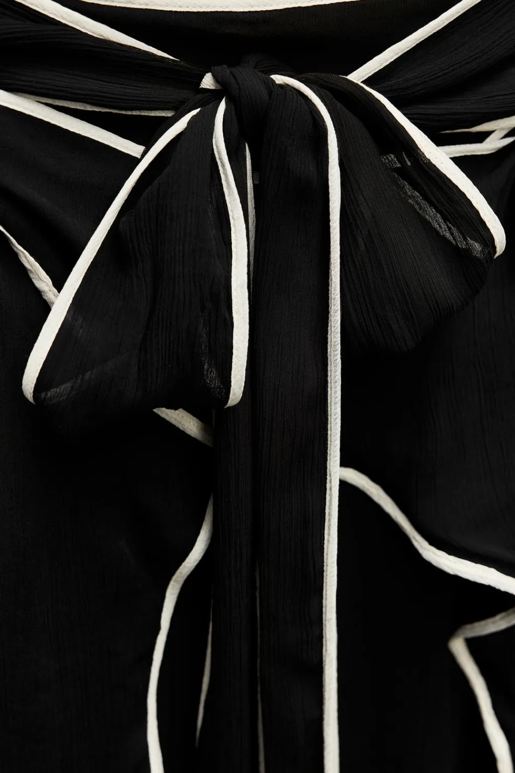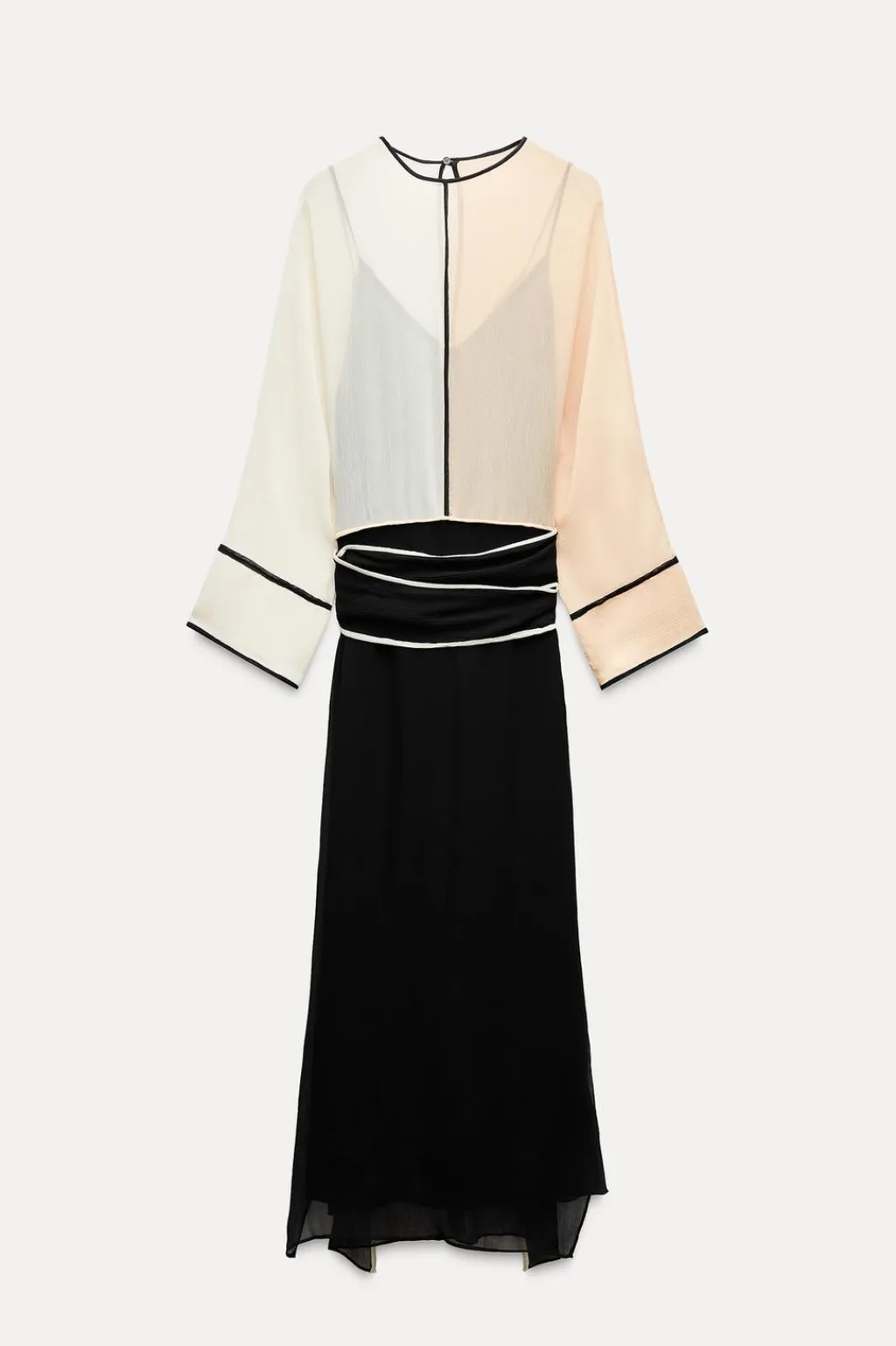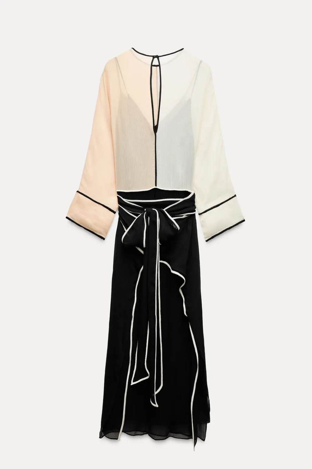 Vestido midi semitransparente de cuello redondo y manga larga amplia. Forro interior combinado de escote pico y tirantes finos. Cinturón lazada en mismo tejido. Detalle de vivos combinados. Cierre en espalda con abertura y botón.