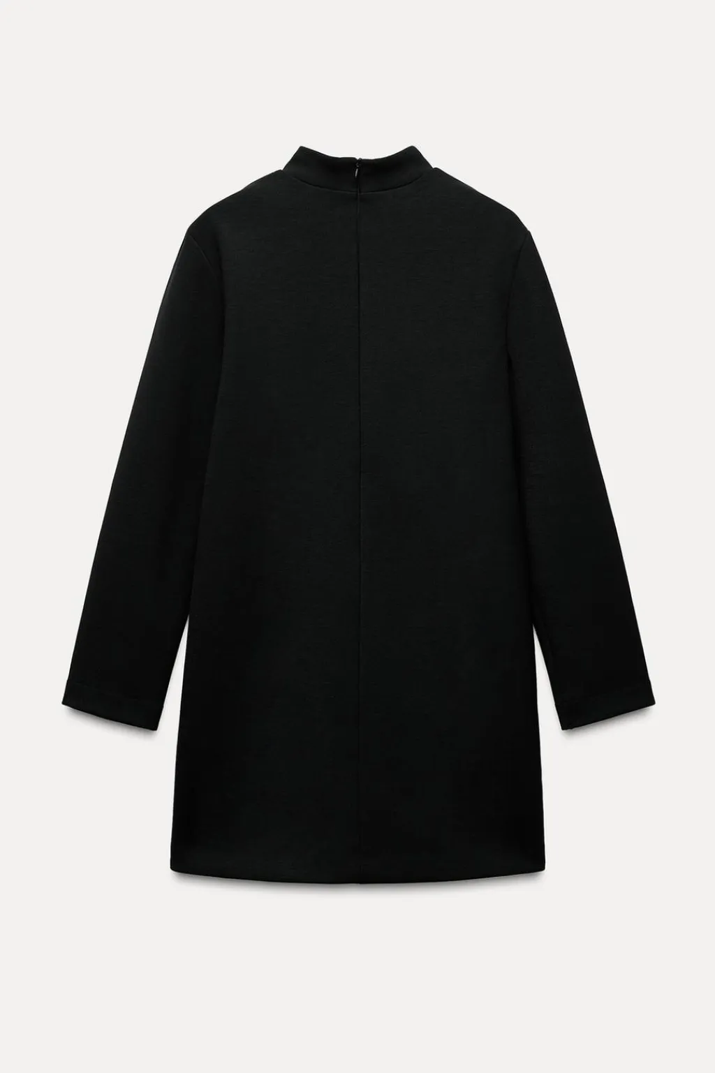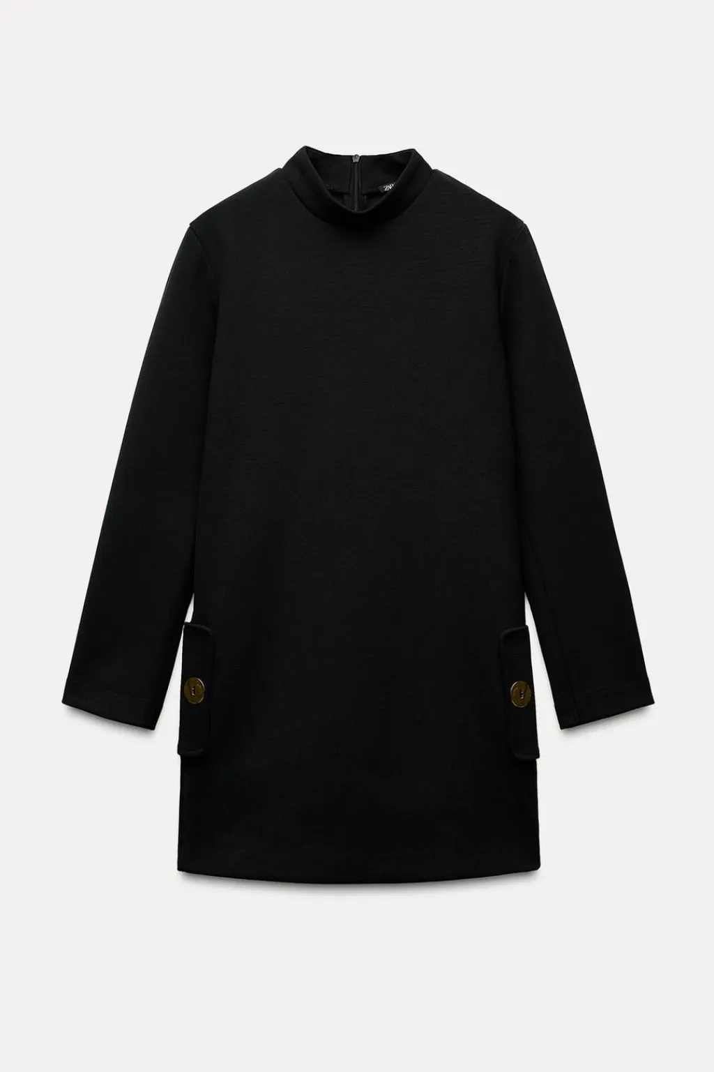 Vestido corto de cuello perkins y manga larga. Bolsillos delanteros con botones metálicos.