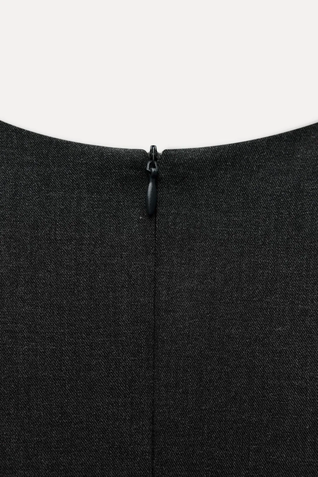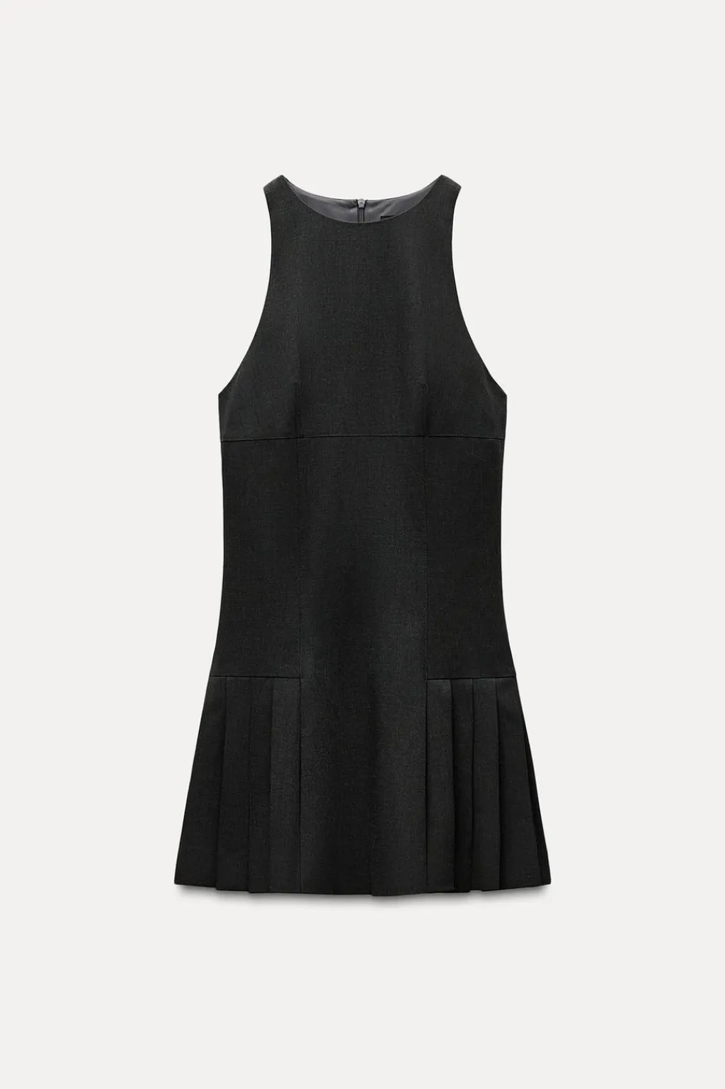 Vestido corto de cuello halter. Forro interior combinado. Bajo acabado en tablas. Cierre con cremallera oculta en costura.