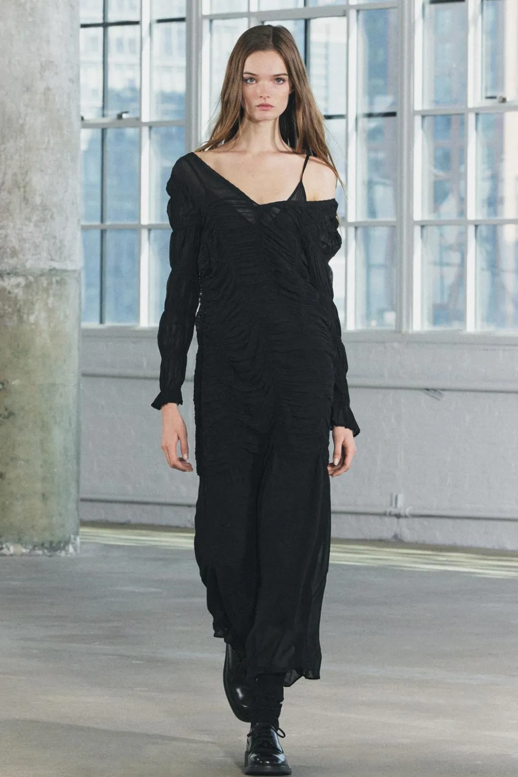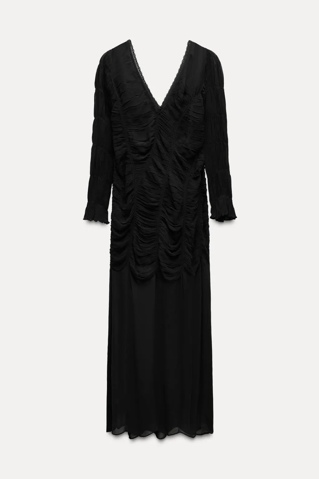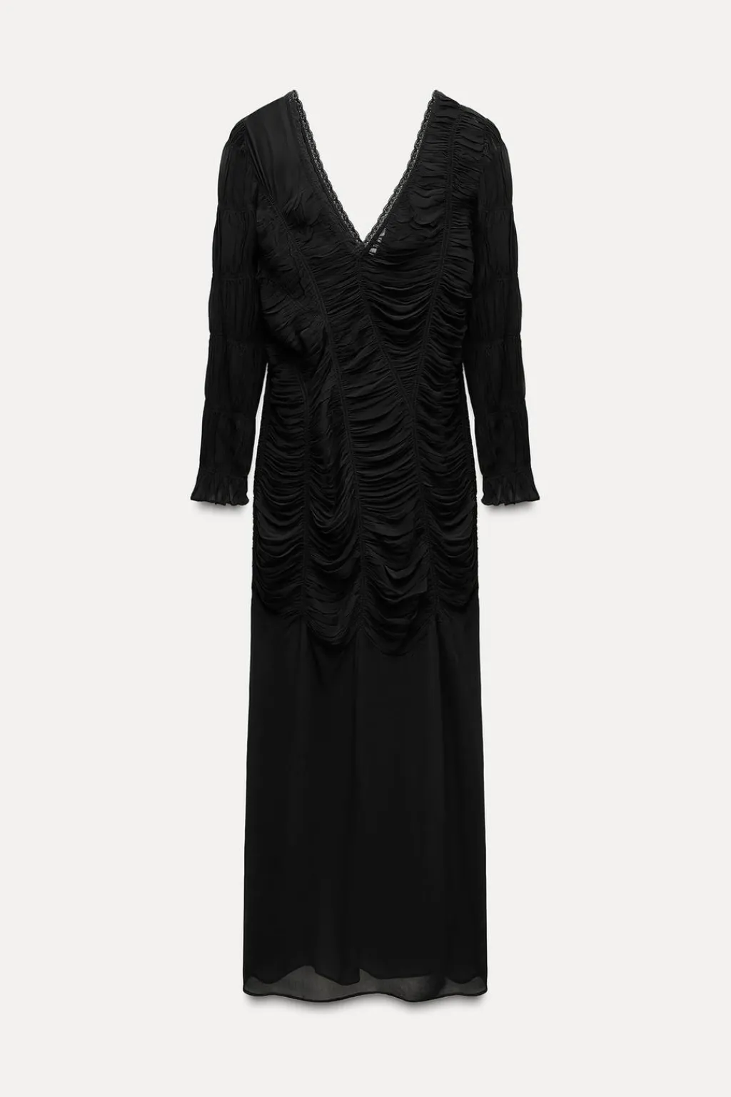 Vestido largo de escote pico y manga larga. Detalle de tejido drapeado con frunces. Forro interior.