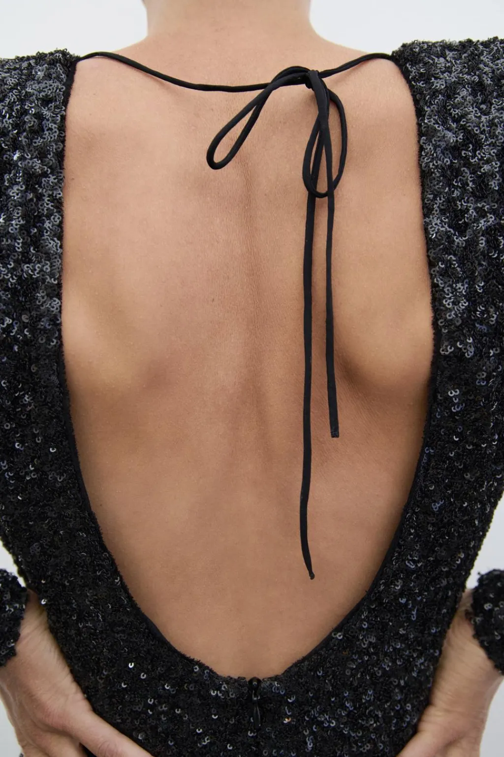 Vestido largo de cuello redondo y manga larga con hombreras. Detalle de aplicación de lentejuelas. Espalda descubierta. Cierre en cuello con lazadas.