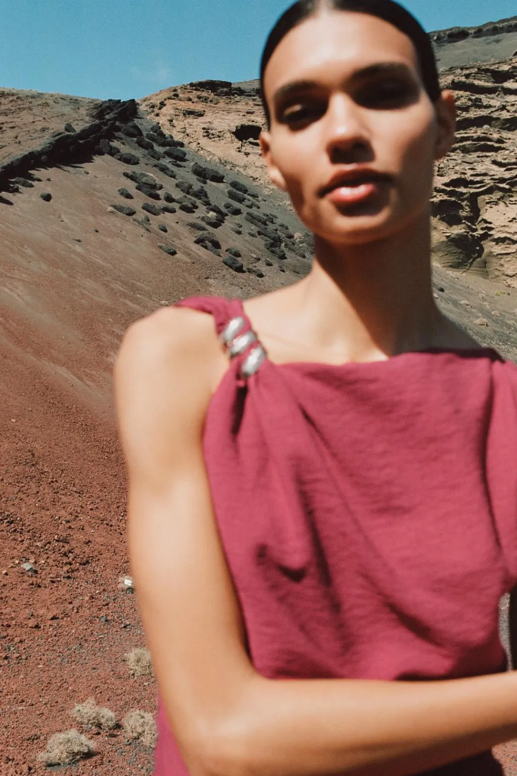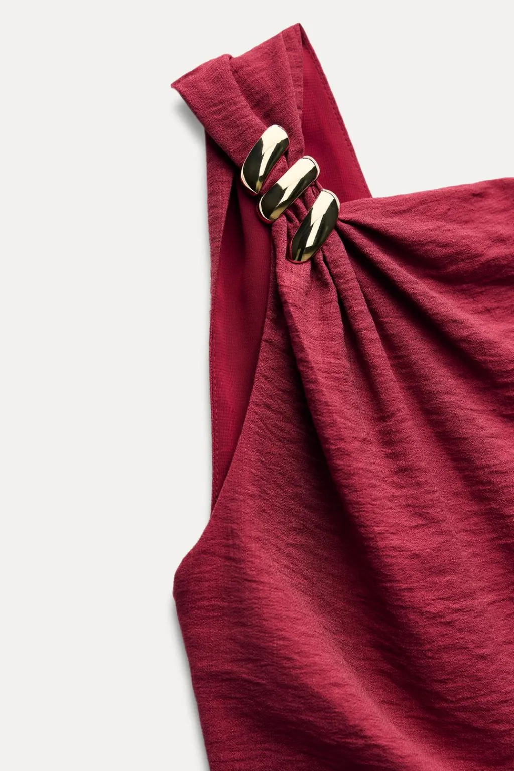Vestido de cuello asimétrico y manga sisa con aplique dorado en hombro. Detalle de frunces laterales en cintura. Escote pico en espalda. Cierre lateral con cremallera oculta en costura.
