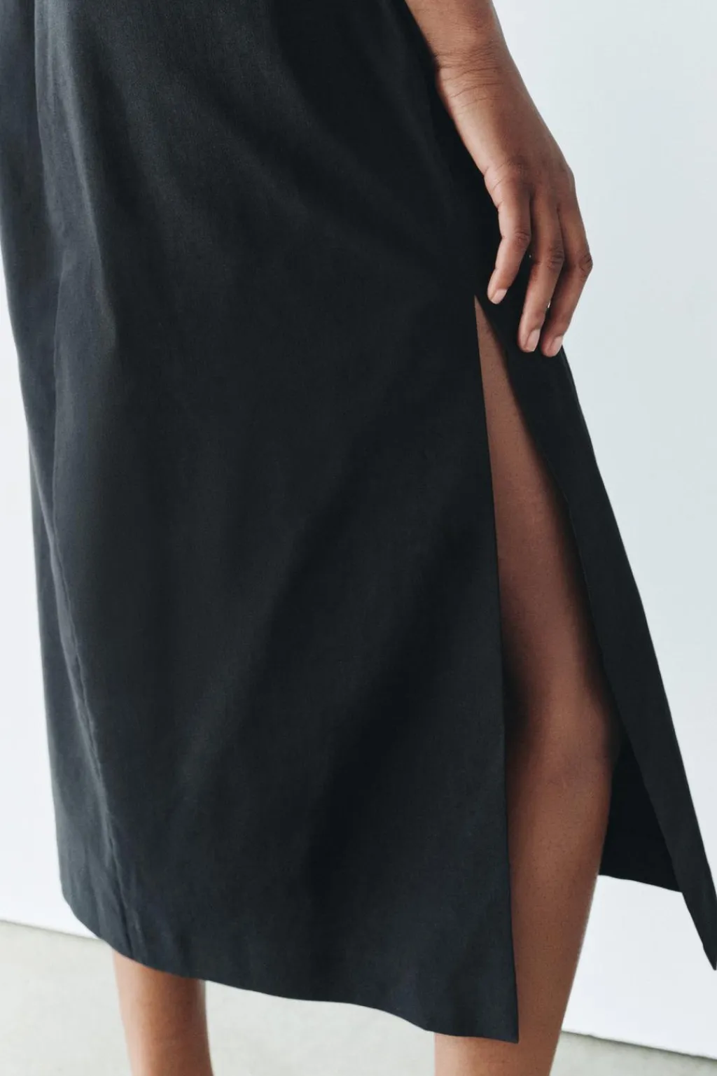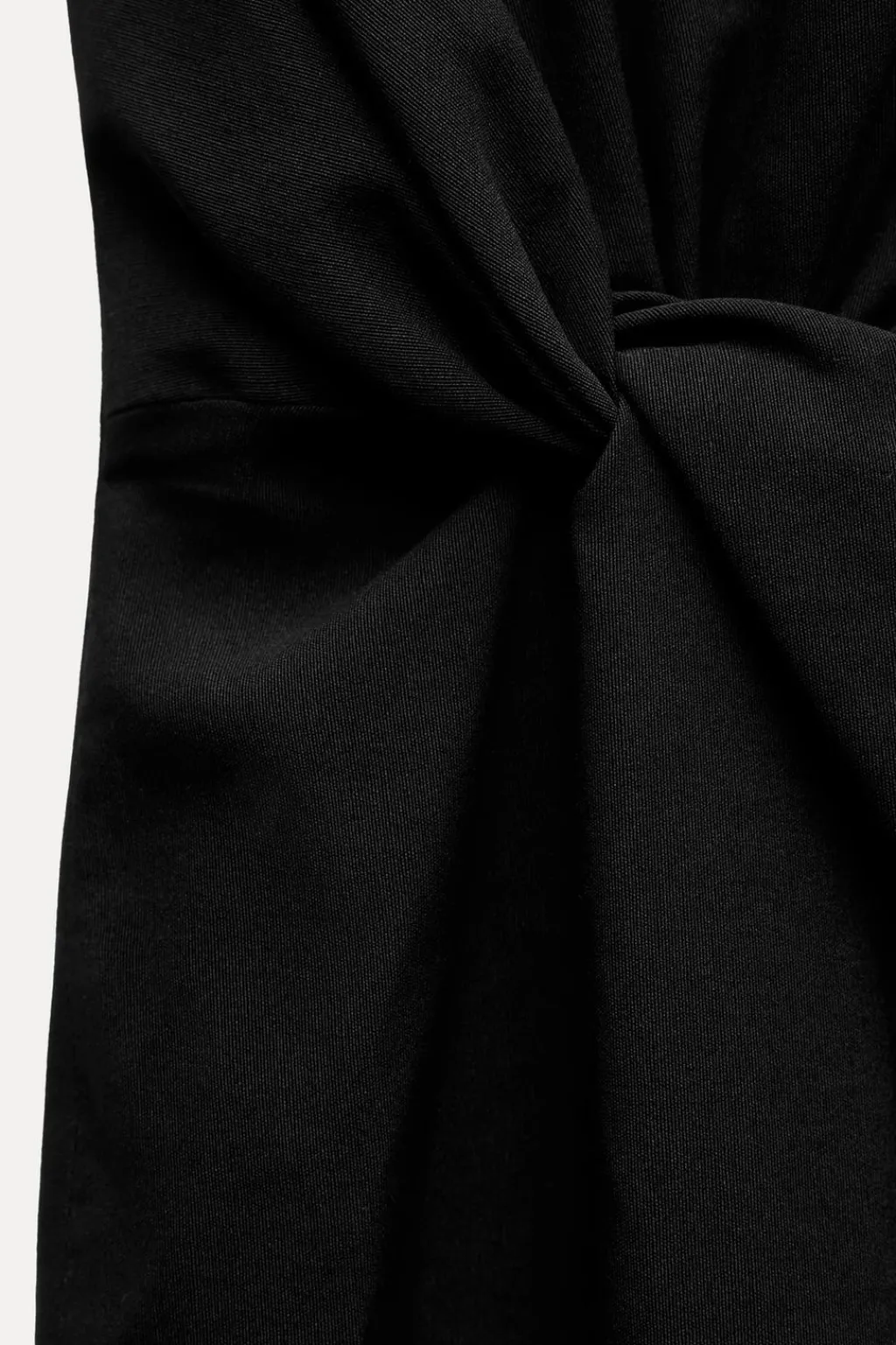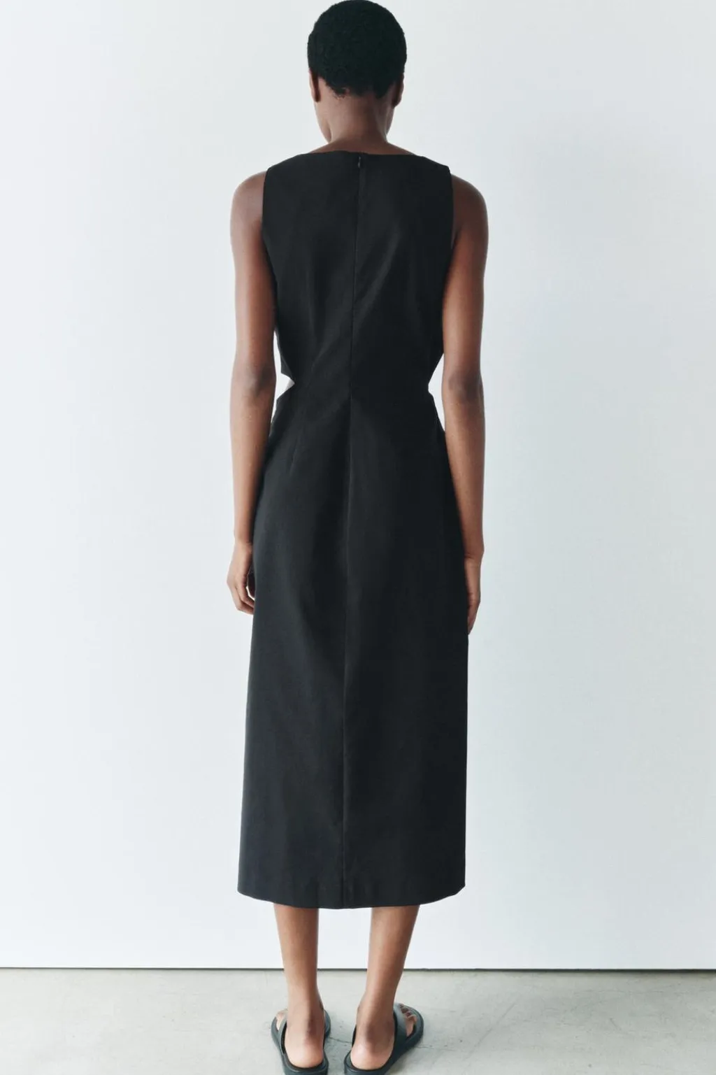 Vestido midi confeccionado en hilatura con mezcla algodón. Cuello redondo y manga sisa. Detalle de drapeado frontal y cut out lateral. Cierre en espalda con cremallera oculta en costura.