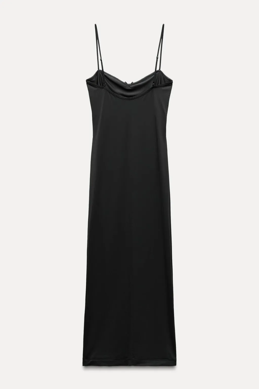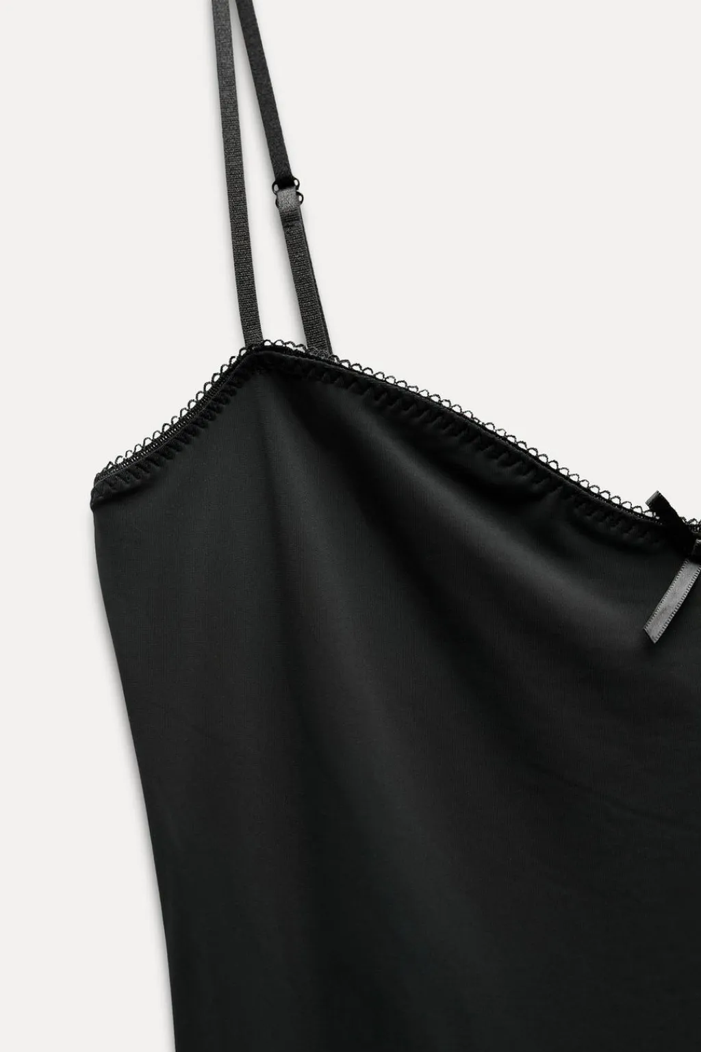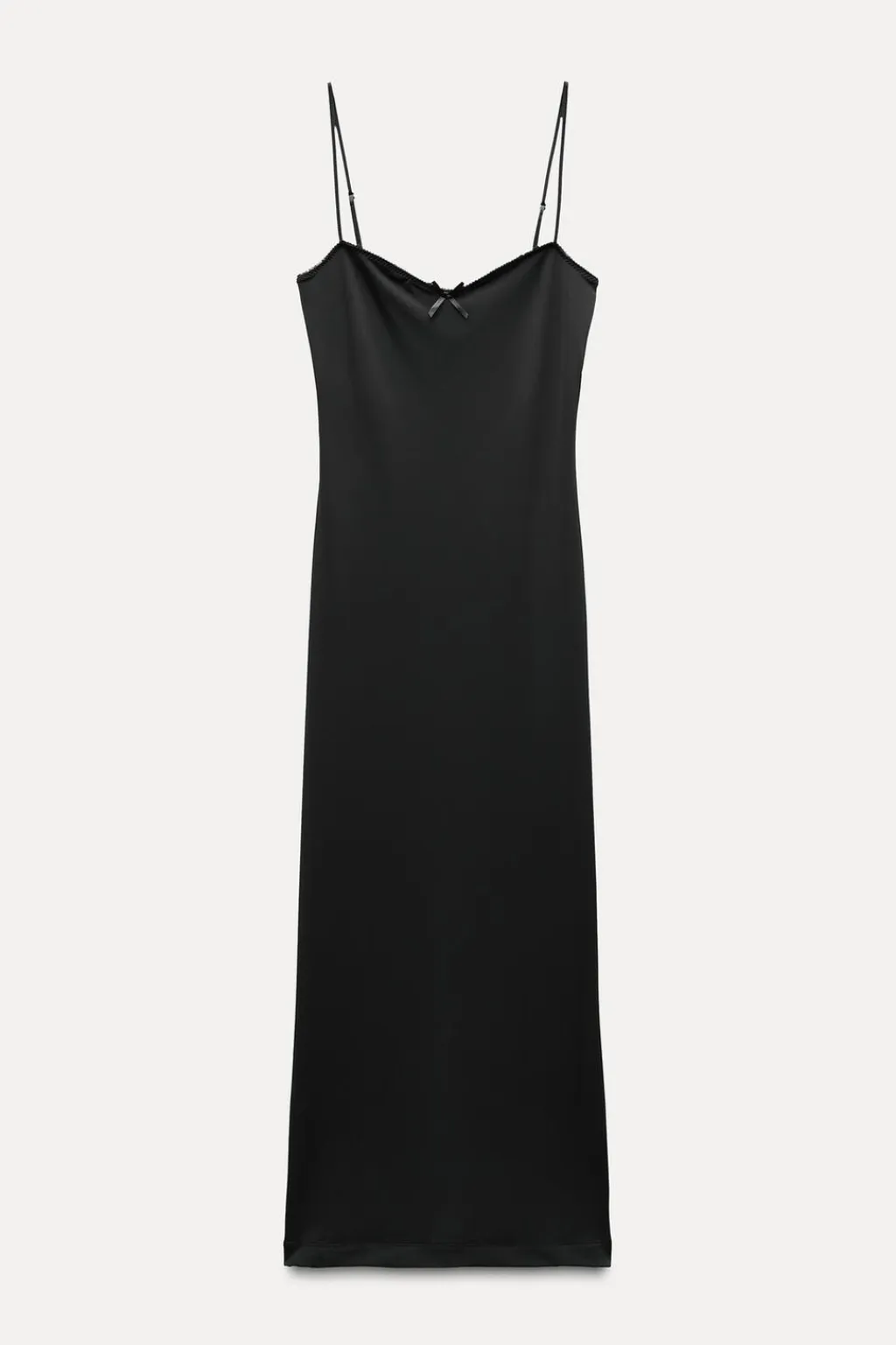 Vestido midi entallado confeccionado con poliamida. Escote pico acabado con puntilla y lazo. Tirantes finos ajustables.