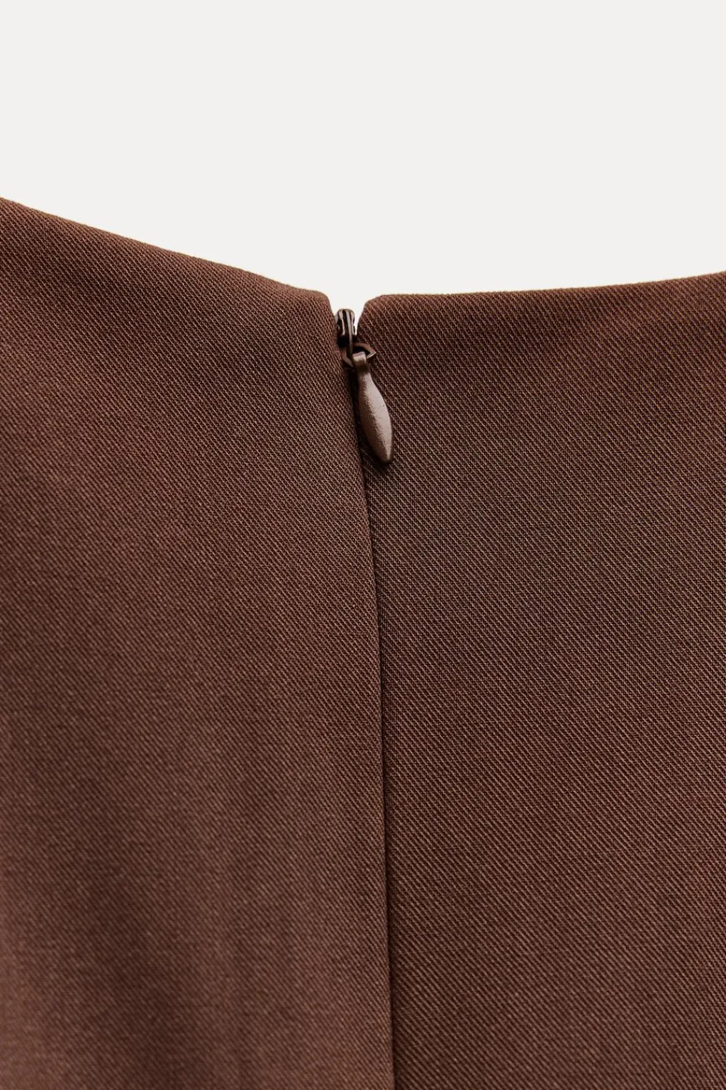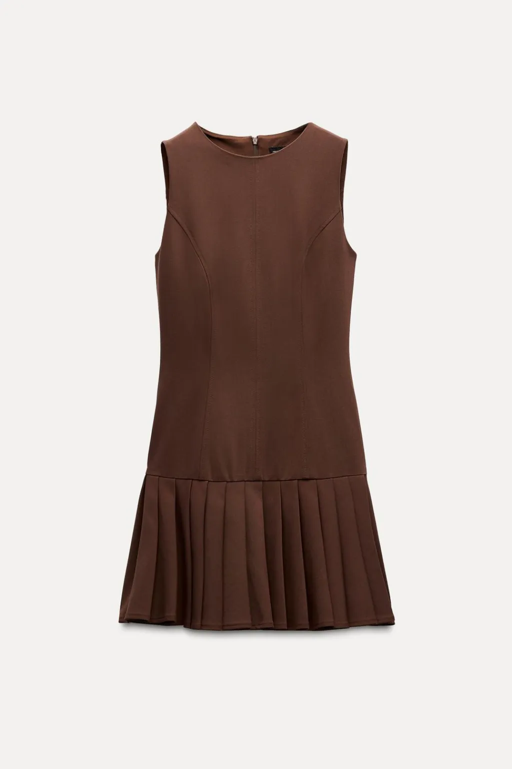 Vestido corto de cuello redondo y manga sisa. Bajo acabado con pliegues. Cierre en espalda con cremallera oculta en costura.
