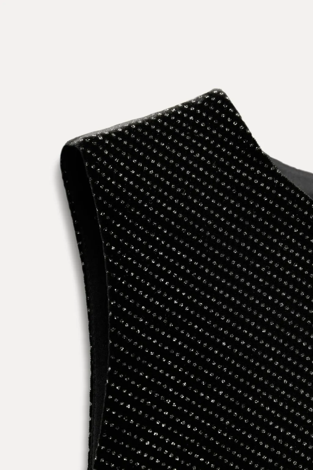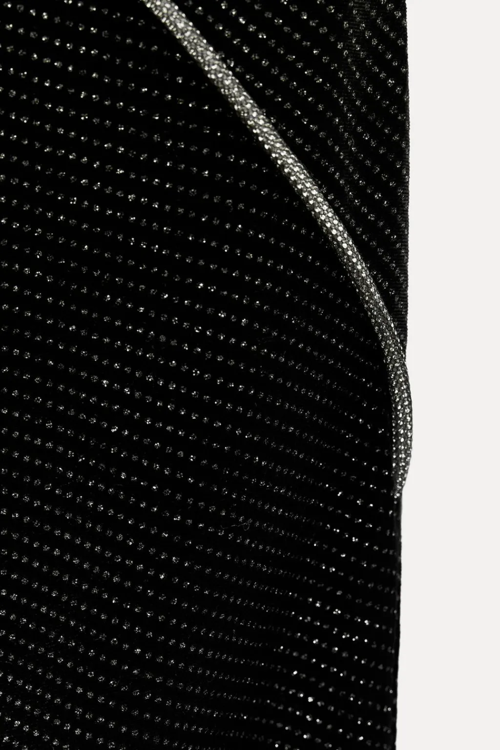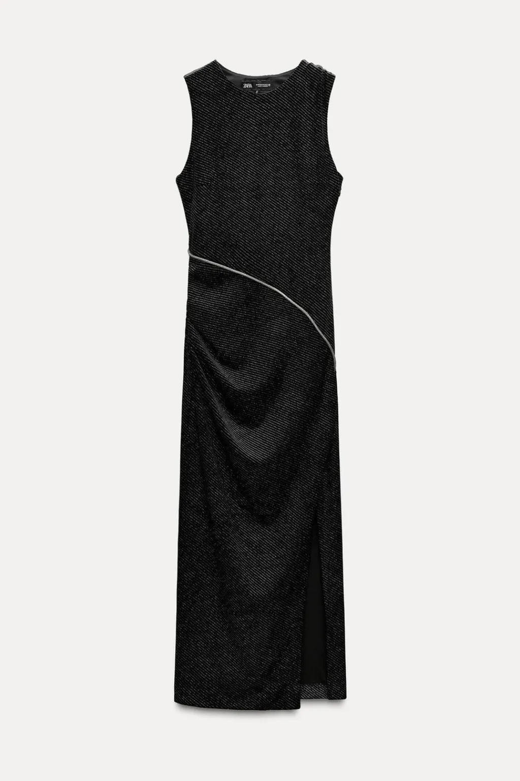Vestido midi de cuello redondo y manga sisa. Detalle de vivos y tejido con brillos. Abertura en espalda. Bajo con abertura frontal. Cierre lateral con cremallera oculta en costura.