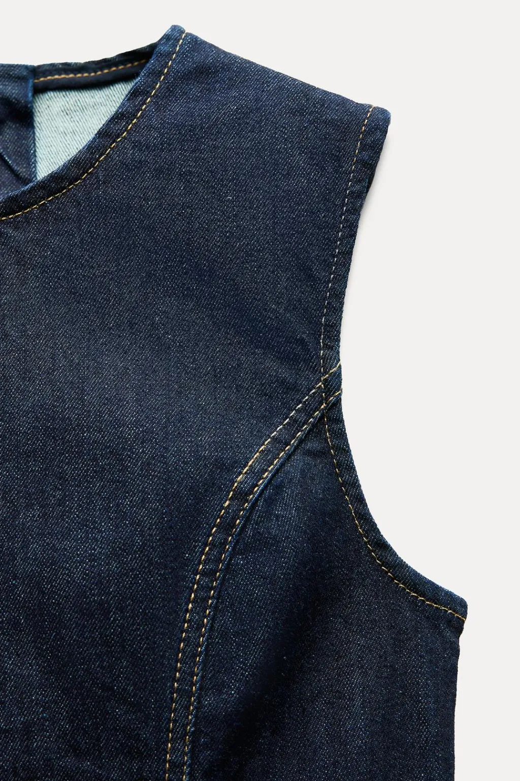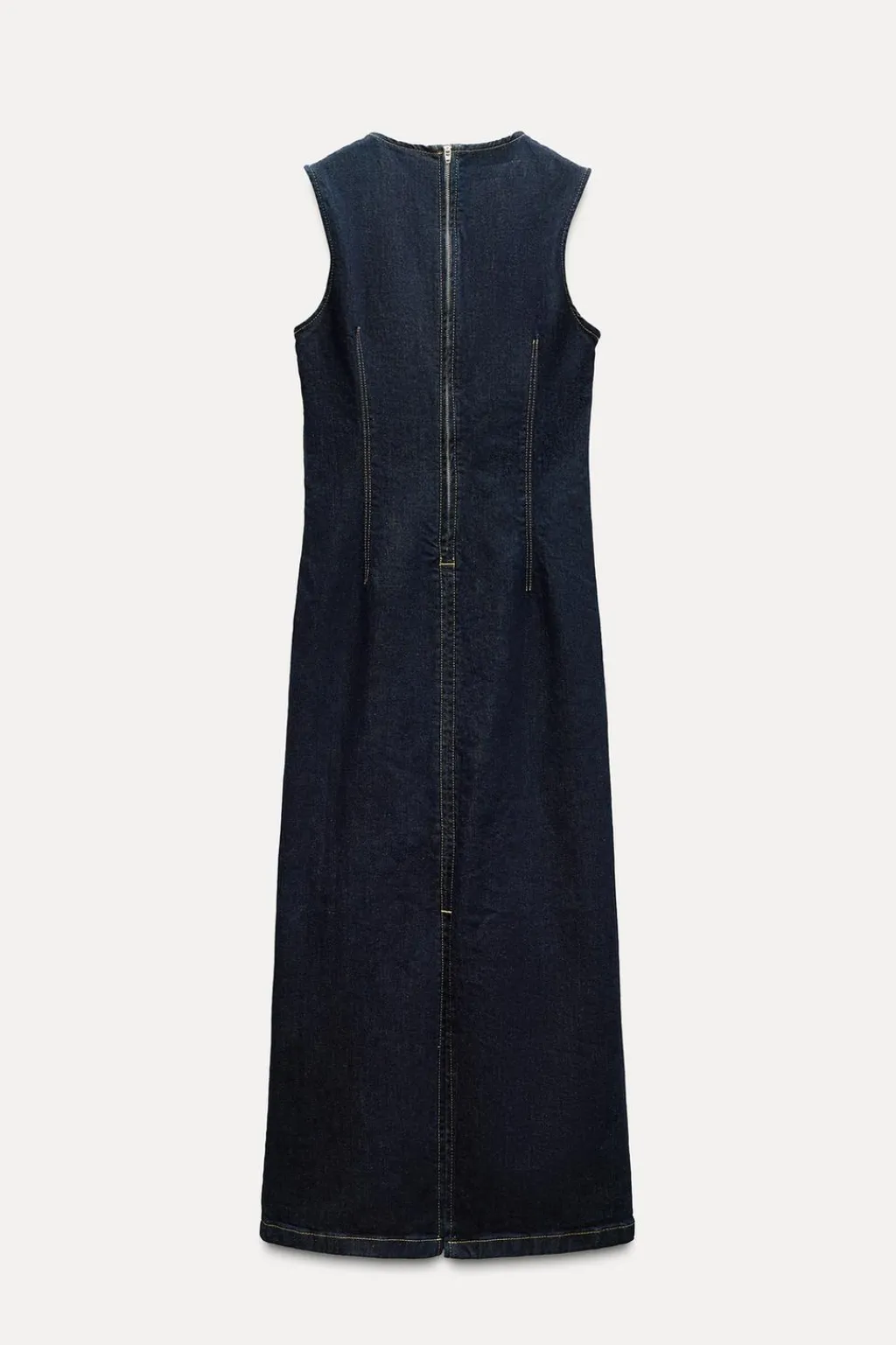 Vestido ajustado de cuello redondo y manga sisa. Bajo con abertura en espalda. Cierreen espalda con cremallera metálica.