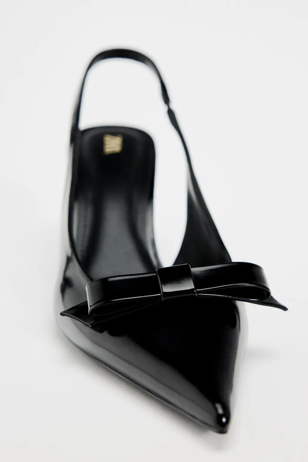 Zapato destalonado de tacón con efecto acharolado. Detalle de lazo en la parte delantera. Acabado en punta. Tira trasera con elástico.