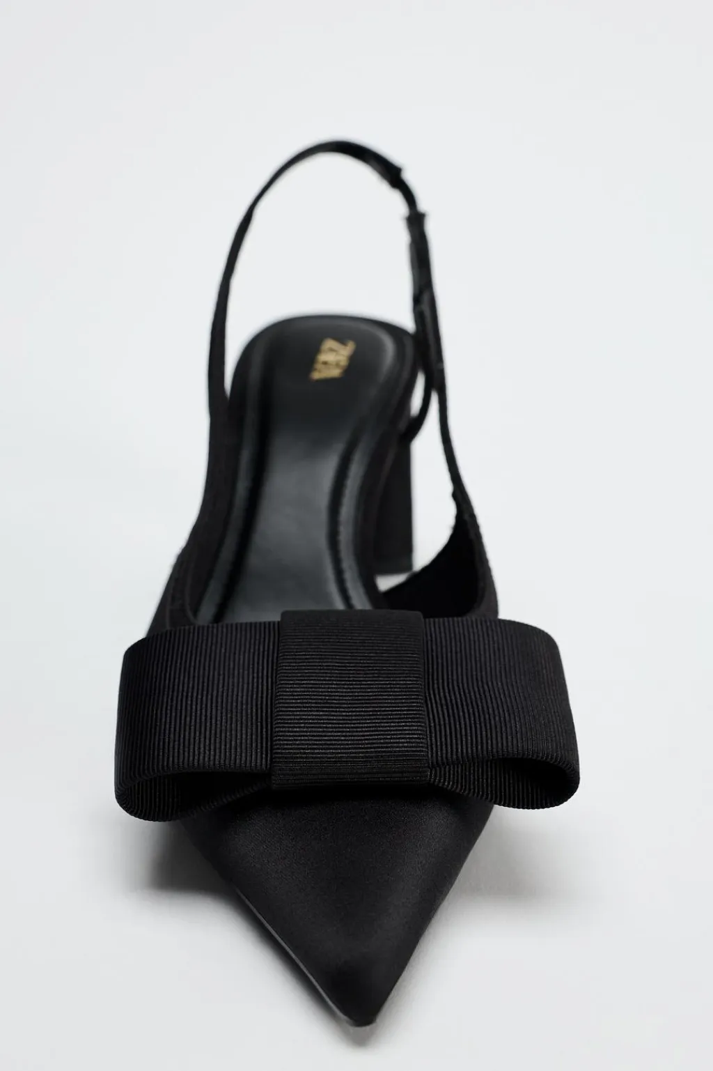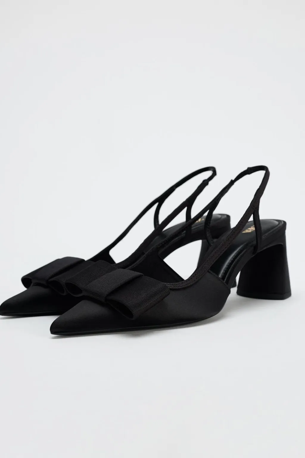 Zapato destalonado con tacón ancho. Detalle de lazo en la parte delantera. Tira trasera.