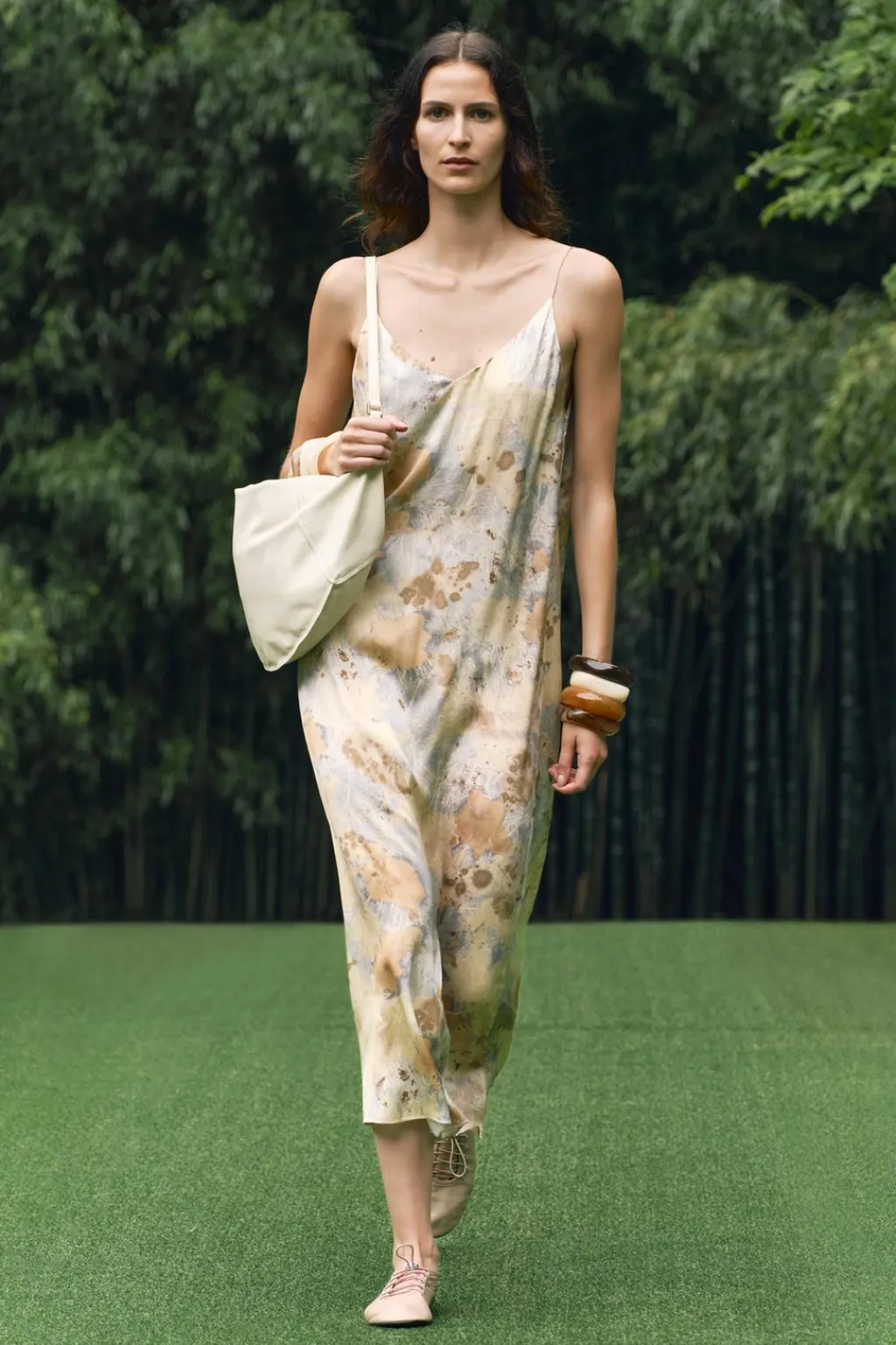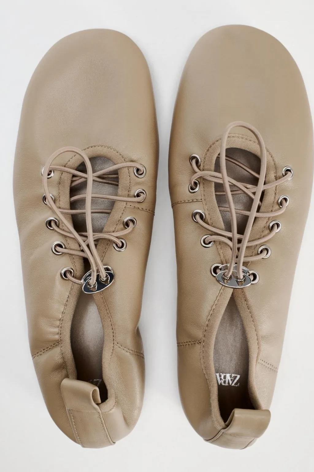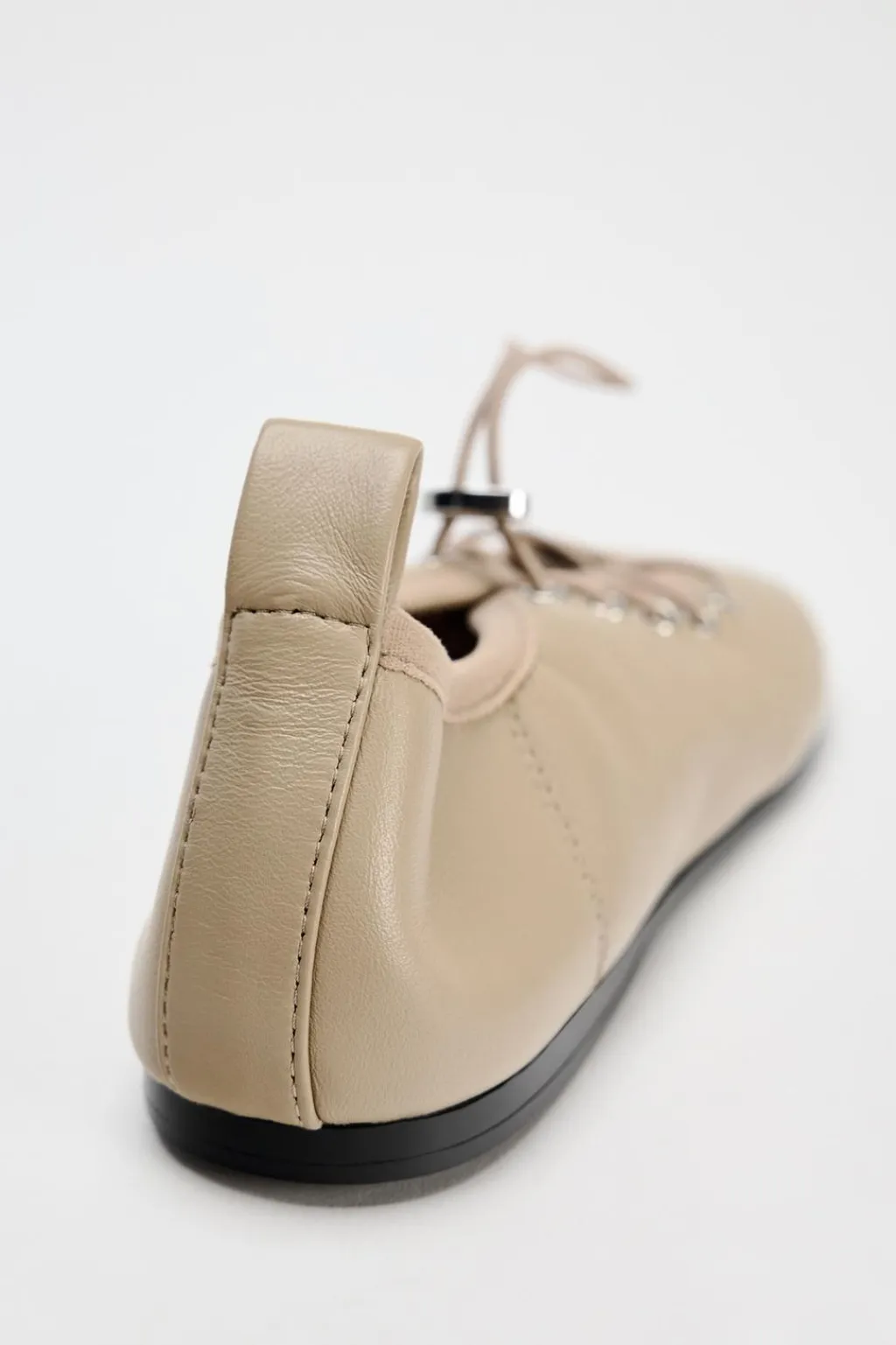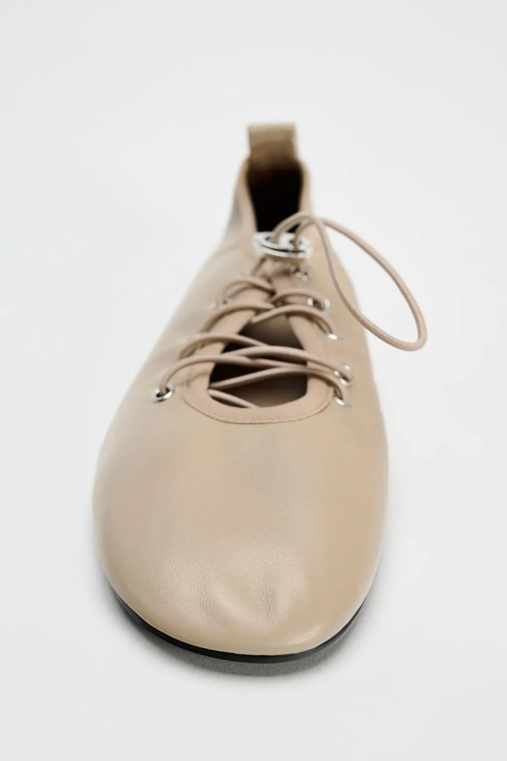 Zapato plano tipo bailarina en piel. Cierre mediante tirador metálico y cordones elásticos ajustables. Acabado en punta redonda.