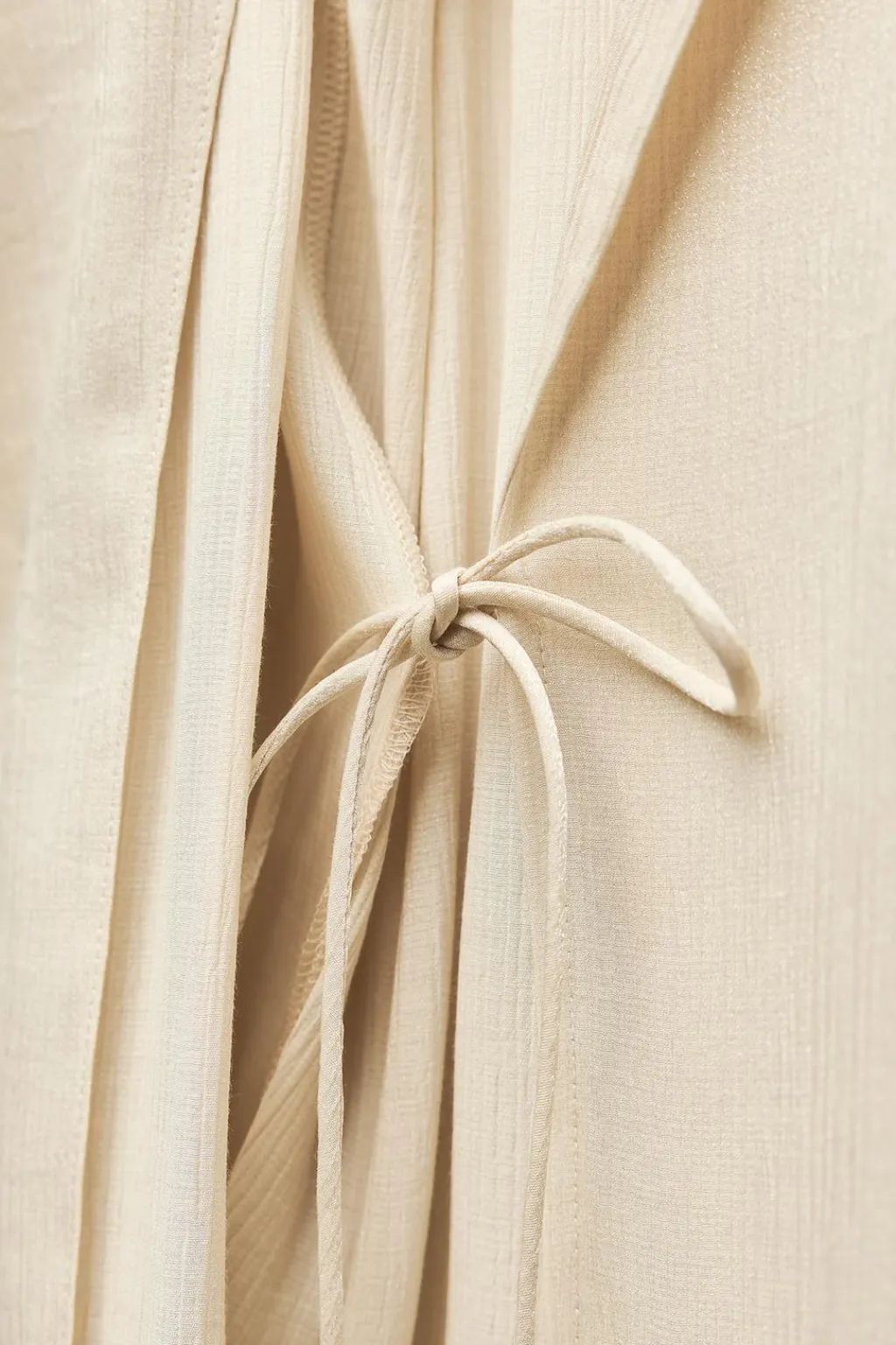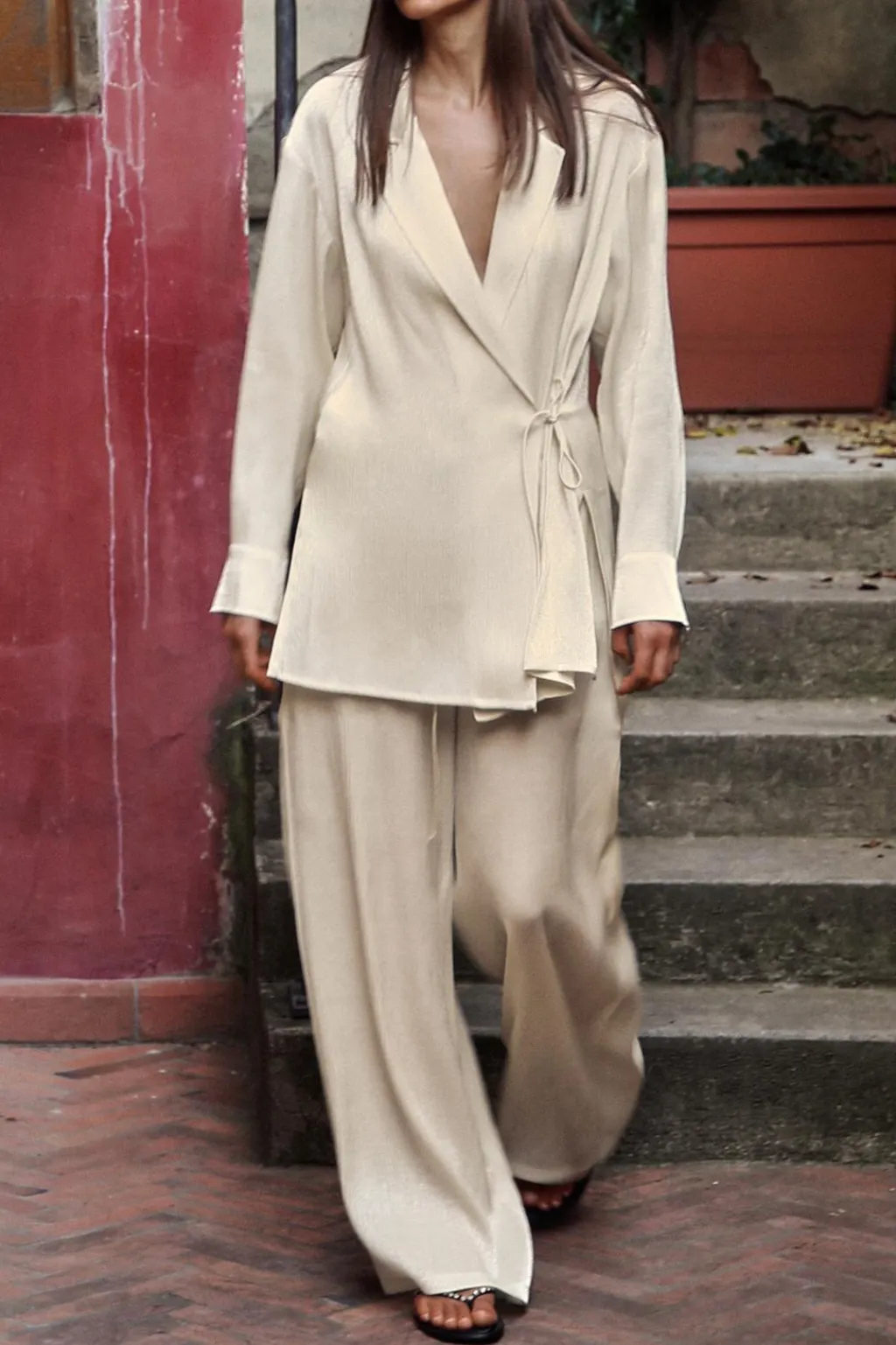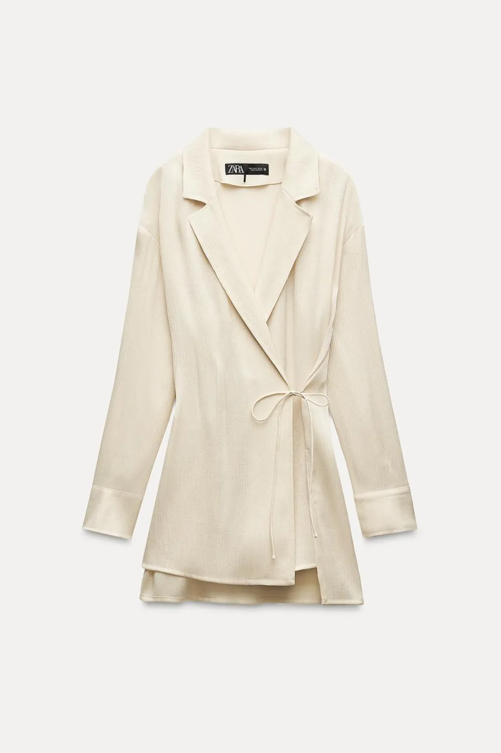 Blazer de cuello solapa y manga larga. Cierre frontal cruzado con lazos. Bajo con aberturas laterales. Detalle de tejido efecto arrugado con brillo.