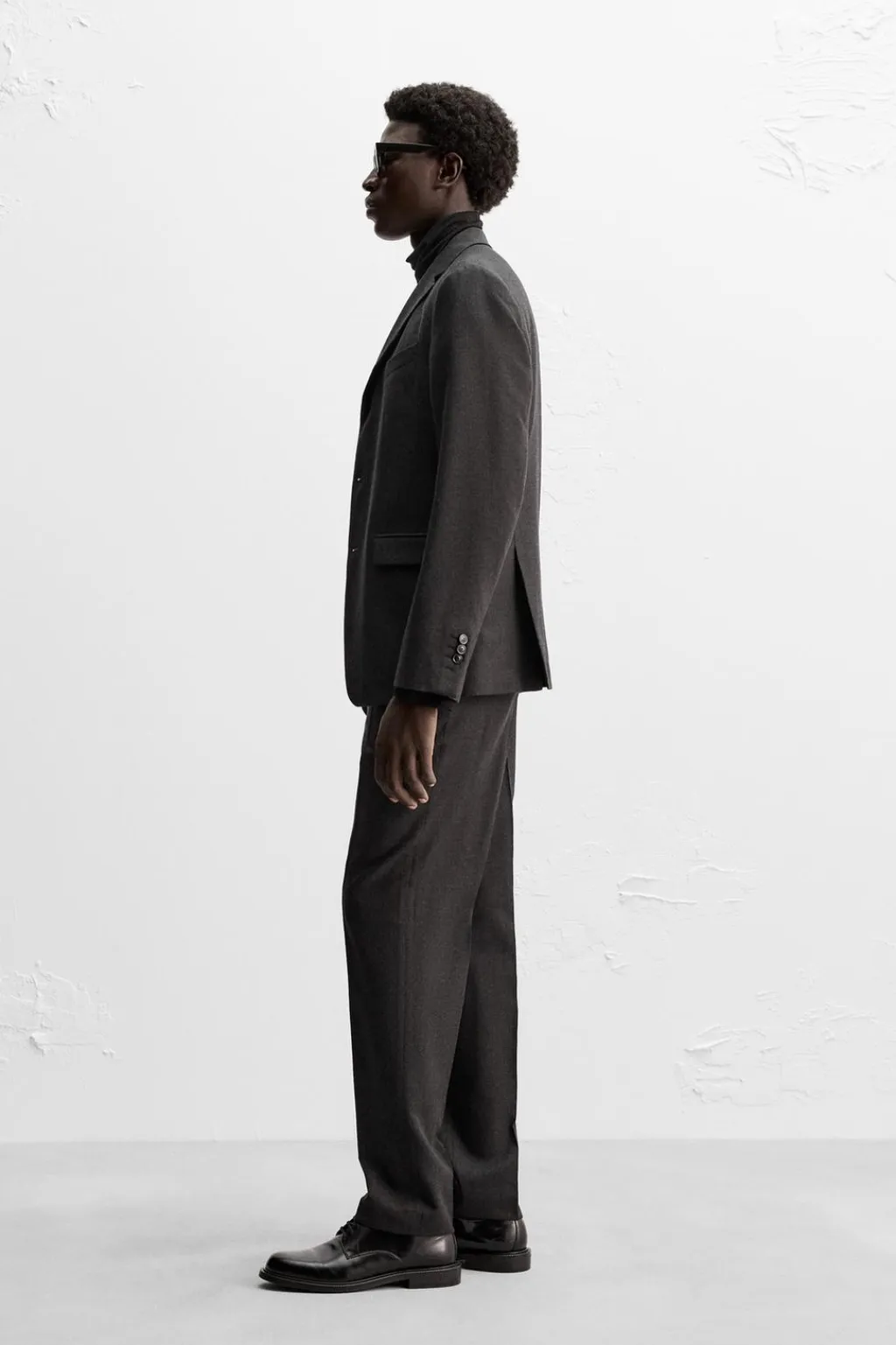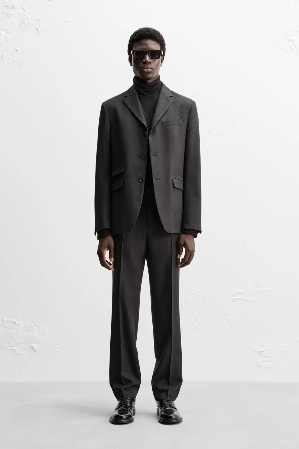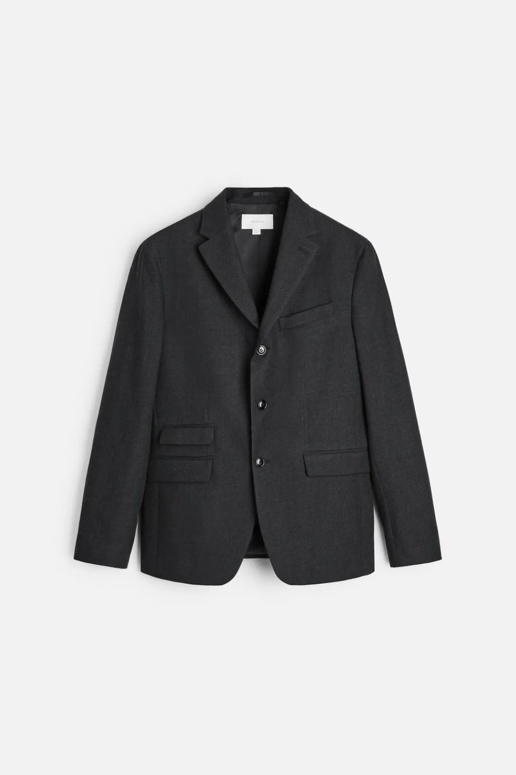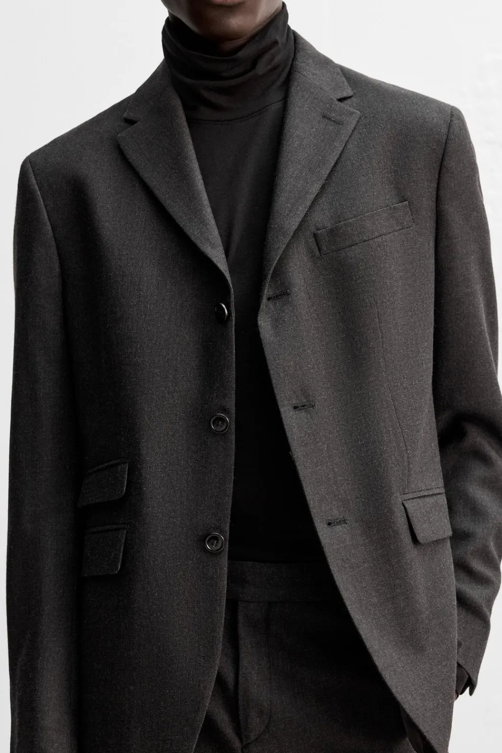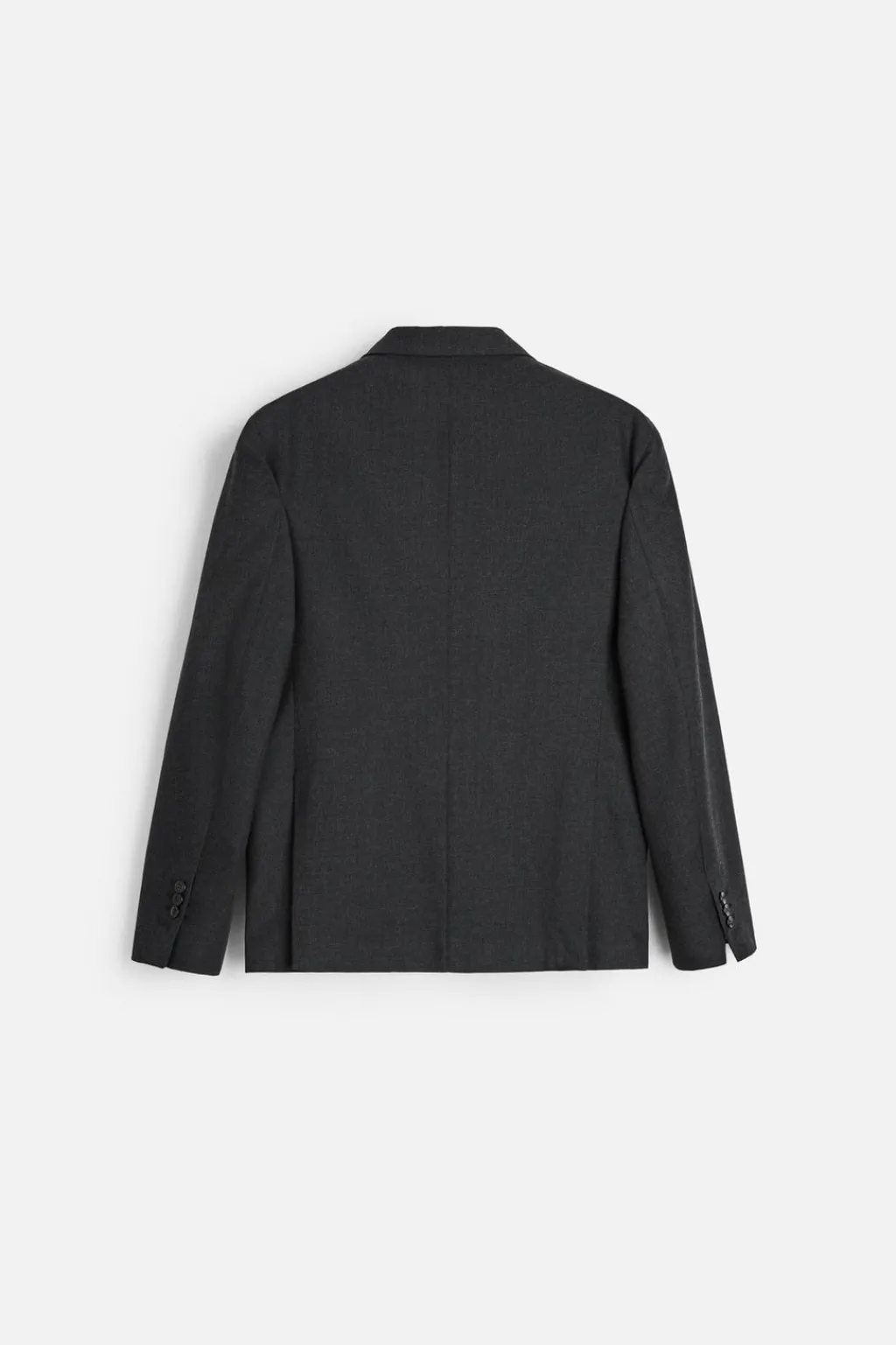 Cuello con solapas de muesca y manga larga acabada en puño con botones. Bolsillos de vivo en pecho y de solapa en cadera. Detalle de bolsillo interior. Bajo con aberturas en espalda. Cierre frontal de botonadura con tres botones.
