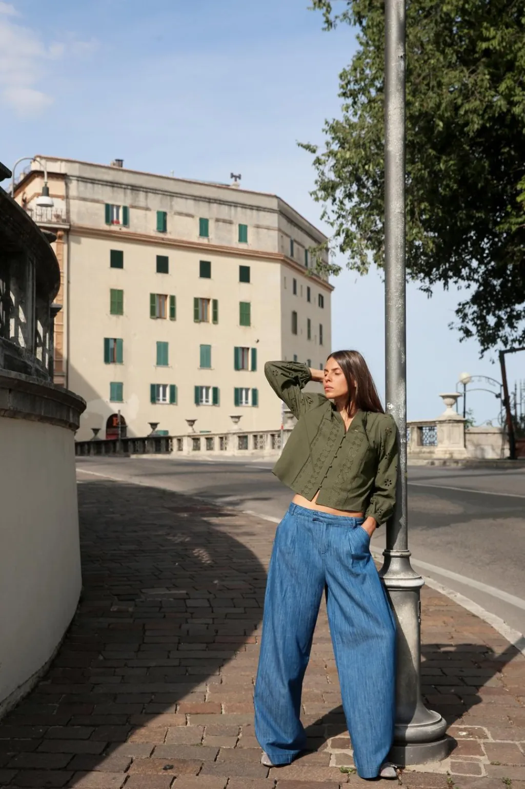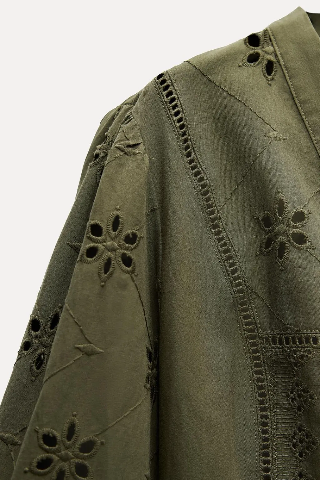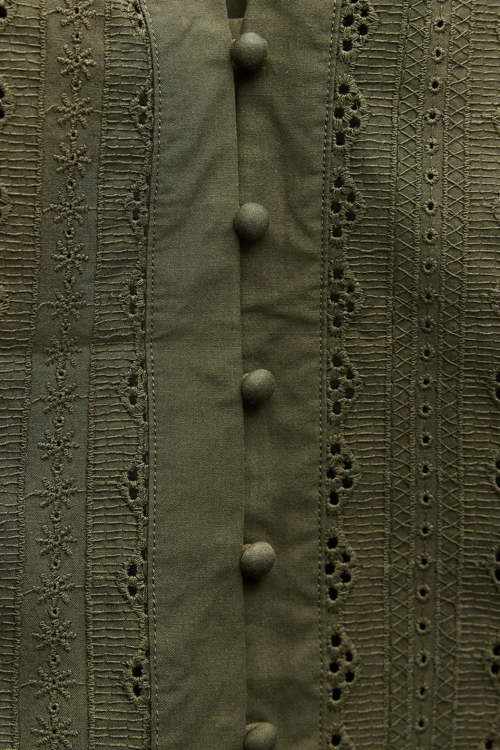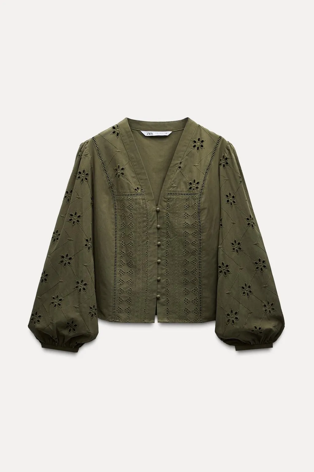 Blusa de escote pico y manga larga. Detalle de bordados perforados y entredoses. Cierre frontal con botones forrados a tono.