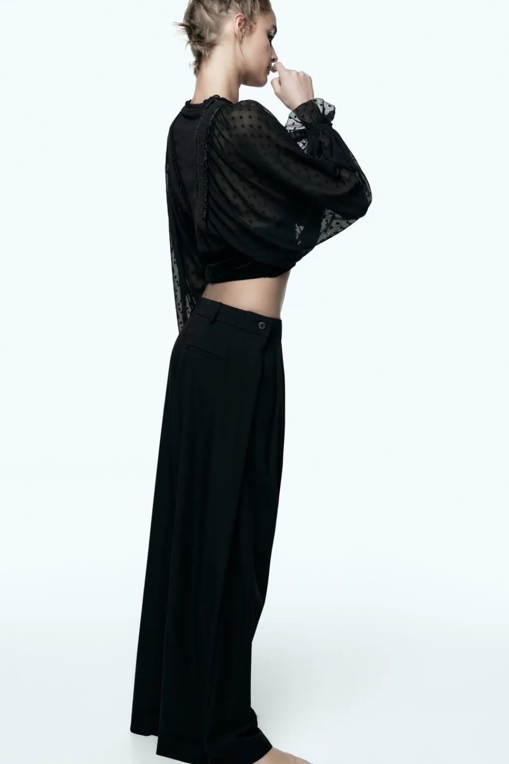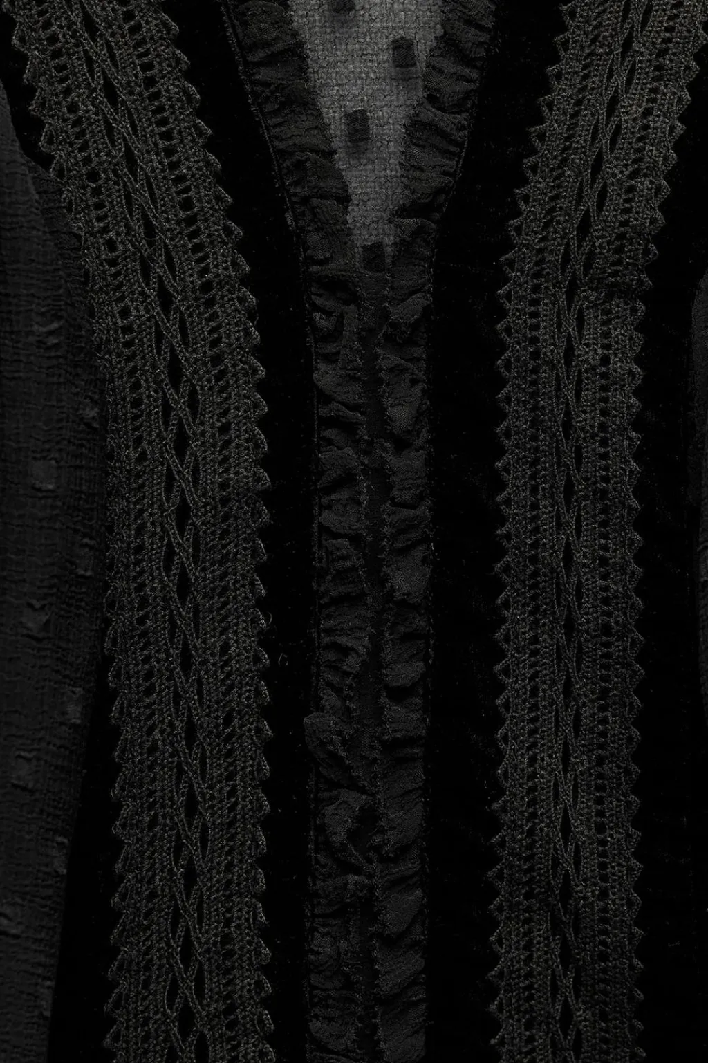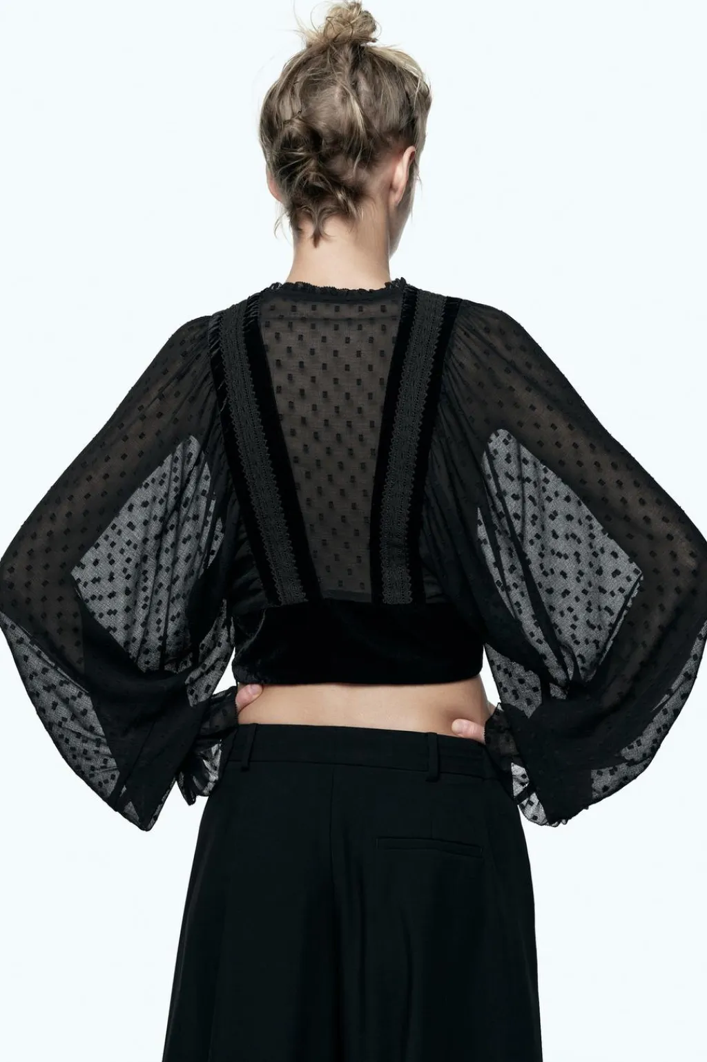 Blusa corta de escote pico y manga larga con la sisa ancha, estrechándose hacia la muñeca. Detalle de tejido combinado con terciopelo y entredoses. Cierre lateral con cremallera oculta en costura.