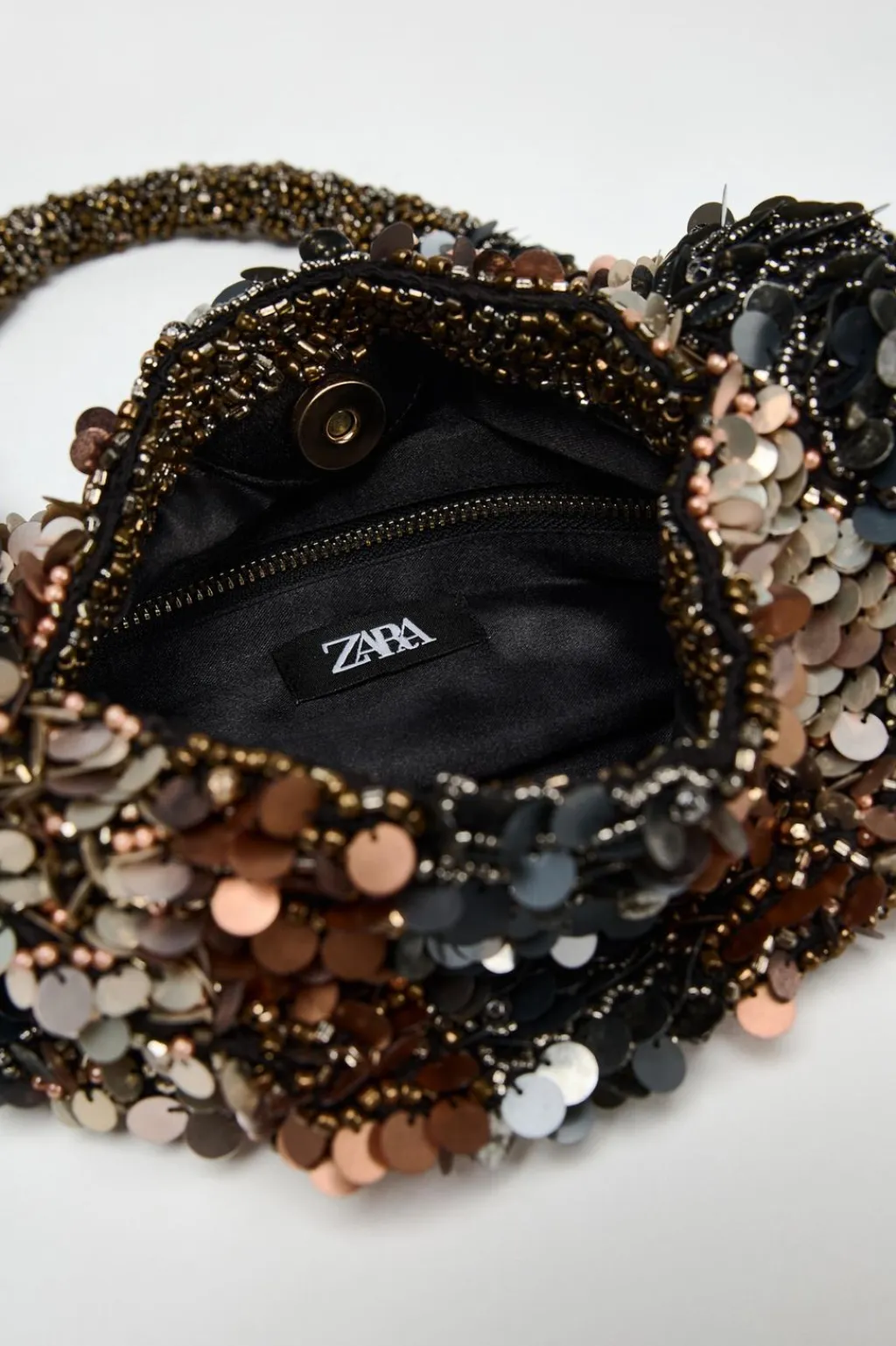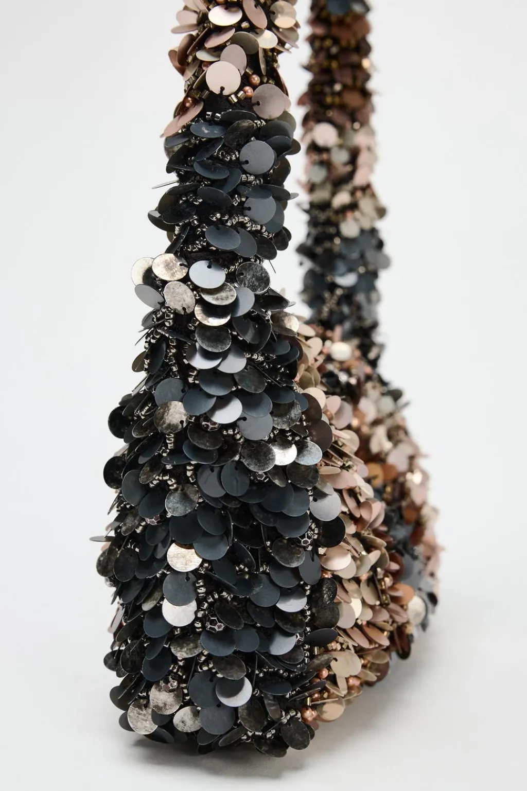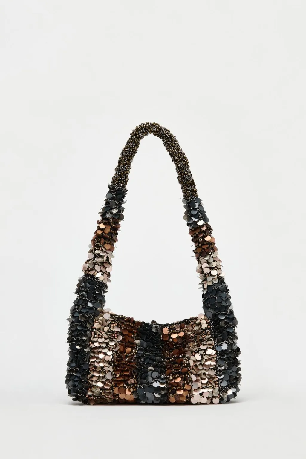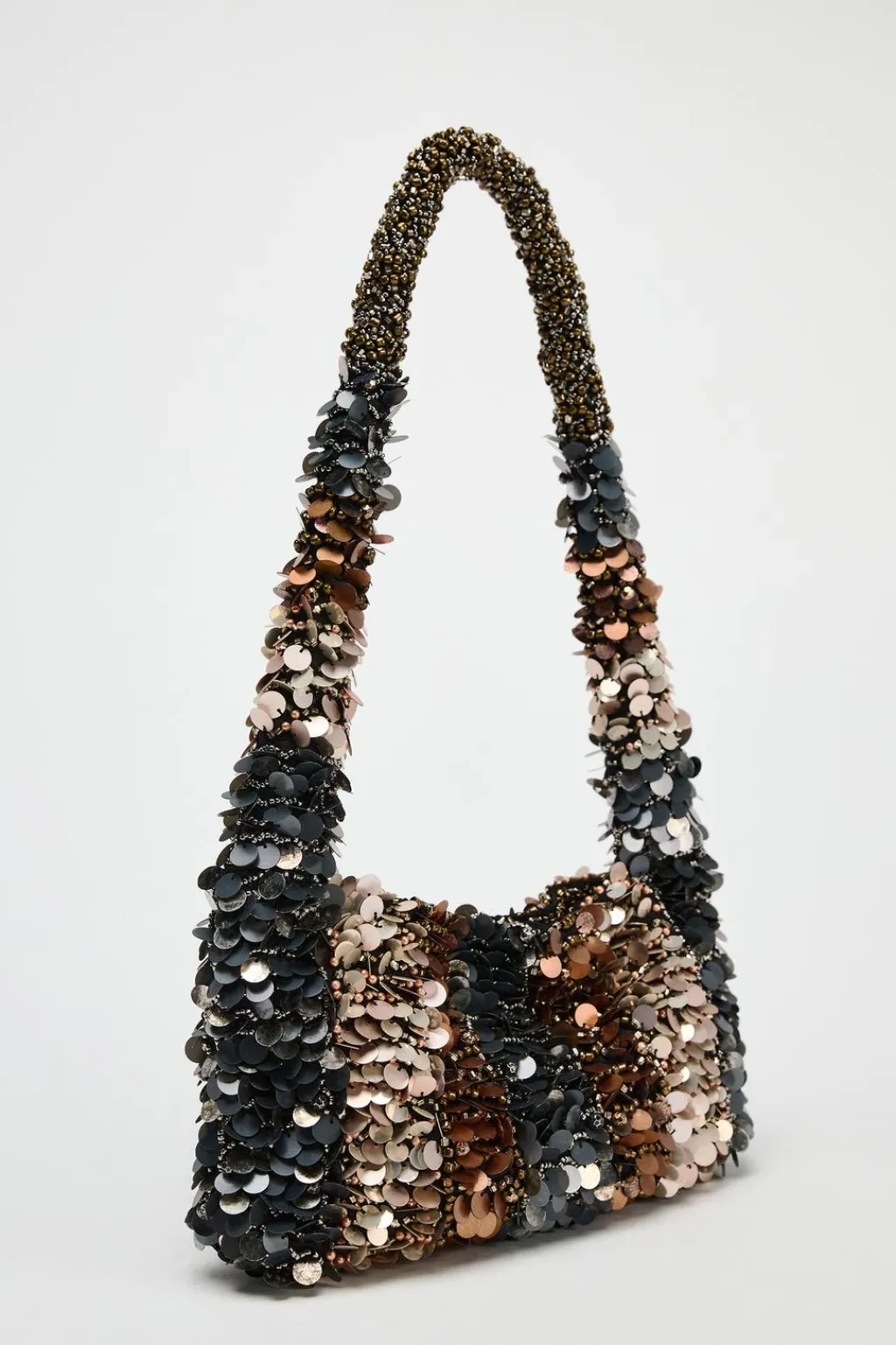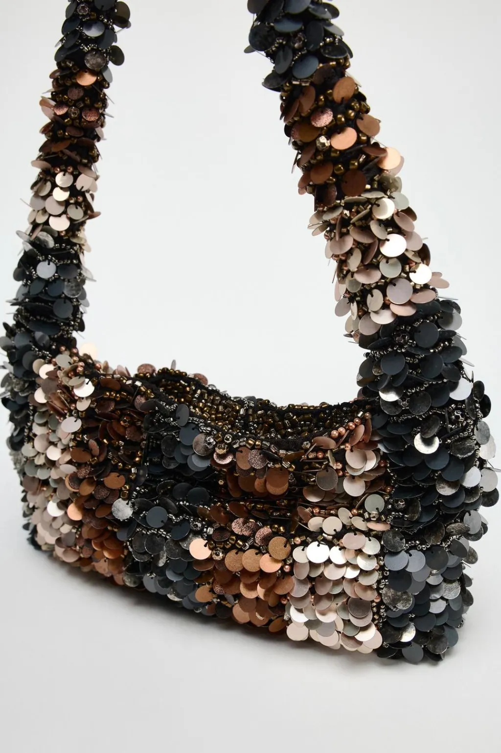 Bolso de hombro con lentejuelas multicolores en el cuerpo. Bolsillo interior con cremallera y cierre mediante imán.