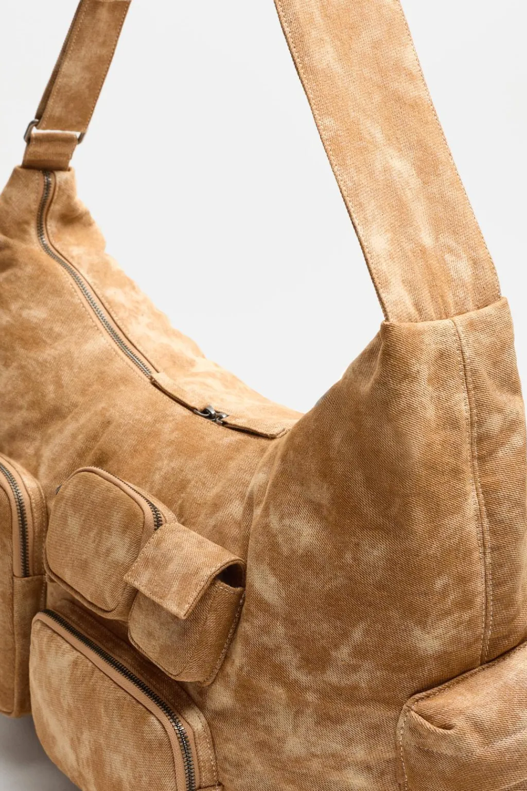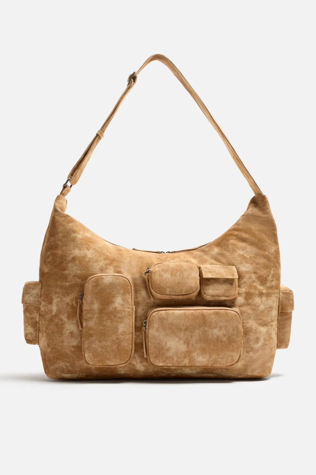 Bolso de hombro multibolsillos fabricado en tejido. Compartimento principal cuenta con cierre mediante doble cremallera. En su interior cuenta con dos bolsillos pequeños, uno de ellos con cierre de cremallera. En la parte frontal cuenta con cuatro compartimentos frontales, tres de ellos con cierre mediante cremallera. En los laterales tiene dos bolsillos con cierre de solapa imantada. Asa de hombro ajustable.