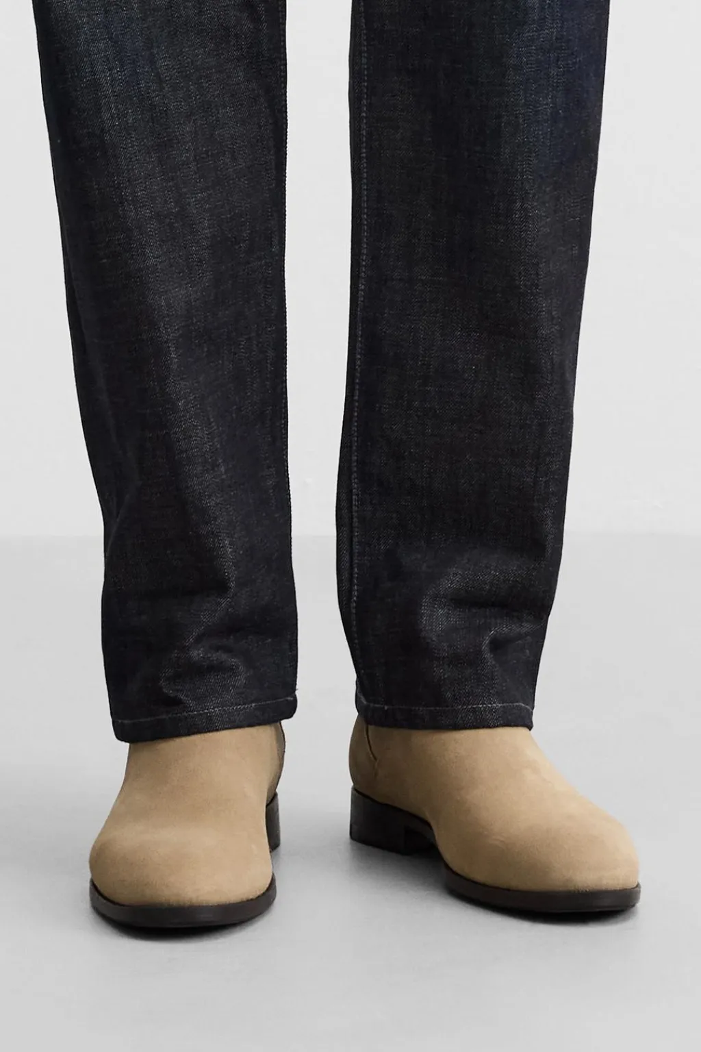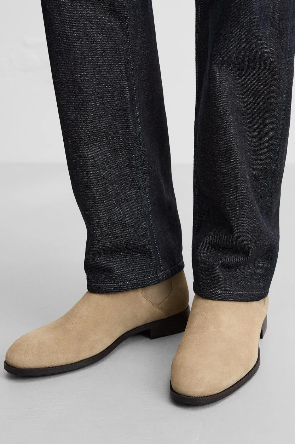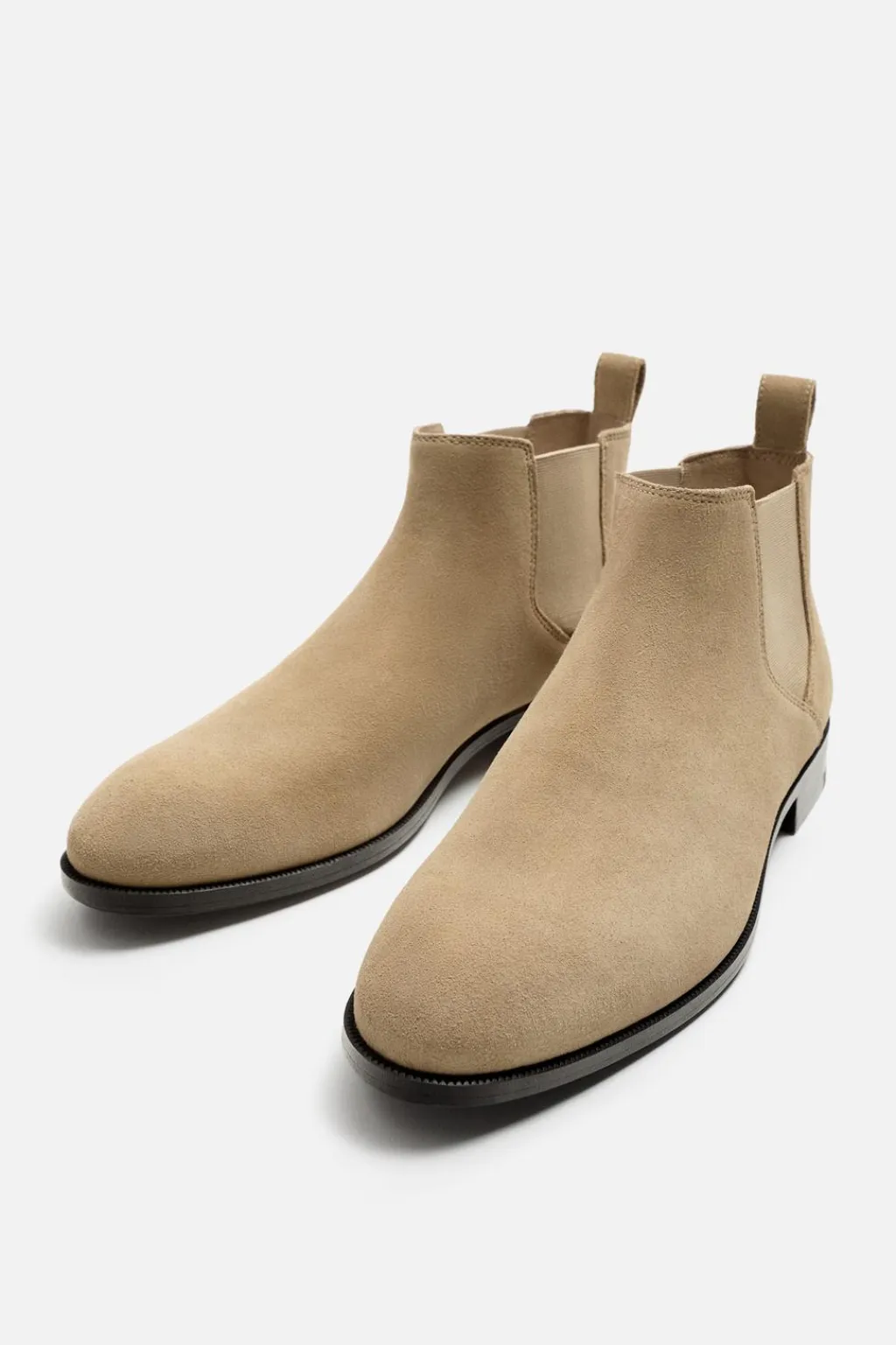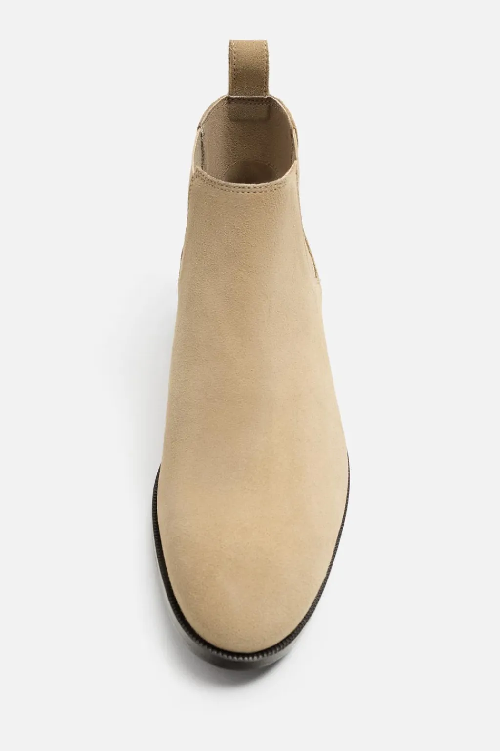 Bota estilo chelsea de caña baja. Parte superior fabricada en piel con acabado serraje. Cuenta con dos piezas elásticas laterales y tirador trasero para facilitar el calce. Horma en punta.