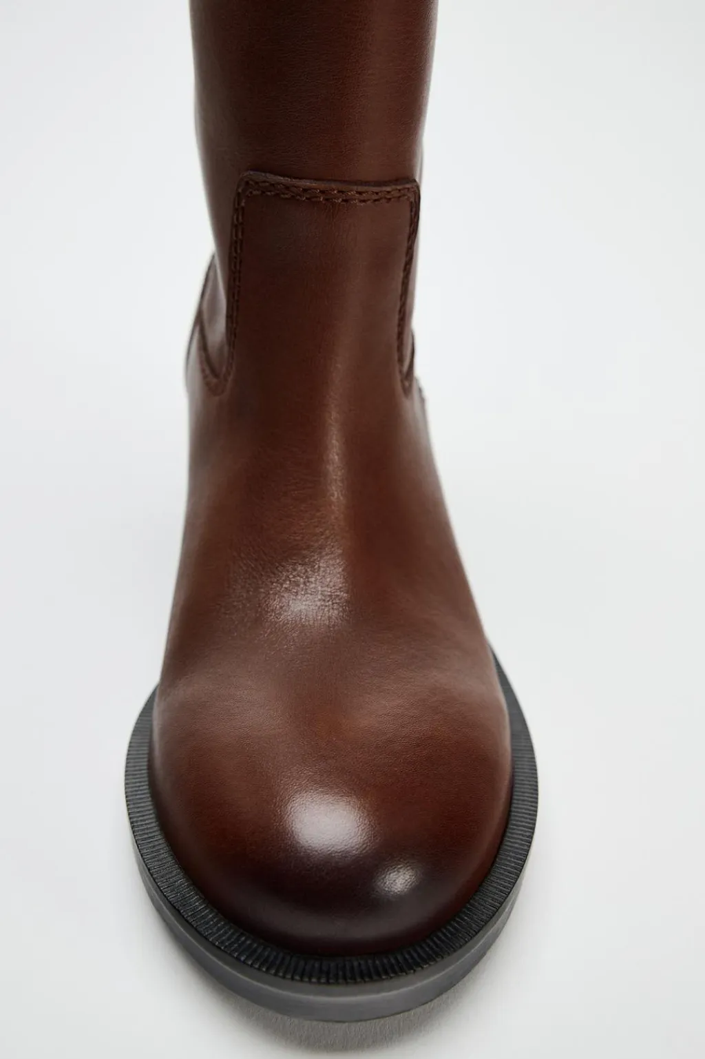 Zapato tipo botín en piel. Caña ancha. Tiradores laterales. Acabado en punta redonda.