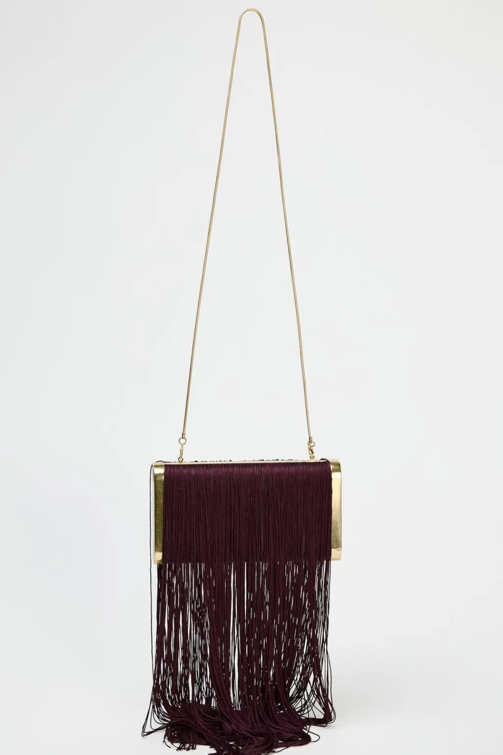 Bolso formato caja con detalle de flecos en el corte. Asa bandolera en cadena. Forro interior. Cierre mediante clip imantado.