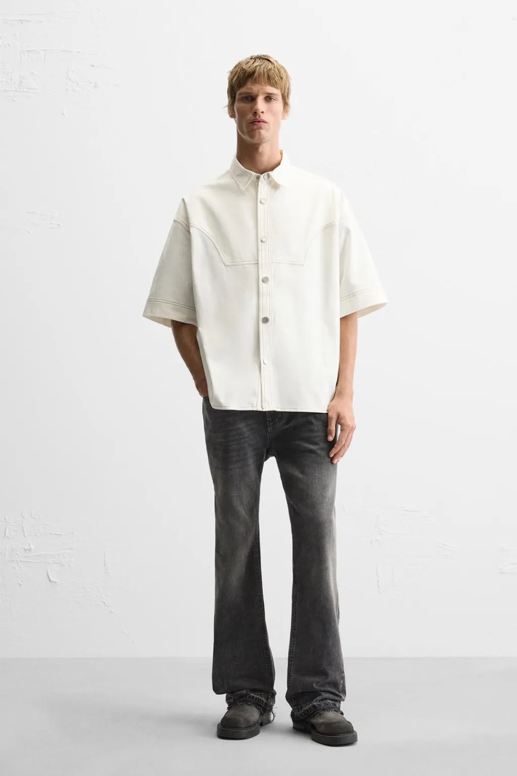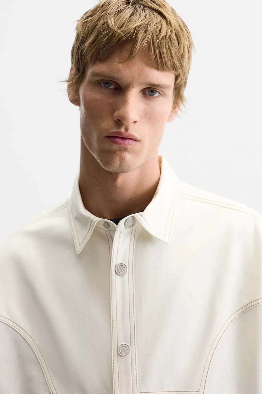 Camisa relaxed fit confeccionada en tejido de algodón y lyocell. Cuello solapa y manga corta. Pespuntes combinados a contraste en toda la prenda. Detalle de anilla metálica en espalda. Cierre frontal con botones a presión.