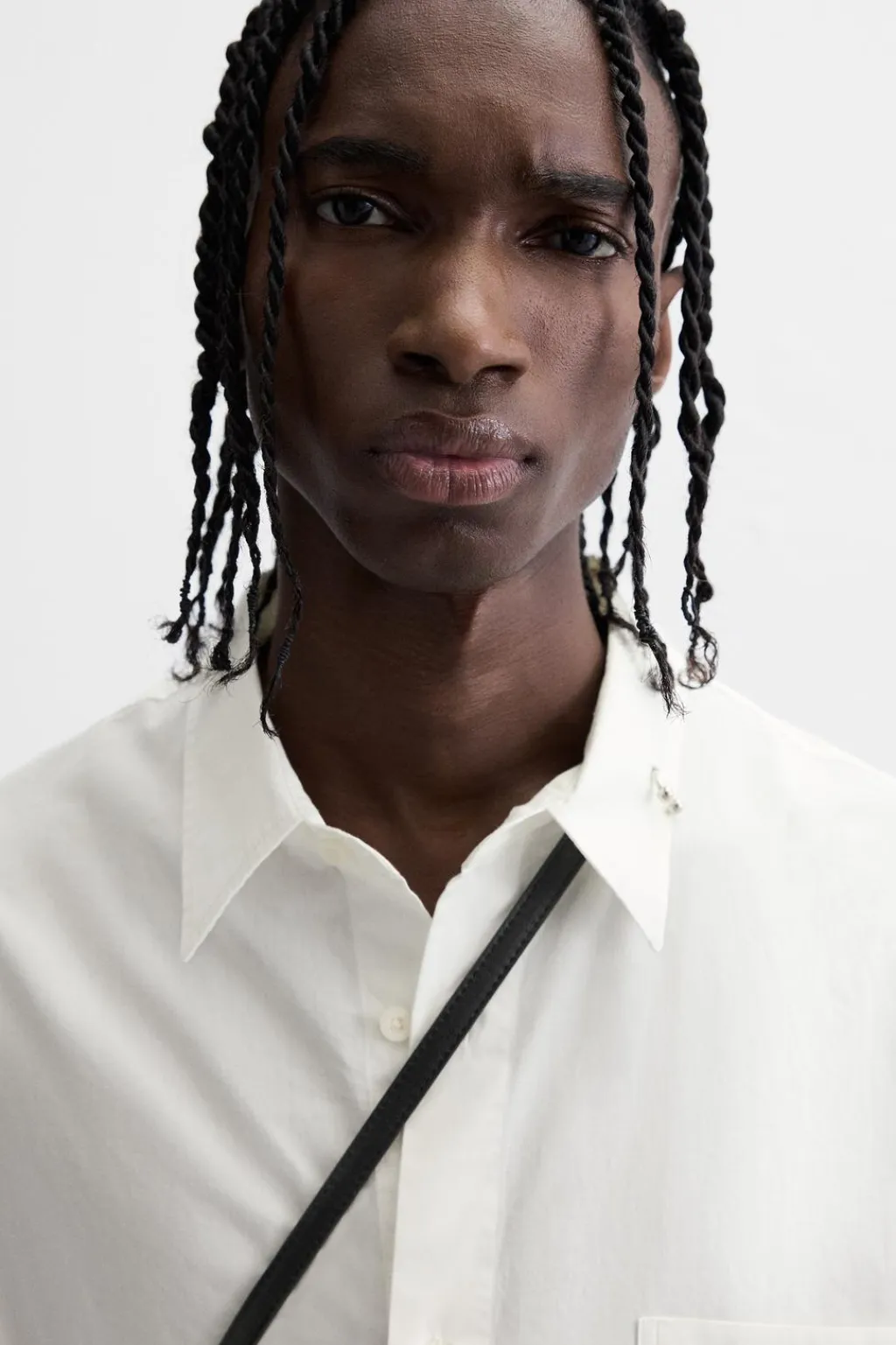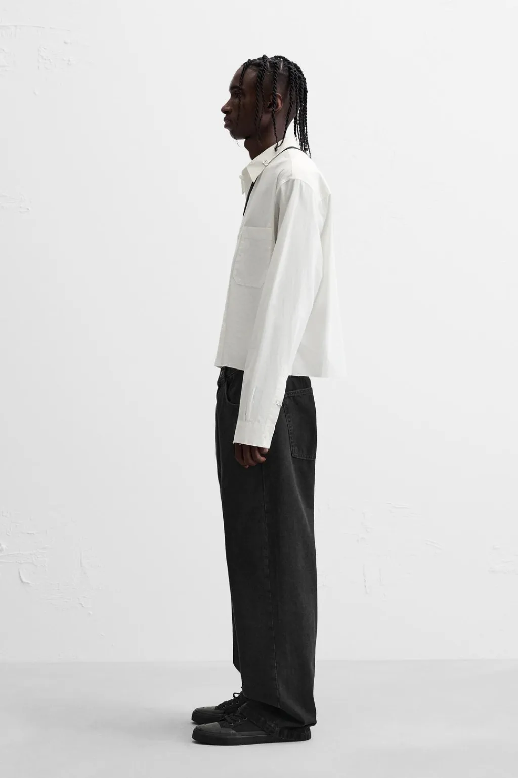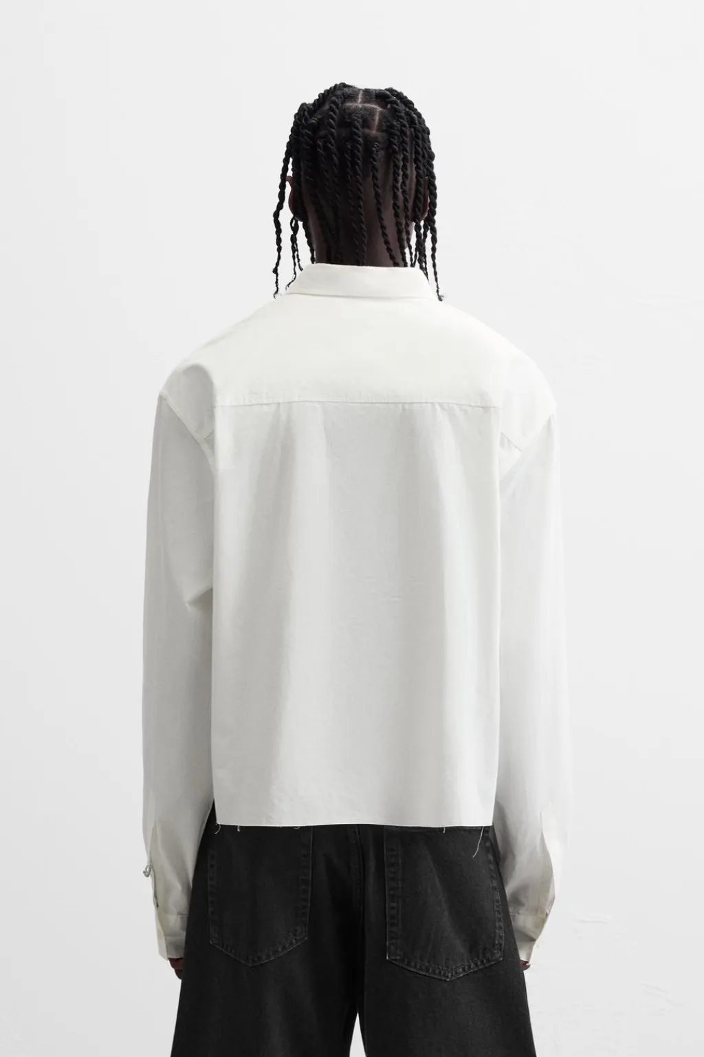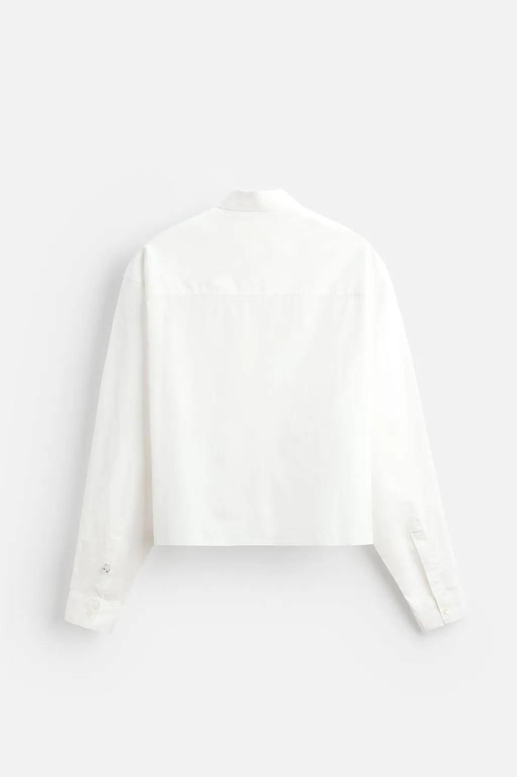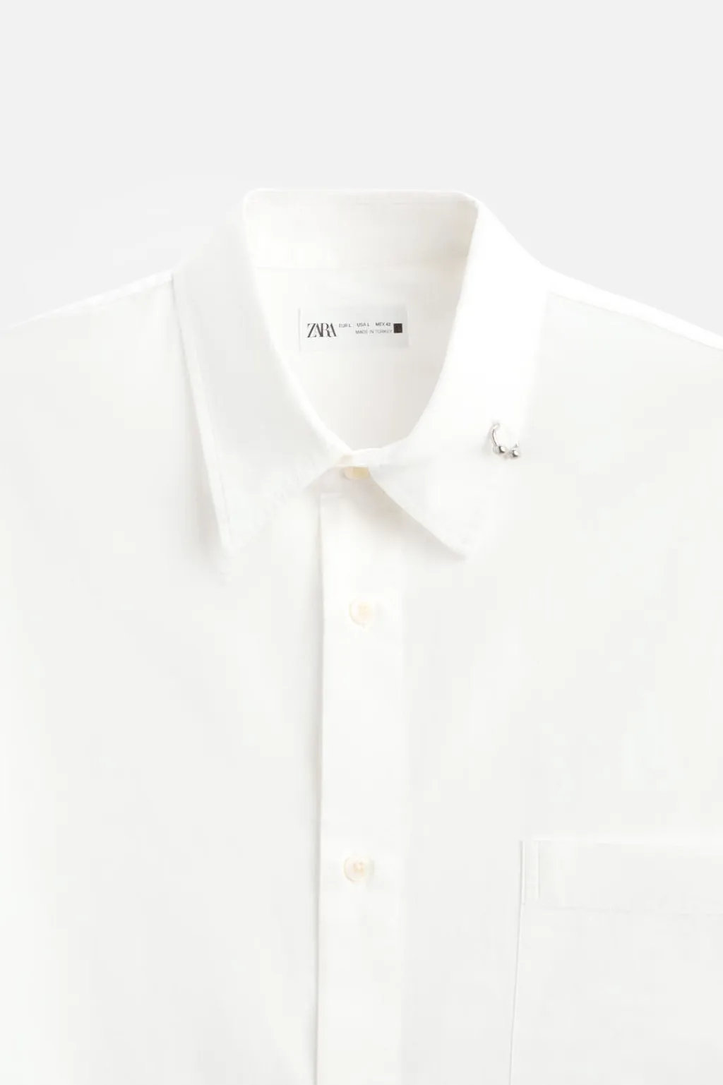 Camisa cropped fit. Cuello solapa con detalle de aplicación metálica con forma de piercing. Manga larga acabada en puño con botón. Bolsillo plastrón en pecho. Cierre frontal de botonadura.