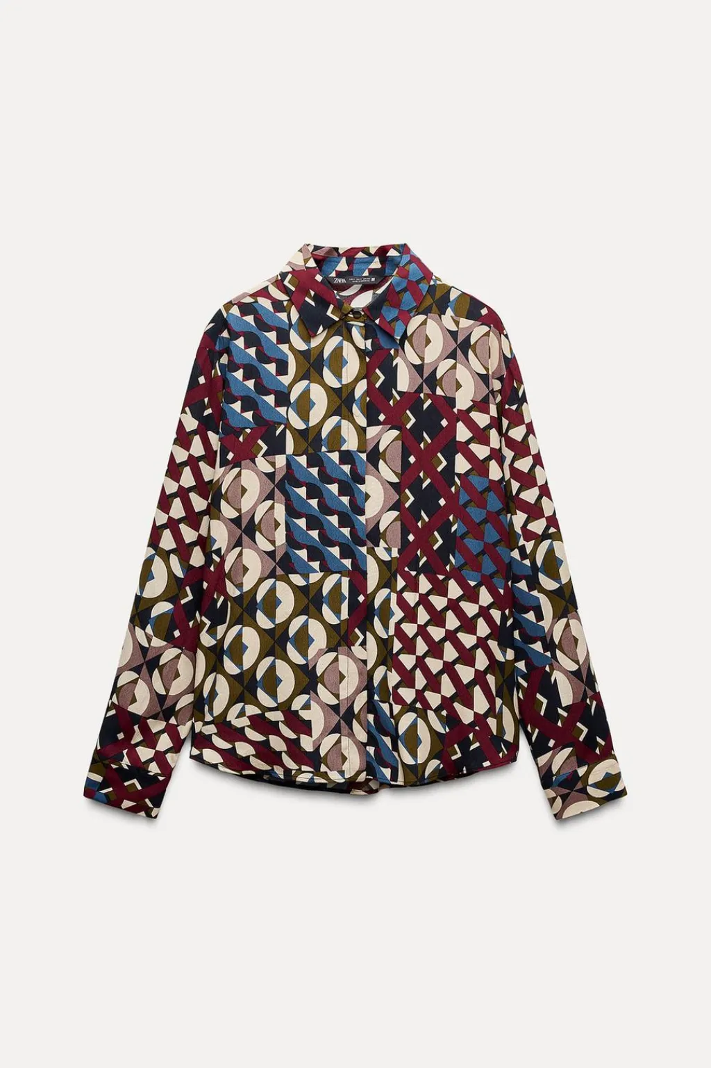 Camisa de cuello solapa y manga larga. Cierre frontal con botones ocultos por solapa.