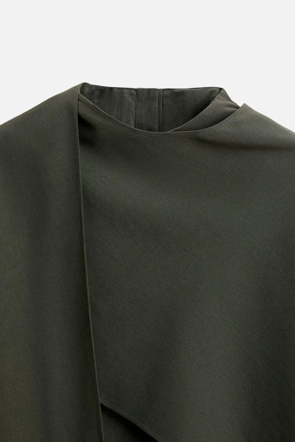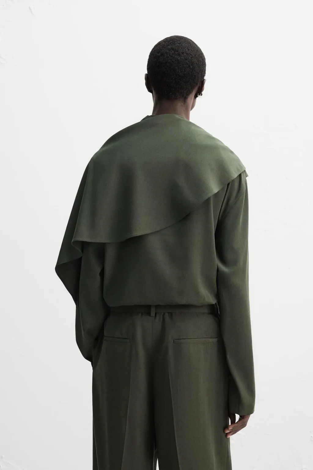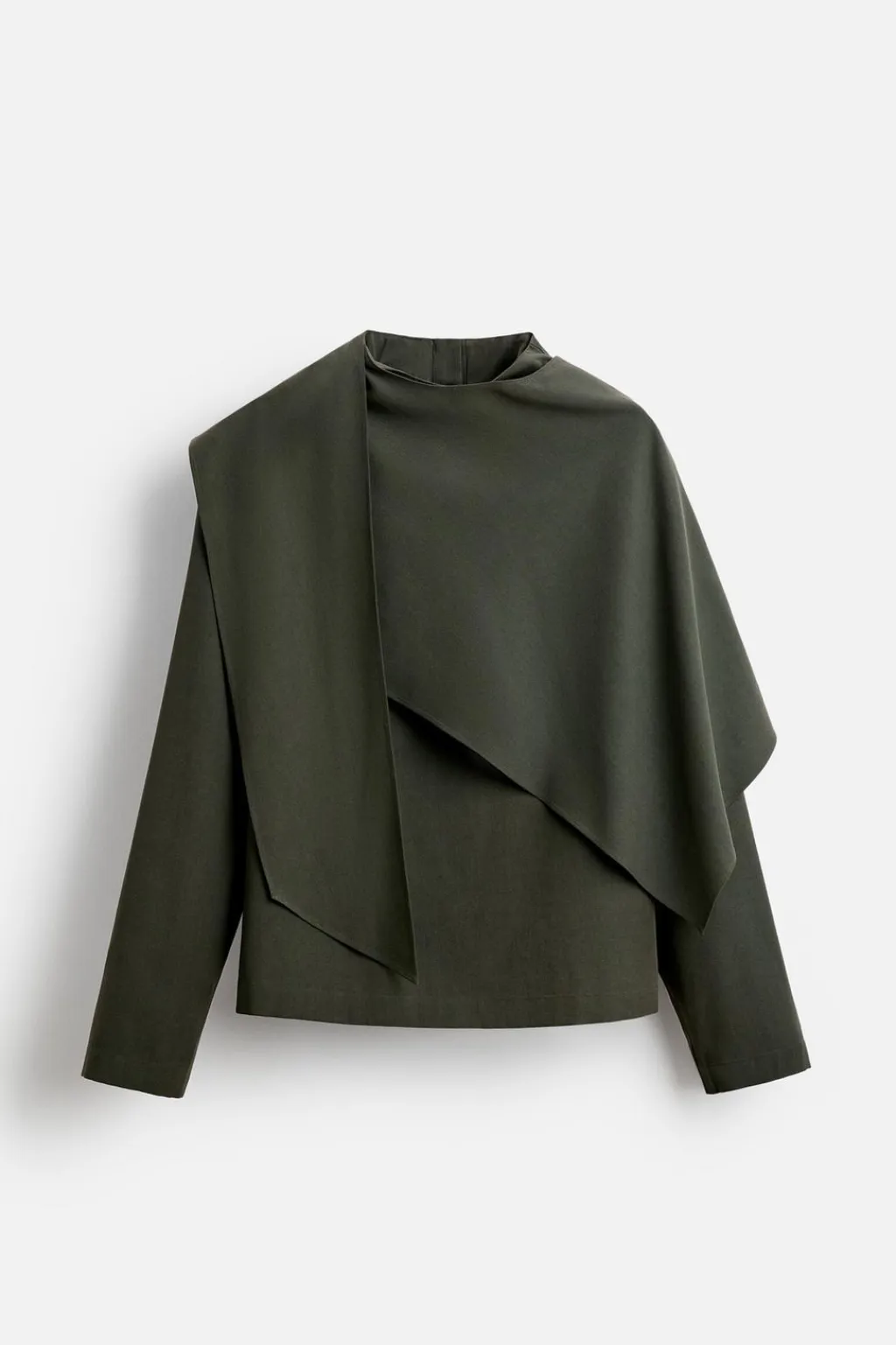 Camisa relaxed fit confeccionada en tejido fluido con mezcla de lyocell y algodón. Cuello subido con cierre de botonadura en espalda. Detalle de foulard multiposición en el mismo tejido. Manga larga.