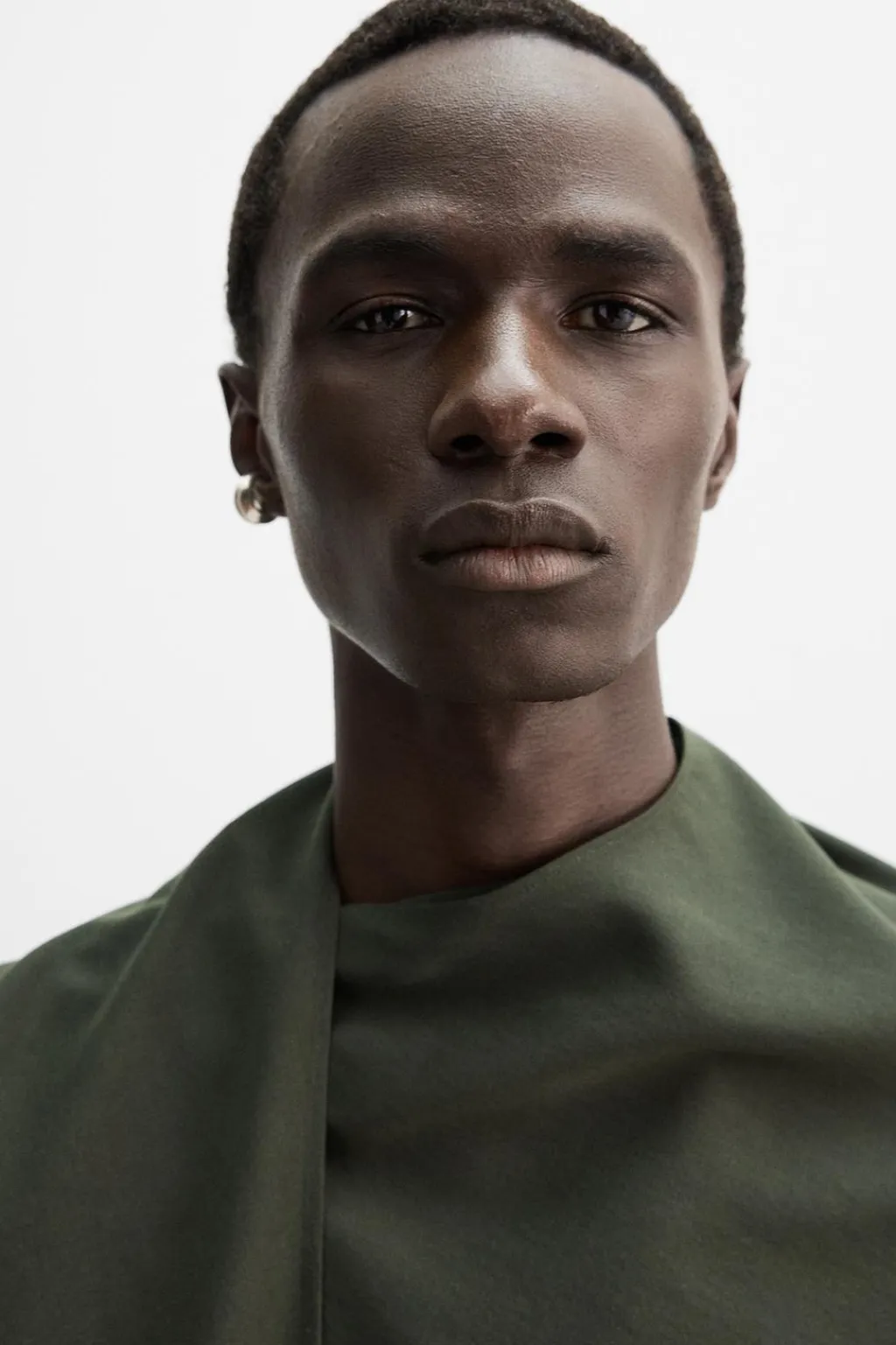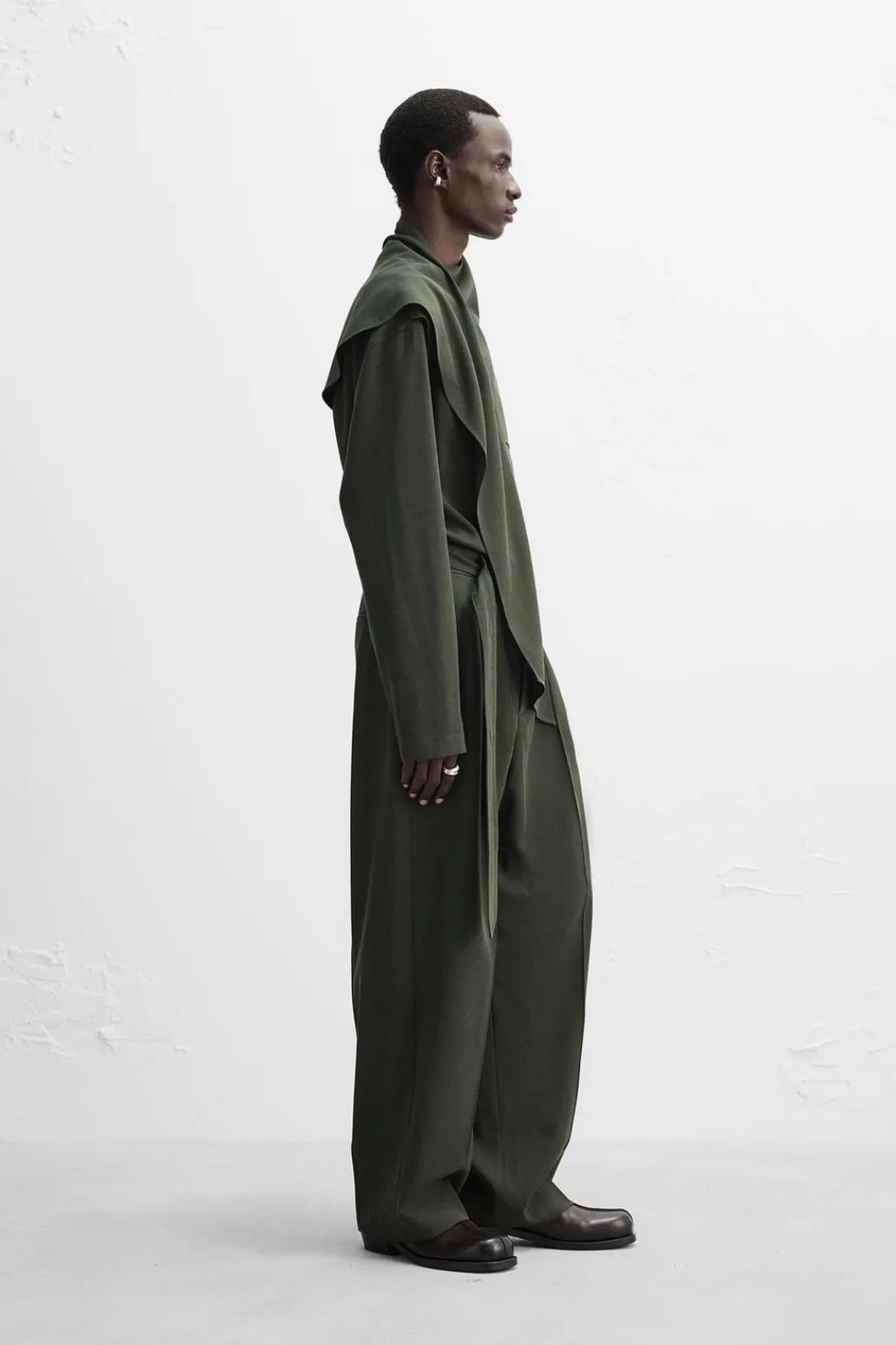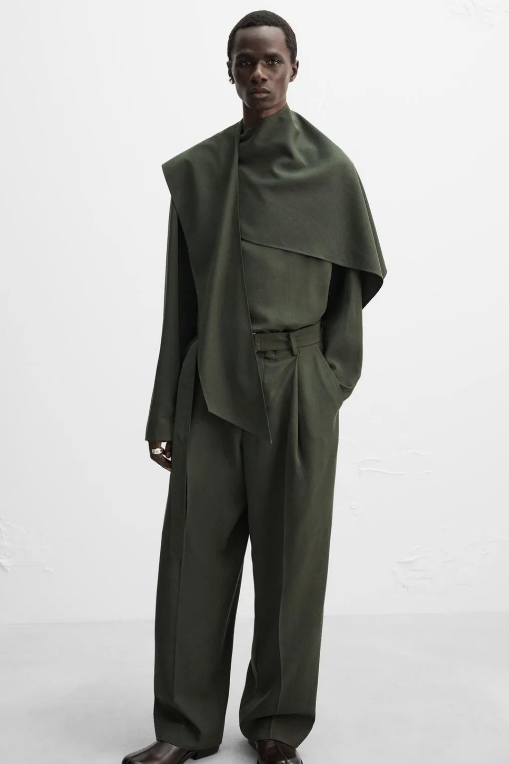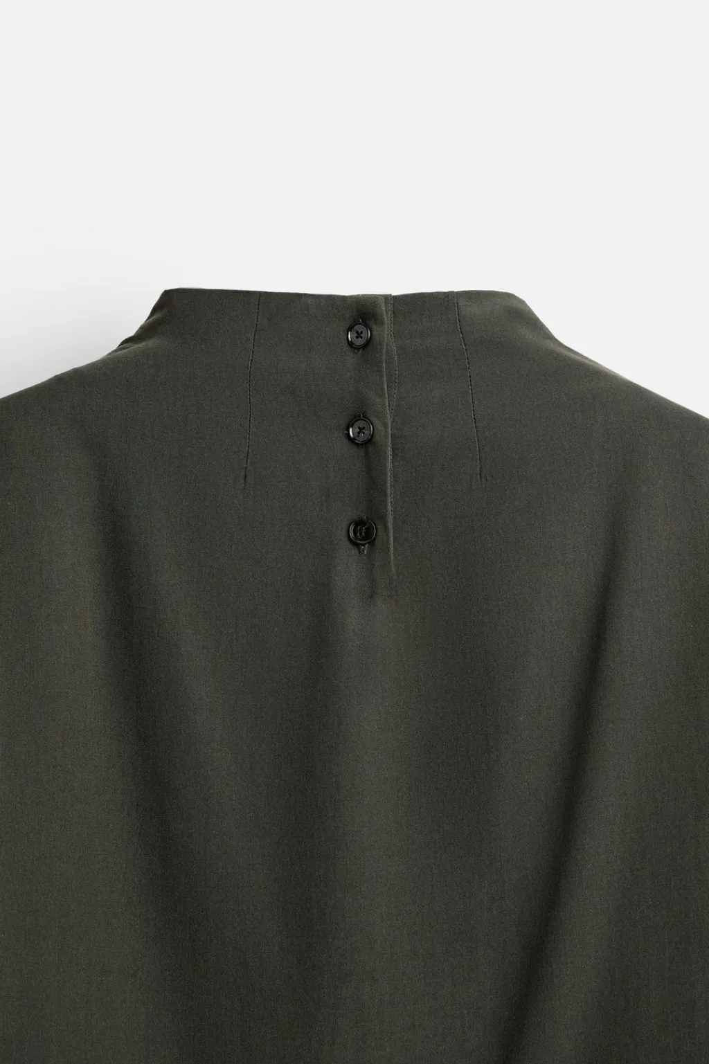 Camisa relaxed fit confeccionada en tejido fluido con mezcla de lyocell y algodón. Cuello subido con cierre de botonadura en espalda. Detalle de foulard multiposición en el mismo tejido. Manga larga.