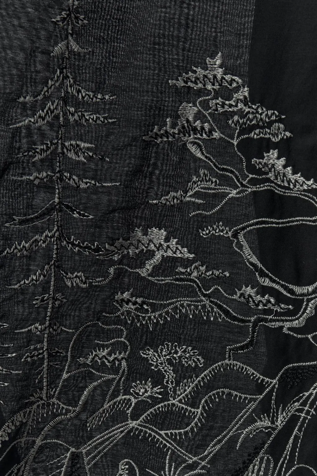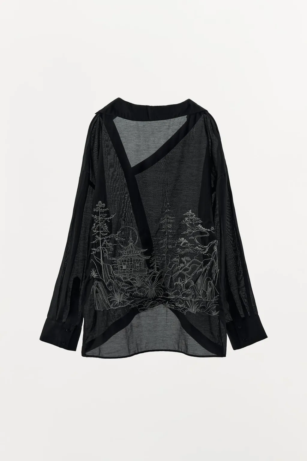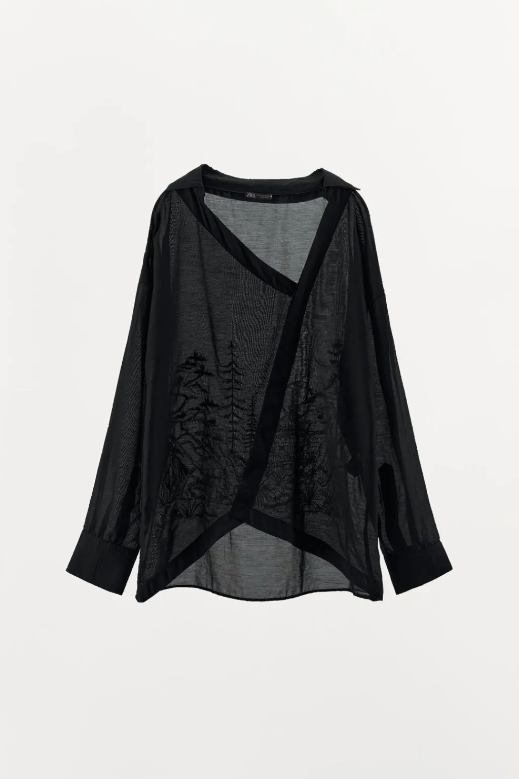 Camisa oversize semitransparente confeccionada en mezcla de viscosa. Cuello solapa con escote pico cruzado. Manga larga con hombro caído acabada en puño. Bordado en espalda combinado a contraste. Bajo asimétrico. Cierre frontal con botones ocultos por sopata.