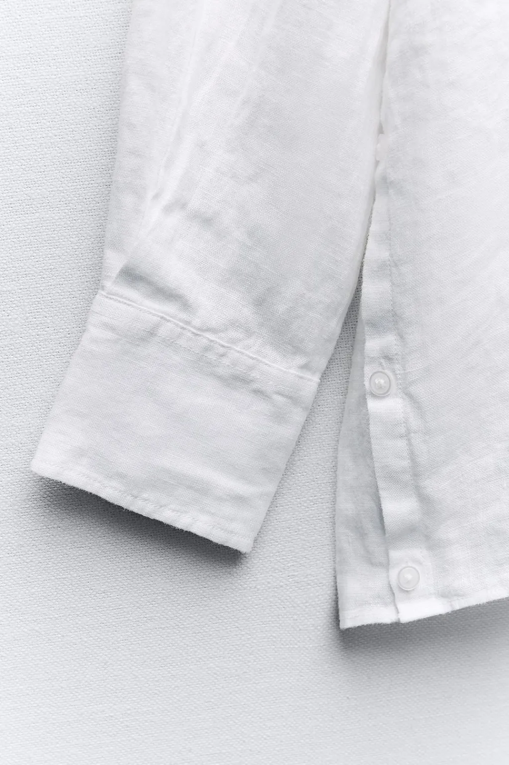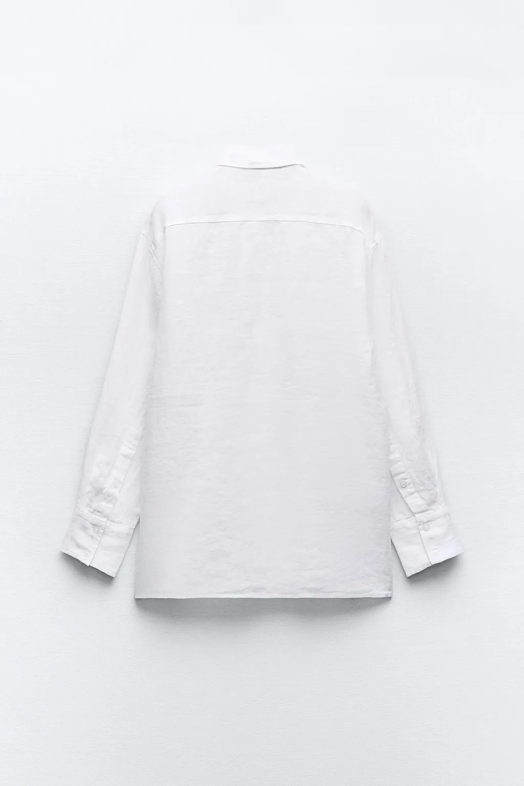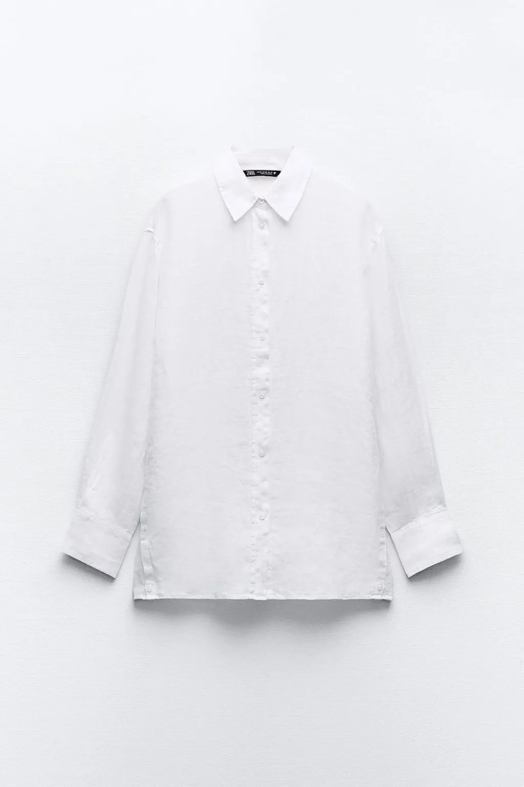 Camisa oversize confeccionada con lino. Cuello solapa y manga larga acabada en puño. Detalle de aberturas laterales con botones. Cierre frontal con botones.