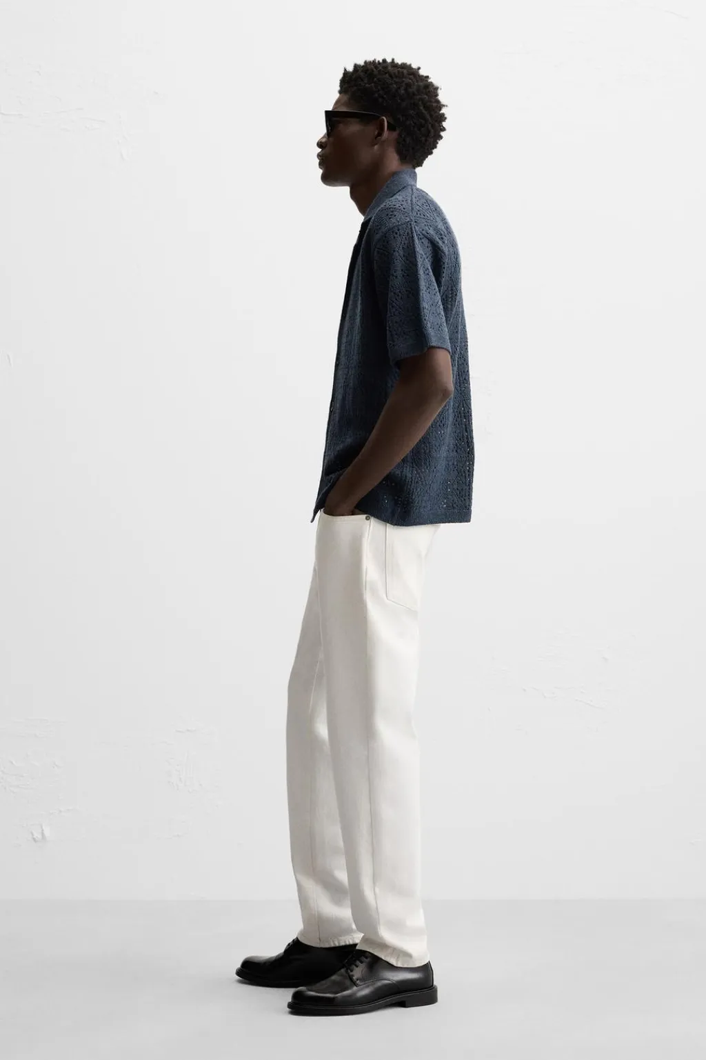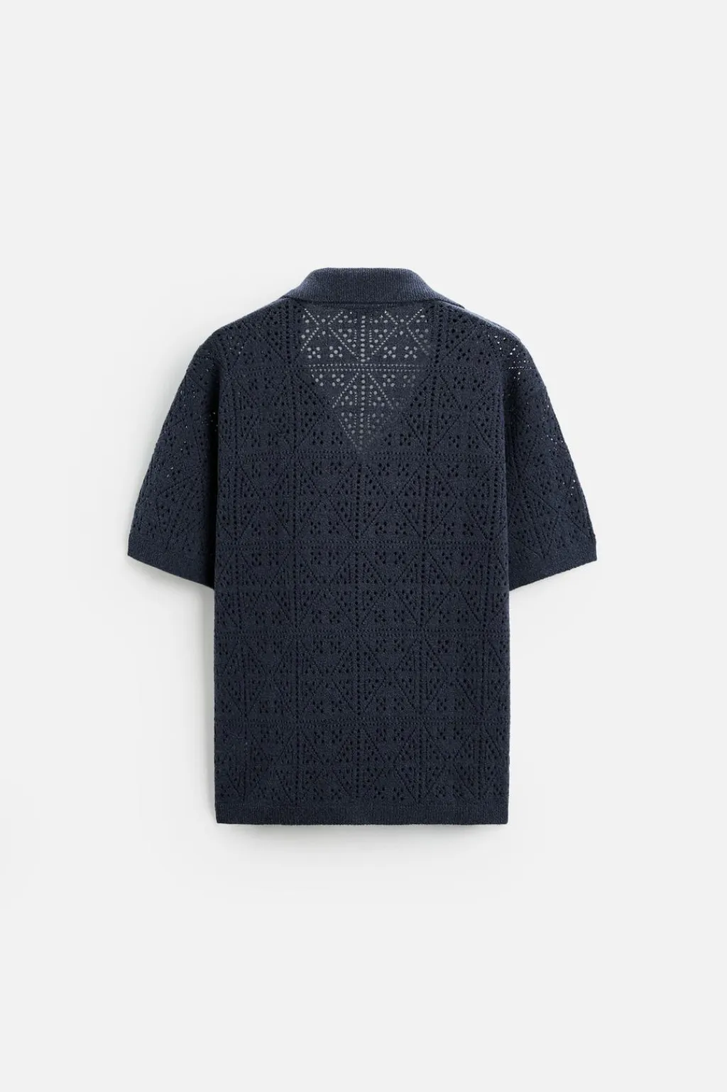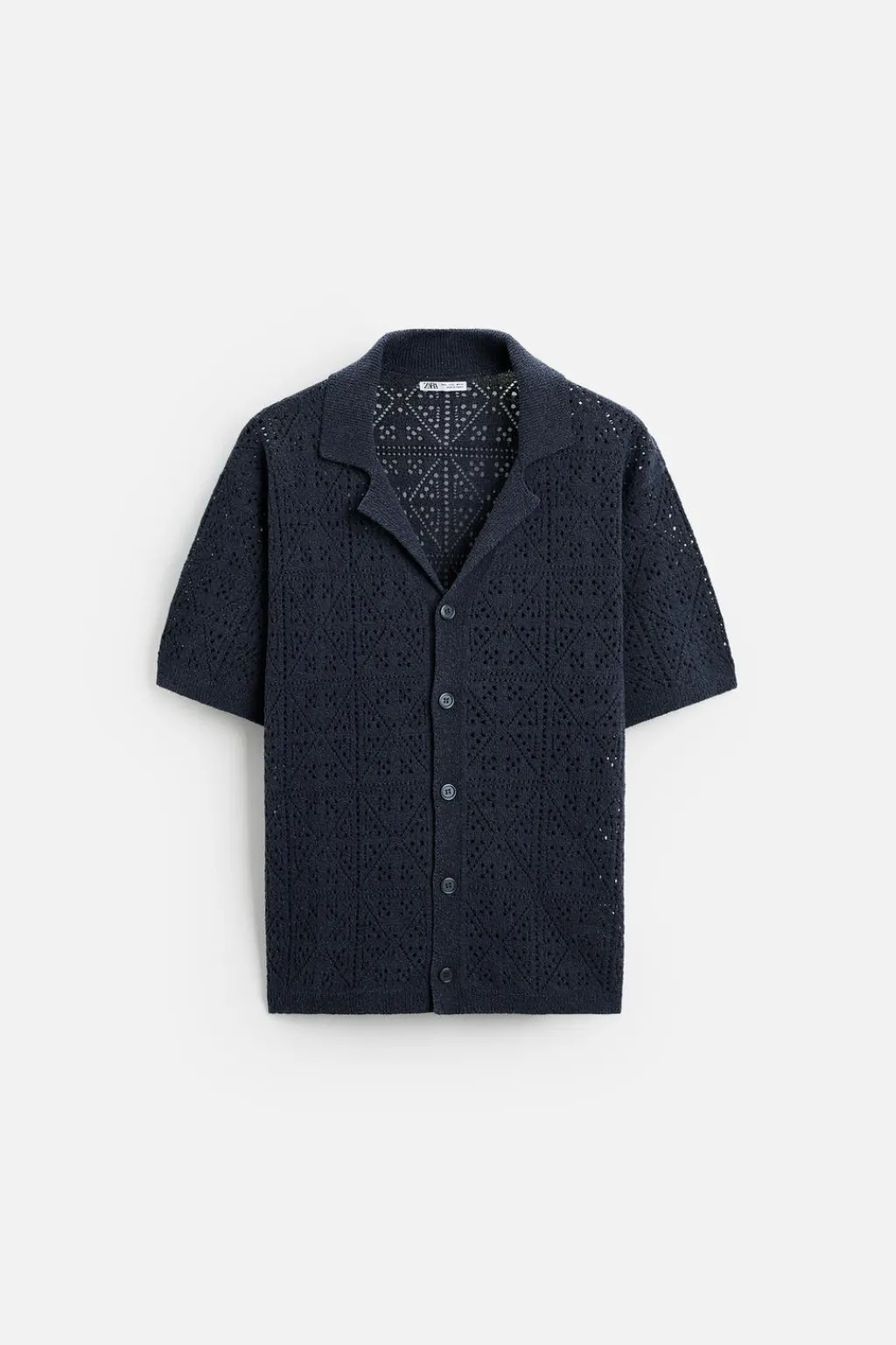 Camisa relaxed fit tejida en hilatura con algodón con estructura abierta. Cuello bowling y manga corta. Cierre frontal de botonadura.
