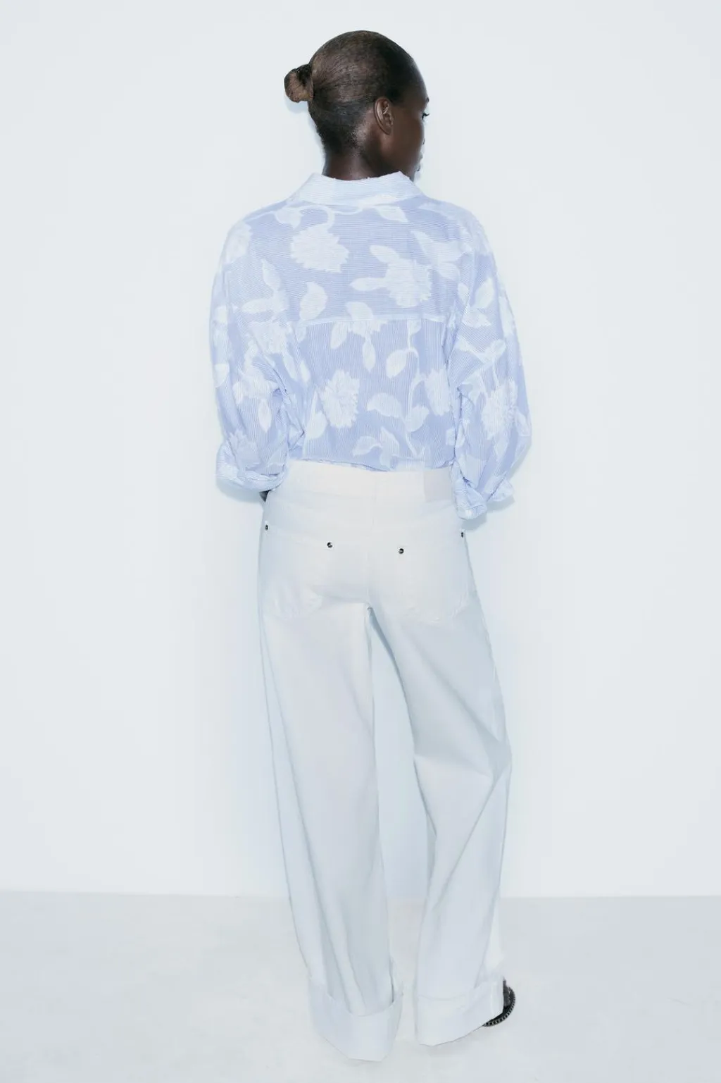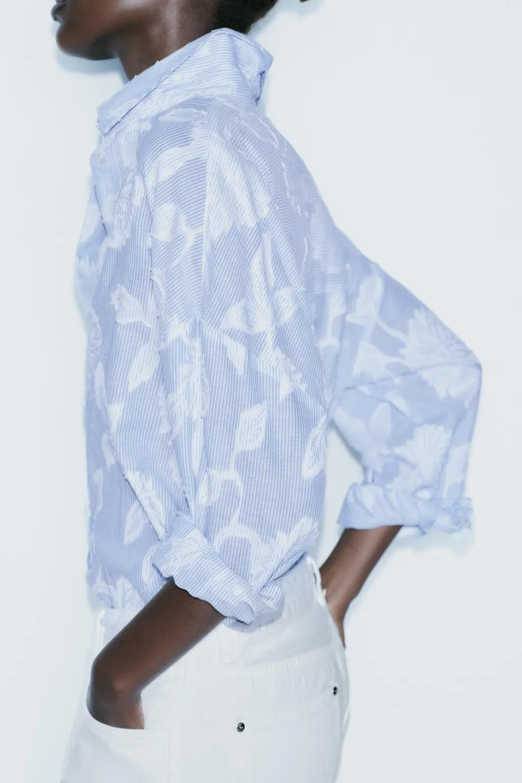 Camisa de cuello solapa y manga larga acabada en puño con hombro caído. Cierre frontal con botones.