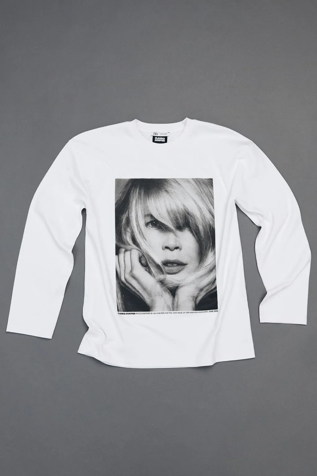 Camiseta confeccionada en hilatura de algodón 100%. Cuello redondo y manga larga. Detalle de estampación fotográfica Claudia Schiffer (Photo by Jan Welters Licensed by Trunk Archive) en delantero.