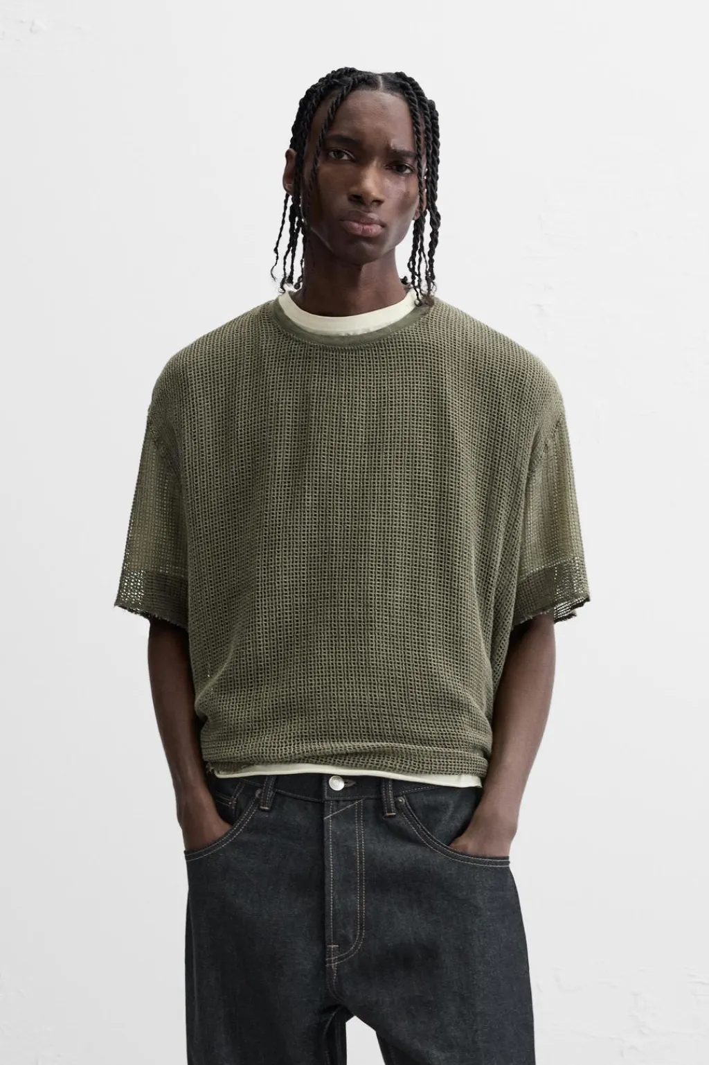 Camiseta relaxed fit confeccionada en tejido con estructura abierta. Incluye camiseta interior. Cuello redondo y manga corta. Acabados irregulares.