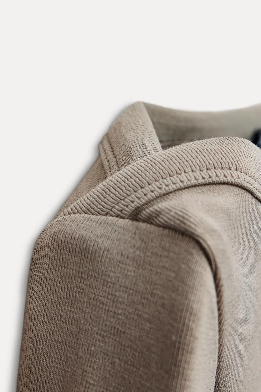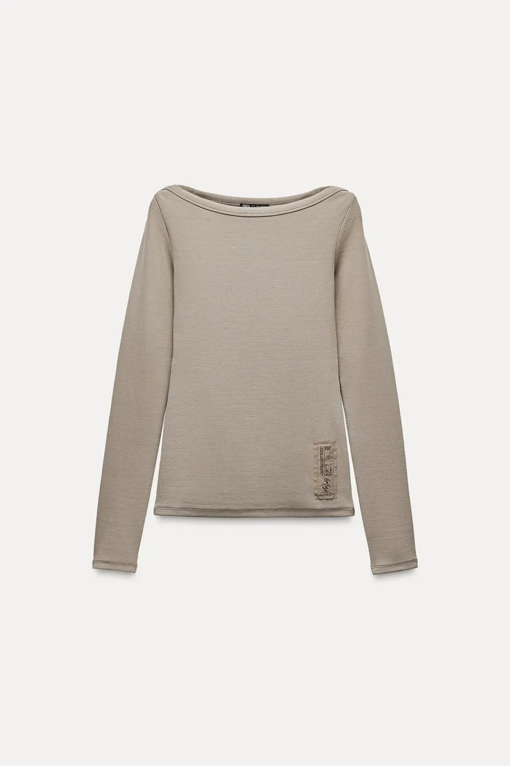Camiseta confeccionada en hilatura con mezcla de algodón. Cuello barco y manga larga. Detalle de etiqueta en delantero a tono.