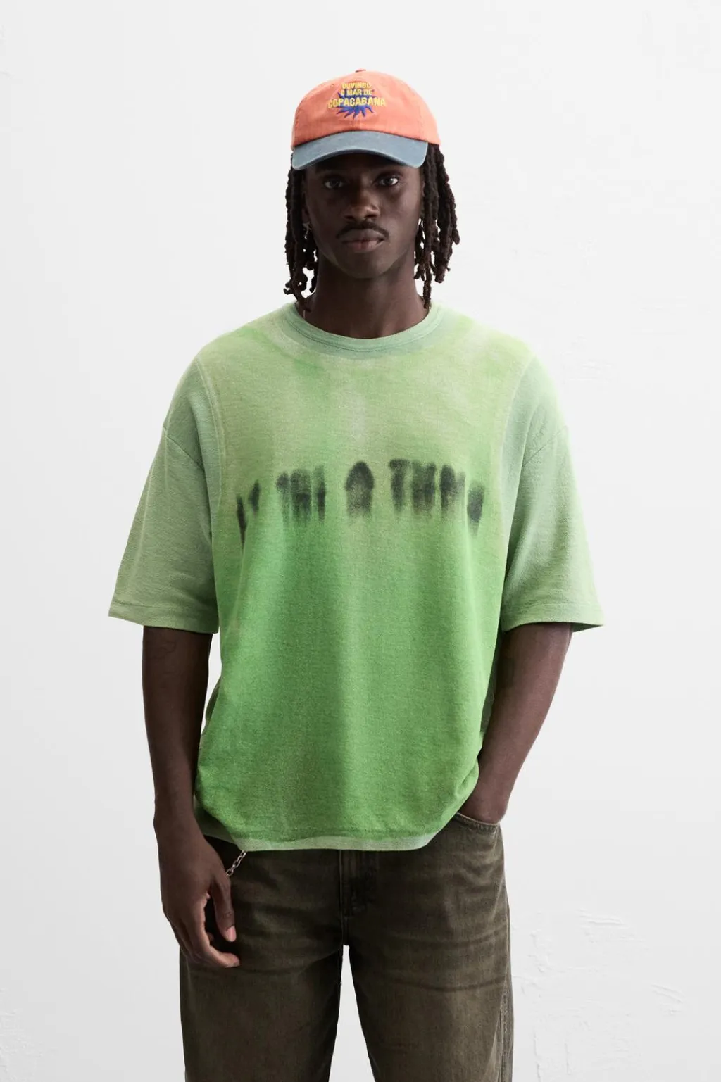 Camiseta relaxed fit tejida en hilatura de algodón. Cuello redondo y manga corta. Efecto lavado. Estampado efecto camiseta con texto combinado a contraste en delantero.
