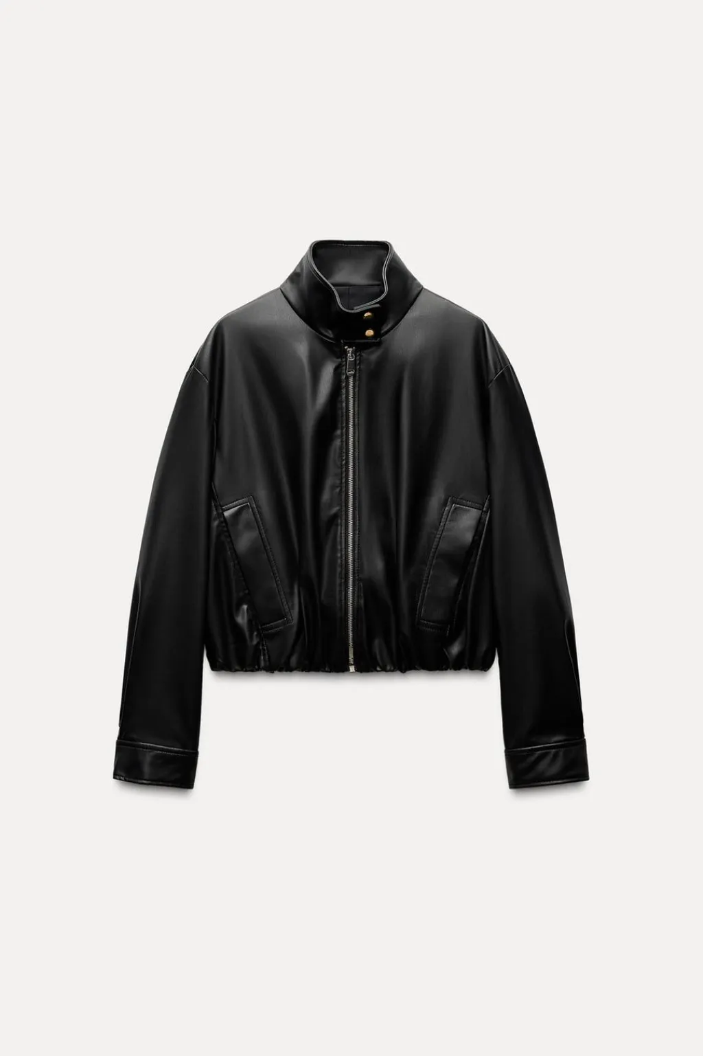 Cazadora de cuello subido y manga larga. Bolsillos delanteros de vivo. Bajo acabado en elástico. Cierre frontal con cremallera y botones a presión.